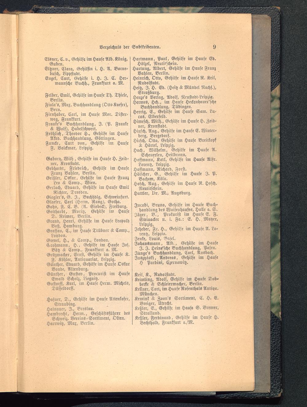 Richter, Dresden .Giegler's, G. I., Buchhdlg, Schweinfurt .Glaeser, Carl <Herm. Rang), Gotha .Gohn. F. C. B. (A. Siebeck), Freiburg .Gotthardt, Moritz, Gehilfe im Hanse