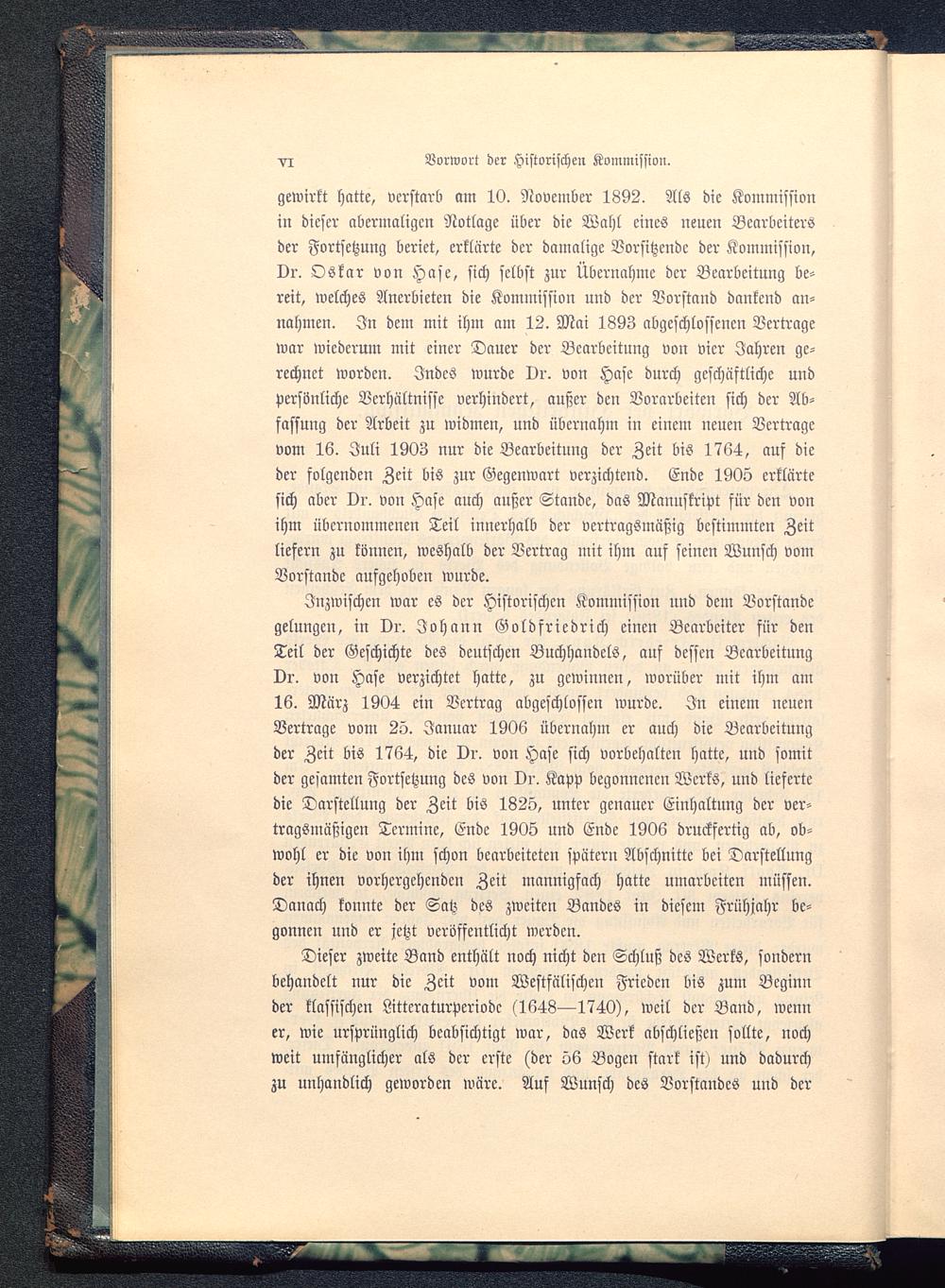Inzwischen war es der Historischen Kommission und dem Vorständegelungen, in Dr. Johann Goldfriedrich einen Bearbeiter für denTeil der Geschichte des deutschen Buchhandels, auf dessen BearbeitungDr. von Hase verzichtet hatte, zu gewinnen, worüber mit ihm am16. März 1904 ein Vertrag abgeschlossen wurde. In einem neuenVertrage vom 25. Januar 1906 übernahm er auch die Bearbeitungder Zeit bis 1764, die Dr. von Hase sich vorbehalten hatte, und somitder gesamten Fortsetzung des von Dr. Kapp begonnenen Werks, und liefertedie Darstellung der Zeit bis 1825, unter genauer Einhaltung der ver-tragsmäßigen Termine, Ende 1905 und Ende 1906 druckfertig ab, ob-wohl er die von ihm schon bearbeiteten spütern Abschnitte bei Darstellungder ihnen vorhergehenden Zeit mannigfach hatte umarbeiten müssen.Danach konnte der Satz des zweiten Bandes in diesem Frühjahr be-gonnen und er jetzt veröffentlicht werden.