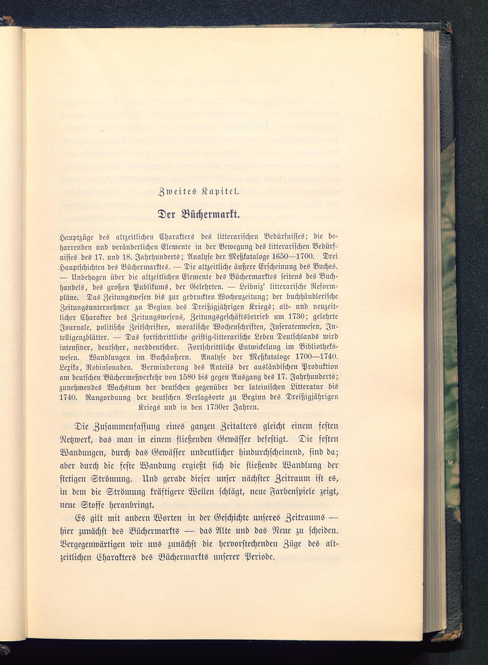 Hanptzügc des altzeitlichcn Charakters des litterarischcn Bedürfnisses; die be-harrenden und veränderlichen Elemente in der Bewegung des litterarischen Bedürf-nisscs des 17. und 18. Jahrhunderts; Analyse der Meßkataloge 1650—1700. DreiHauptschichten des Büchermarktes. — Die altzeitliche äußere Erscheinung des Bnches.— Unbehagen über die altzeitlichen Elemente des Büchermarktes seitens des Buch-handels, des großen Publikums, der Gelehrten. — Lcibniz' litterarische Reform-pläne. Das Zeitungswesen bis zur gedruckten Wochcnzeitung; der buchhändlcrischcZeitnngsunternehmer zu Beginn des Dreißigjährigen Kriegs; alt- und neuzeit-licher Charakter des Zcitungswesens, Zeitungsgcschäftsbetricb nm 1730; gelehrteJournale, politische Zeitschriften, moralische Wochenschriften, Jnseratenwesen, Jn-telligeuzblätter. — Das fortschrittliche geistig-litterarische Leben Deutschlands wirdiutensiver, deutscher, norddeutscher. Fortschrittliche Eutwickelung im Bibliotheks-wesen. Wandlungen im Bnchänßern. Analyse der Meßkatalogc 1700—1740.Lexika, Robinsonaden. Verminderung des Anteils der ausländischen Produktionam deutscheu Büchermcßverkehr von 1530 bis gegen Ausgang des 17. Jahrhunderts;zunehmendes Wachstum der deutschen gegenüber der lateinischen Litteratur bis1740. Rangordnung der deutschen Vcrlagsortc zu Beginn des DreißigjährigenKriegs und in den 1730er Jahren.