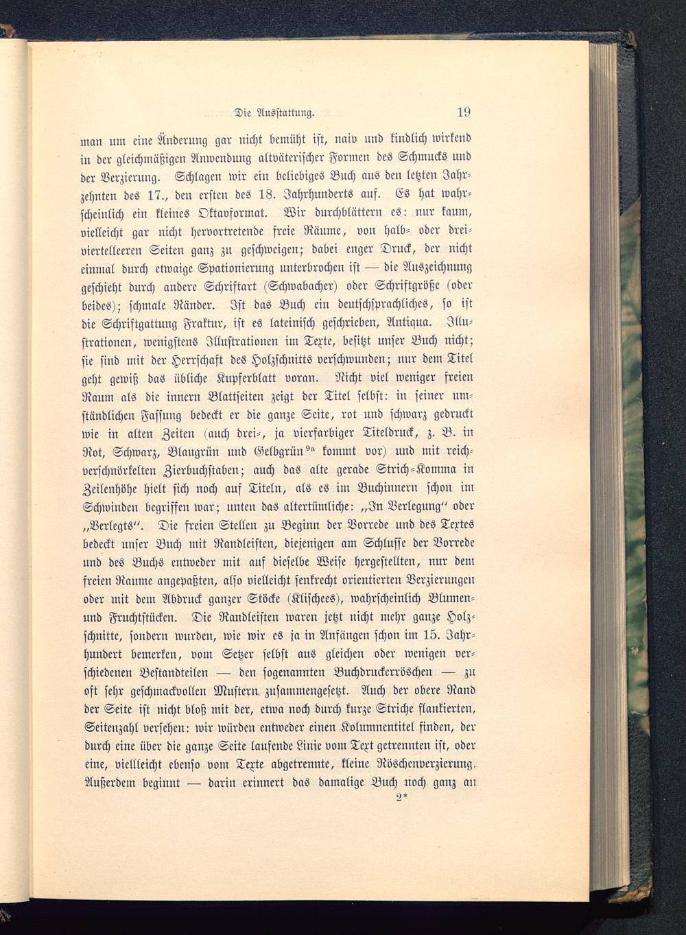 man um eine Änderung gar nicht bemüht ist, naiv und kindlich wirkendin der gleichmäßigen Anwendung altvaterischer Formen des Schmucks undder Verzierung. Schlagen wir ein beliebiges Buch aus den letzten Jahr-zehnten des 17., den ersten des 18. Jahrhunderts auf. Es hat wahr-scheinlich ein kleines Oktavsormat. Wir durchblättern es: nur kaum,vielleicht gar nicht hervortretende freie Räume, von halb- oder drei-vicrtelleeren Seiten ganz zu geschweige»; dabei enger Druck, der nichteinmal durch etwaige Spationierung unterbrochen ist — die Auszeichnunggeschieht durch andere Schriftart (Schwabacher) oder Schriftgroße (oderbeides); schmale Ränder. Ist das Buch ein deutschsprachliches, so istdie Schristgattung Fraktur, ist es lateinisch geschrieben, Antiqua. Illu-strationen, wenigstens Illustrationen im Texte, besitzt unser Buch nicht;sie sind mit der Herrschaft des Holzschnitts verschwunden; nur dem Titelgeht gewiß das übliche Kupferblatt voran. Nicht viel weniger freienRaum als die innern Blattseiten zeigt der Titel selbst: in seiner um-ständlichen Fassung bedeckt er die ganze Seite, rot und schwarz gedrucktwie in alten Zeiten «auch drei-, ja vierfarbiger Titeldruck, z. B. inRot, Schwarz, Blaugrün und Gelbgrün ^ kommt vor) und mit reich-verschnörkelten Zierbuchstaben; auch das alte gerade Strich-Komma inZeilenhöhe hielt sich noch auf Titeln, als es im Buchinnern schon imSchwinden begriffen war; unten das altertümliche: „In Verlegung" oder„Verlegts". Die freien Stellen zu Beginn der Vorrede und des Textesbedeckt unser Buch mit Randleisten, diejenigen am Schlüsse der Vorredeund des Buchs entweder mit auf dieselbe Weise hergestellten, nur demfreien Räume angepaßten, also vielleicht senkrecht orientierten Verzierungenoder mit dem Abdruck ganzer Stöcke (Klischees), wahrscheinlich Blumen-und Fruchtstücken. Die Randleisten waren jetzt nicht mehr ganze Holz-schnitte, sondern wurden, wie wir es ja in Anfängen schon im 15. Jahr-hundert bemerken, vom Setzer selbst aus gleichen oder wenigen ver-schiedenen Bestandteilen — den sogenannten Buchdruckerröschen — zuoft sehr geschmackvollen Mustern zusammengesetzt. Auch der obere Randder Seite ist nicht bloß mit der, etwa noch dnrch kurze Striche flankierten,Seitenzahl versehen: wir würden entweder einen Kolumnentitel finden, derdurch eine über die ganze Seite laufende Linie vom Text getrennten ist, odereine, vielleicht ebenso vom Texte abgetrennte, kleine Röschcnverzierung,Außerdem beginnt — darin erinnert das damalige Buch noch ganz an