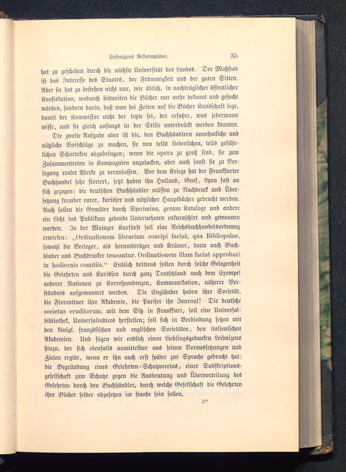Die zweite Aufgabe aber ist die, den Buchhändlern annehmliche undnützliche Vorschläge zu machen, sie von teils liederlichen, teils gefähr-lichen Scharteken abzubringen; wenn die oxsra zu groß sind, sie zumZusammentreten in Kompagnien anzulocken, aber auch sonst sie zu Ver-legung realer Werke zu veranlassen. Vor dem Kriege hat der Frankfurter Buchhandel sehr floriert, jetzt haben ihn Holland, Genf , Lyon fast ansich gezogen: die deutschen Buchhändler müssen zu Nachdruck und Über-setzung fremder rarer, kuriöser und nützlicher Hauptbücher gebracht werden.Auch sollen die Gemüter durch Spccimina, genaue Kataloge und andereein Licht ins Publikum gebende Unternehmen enkuraschirt und gewonnenwerden. Ja der Mainzer Kurfürst soll eine Reichsbuchhandelsordnungerwirken: „Oränmtionsrn lidrariain coneixi tÄciat, «Mli. Lidlionolae,sowohl die Verleger, als herumbträger und Krämer, dann auch Buch-binder und Buchdrucker tensantur. Oi-üiimtionew iUsm taemt, apxi odariin nockiei'nis comitiis." Endlich drittens sollen durch solche Gelegenheitdie Gelehrten und Kuriösen durch ganz Deutschland nach dem Exempelanderer Nationen zu Korrespondenzen, Kommunikation, näherer Ver-ständnis aufgemuntert werden. Die Engländer haben ihre Societüt,die Florentiner ihre Akademie, die Pariser ihr Journal! Die deutschesoeistas öi'mMoruill, mit dem Sitz in Frankfurt , soll eine Universal-bibliothek, Universalindices herstellen; soll sich in Verbindung setzen mitden königl. französischen und englischen Soeietäten, den italienischenAkademien. Und fügen wir endlich einen Lieblingsgedanken LeibnizenShinzu, der sich ebenfalls unmittelbar aus seinen Voraussetzungen undZielen ergibt, wenn er ihn auch erst später zur Sprache gebracht hat:die Begründung eines Gelehrten-Schutzvereins, einer Subskriptions-gesellschaft zum Schutze gegen die Ausbeutung und Übervorteilung desGelehrten durch den Buchhändler, durch welche Gesellschaft die Gelehrtenihre Bücher selber abzusetzen im stände sein sollen.