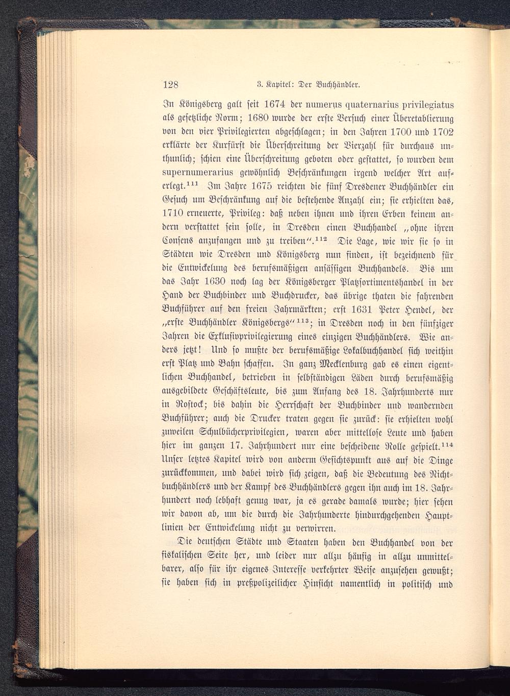 In Königsberg galt seit 1674 der numerus «inaterimiiuL vrivileFmtusals gesetzliche Norm; 1680 wurde der erste Versuch einer Übcretablicrungvon den vier Privilegierten abgeschlagen; in den Jahren 1700 und 1702erklärte der Kurfürst die Überschreitung der Bierzahl für durchaus un-tunlich; schien eine Überschreitung geboten oder gestattet, so wurden dein8up6i'immörariu8 gewöhnlich Beschränkungen irgend welcher Art auf-erlegt.^" Im Jahre 1675 reichten die fünf Dresdener Buchhändler einGesuch um Beschränkung auf die bestehende Anzahl ein; sie erhielten das,1710 erneuerte, Privileg: daß neben ihnen und ihren Erben keinem an-dern »erstattet sein solle, in Dresden einen Buchhandel „ohne ihrenConscns anzufangen und zu treiben".^ Die Lage, wie wir sie so inStädten wie Dresden und Königsberg nun finden, ist bezeichnend fürdie EntWickelung des berufsmüßigen ansässigen Buchhandels. Bis umdas Jahr 1630 noch lag der Königsbcrger Platzsortimentshandel in derHand der Buchbinder und Buchdrucker, das übrige thatcn die fahrendenBuchführer auf den freien Jahrmärkten; erst 1631 Peter Hendel, der„erste Buchhändler Königsbergs"^; ^ Dresden noch in den fünfzigerJahren die Erklusivprivilcgierung eines einzigen Buchhändlers. Wie an-ders jetzt! Und so mußte der berufsmäßige Lokalbuchhandel sich weithinerst Platz und Bahn schaffen. In ganz Mecklenburg gab es einen eigent-lichen Buchhandel, betrieben in selbständigen Läden durch berufsmäßigausgebildete Geschäftsleute, bis zum Anfang des 18. Jahrhunderts nurin Rostock; bis dahin die Herrschaft der Buchbinder und wanderndenBuchführer; auch die Drucker traten gegen sie zurück: sie erhielten wohlzuweilen Schulbüchcrprivilegicn, waren aber mittellose Leute und habenhier im ganzen 17. Jahrhundert nur eine bescheidene Rolle gespielt.Unser letztes Kapitel wird von anderm Gesichtspunkt aus auf die Dingezurückkommen, und dabei wird sich zeigen, daß die Bedeutung des Nicht-buchhändlcrs und der Kampf des Buchhändlers gegen ihn auch im 18. Jahr-hundert noch lebhaft genug war, ja es gerade damals wurde; hier sehenwir davon ab, um die durch die Jahrhundertc hindurchgehenden Haupt-linicn der Entwicklung nicht zu verwirren.