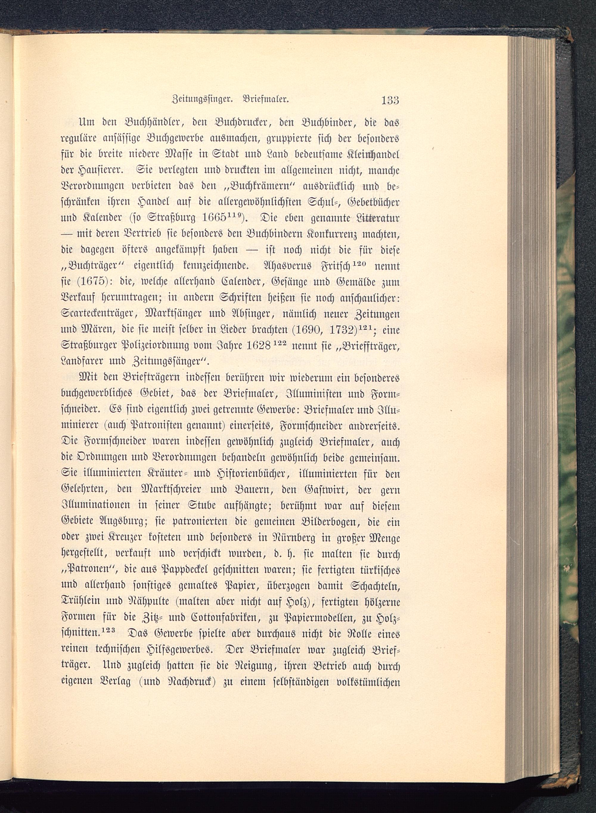Um den Buchhändler, den Buchdrucker, den Buchbinder, die dasreguläre ansässige Buchgewerbe ausmachen, gruppierte sich der besondersfür die breite niedere Masse in Stadt und Land bedeutsame Kleinhandelder Hausierer. Sie verlegten und druckten im allgemeinen nicht, mancheVerordnungen verbieten das den „Buchkrämern" ausdrücklich und be-schränken ihren Handel auf die allergewohulichstcn Schul-, Gebetbücherund Kalender (so Straßburg 1665"^). Die eben genannte Litteratur— mit deren Vertrieb sie besonders den Bnchbindern Konkurrenz machten,die dagegen öfters angekämpft haben — ist noch nicht die für diese„Buchträgcr" eigentlich kennzeichnende. Ahasverus Fritsch^" nenntsie (1675): die, welche allerhand Calender, Gesänge und Gemälde zumVerkauf herumtragen; in andern Schriften heißen sie noch anschaulicher:Scartcckcntrügcr, Marktsänger und Absinger, nämlich neuer Zeitungenund Mären, die sie meist selber in Lieder brachten (1690, 1732)^; eineStraßburger Polizciordnung vom Jahre 1628 ^ nennt sie „Brieffträger,Landfarer und Zcitungssänger".
