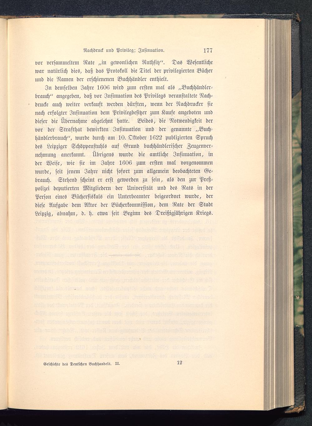 In demselben Jahre 1606 wird zum ersten mal als „Buchhändler-brauch" angegeben, daß vor Insinuation des Privilegs veranstaltete Nach-drucke auch weiter verkauft werden dürften, wenn der Nachdrucker sienach erfolgter Insinuation dem Privilegbesitzcr zum Kaufe angeboten unddieser die Übernahme abgelehnt hatte. Beides, die Notwendigkeit dervor der Strasthat bewirkten Insinuation und der genannte „Buch-händlcrbrauch", wurde durch am 10. Oktober 1622 publizierten Spruchdes Leipziger Schöppenstuhls auf Grund buchhändlcrischer Zeugenver-nehmung anerkannt. Übrigens wurde die amtliche Insinuation, inder Weise, wie sie im Jahre 1606 zum ersten mal vorgenommenwurde, seit jenem Jahre nicht sofort zum allgemein beobachteten Ge-brauch. Stehend scheint er erst geworden zu sein, als den zur Preß-polizei deputierten Mitgliedern der Universität und des Rats in derPerson eines Büchcrfiskals ein Unterbeamter beigeordnet wurde, derdiese Aufgabe dem Aktor der Bücherkommission, dem Rate der StadtLeipzig , abnahm, d. h. etwa seit Beginn des Dreißigjährigen Kriegs.