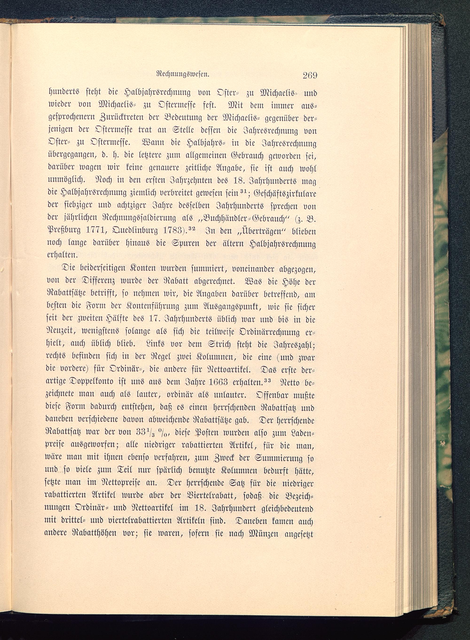 Hunderts steht die Halbjahrsrechnung von Oster- zu Michaelis^ undwieder von Michaelis- zu Ostermesse fest. Mit dem immer aus-gesprochenem Zurücktreten der Bedeutung der Michaelis- gegenüber der-jenigen der Ostcrincsse trat an Stelle dessen die Jahresrcchnung vonOstcr- zu Ostermcsse. Wann die Halbjahrs- in die Jahresrcchnungübergegangen, d. h. die letztere zum allgemeinen Gebrauch geworden sei,darüber wagen wir keine genauere zeitliche Angabe, sie ist auch Wohlunmöglich. Noch in den ersten Jahrzehnten des 18. Jahrhunderts magdie Halbjahrsrcchnung ziemlich verbreitet gewesen sein"; Gcschäftszirkularcder siebziger und achtziger Jahre desselben Jahrhunderts sprechen vonder jährlichen Ncchnungssaldierung als „Buchhändler-Gebrauch" (z. B.Prcßbnrg 1771, Quedlinburg 1783).^ In den „Übertrügen" bliebennoch lange darüber hinaus die Spuren der altern Halbjahrsrechnungerhalten.