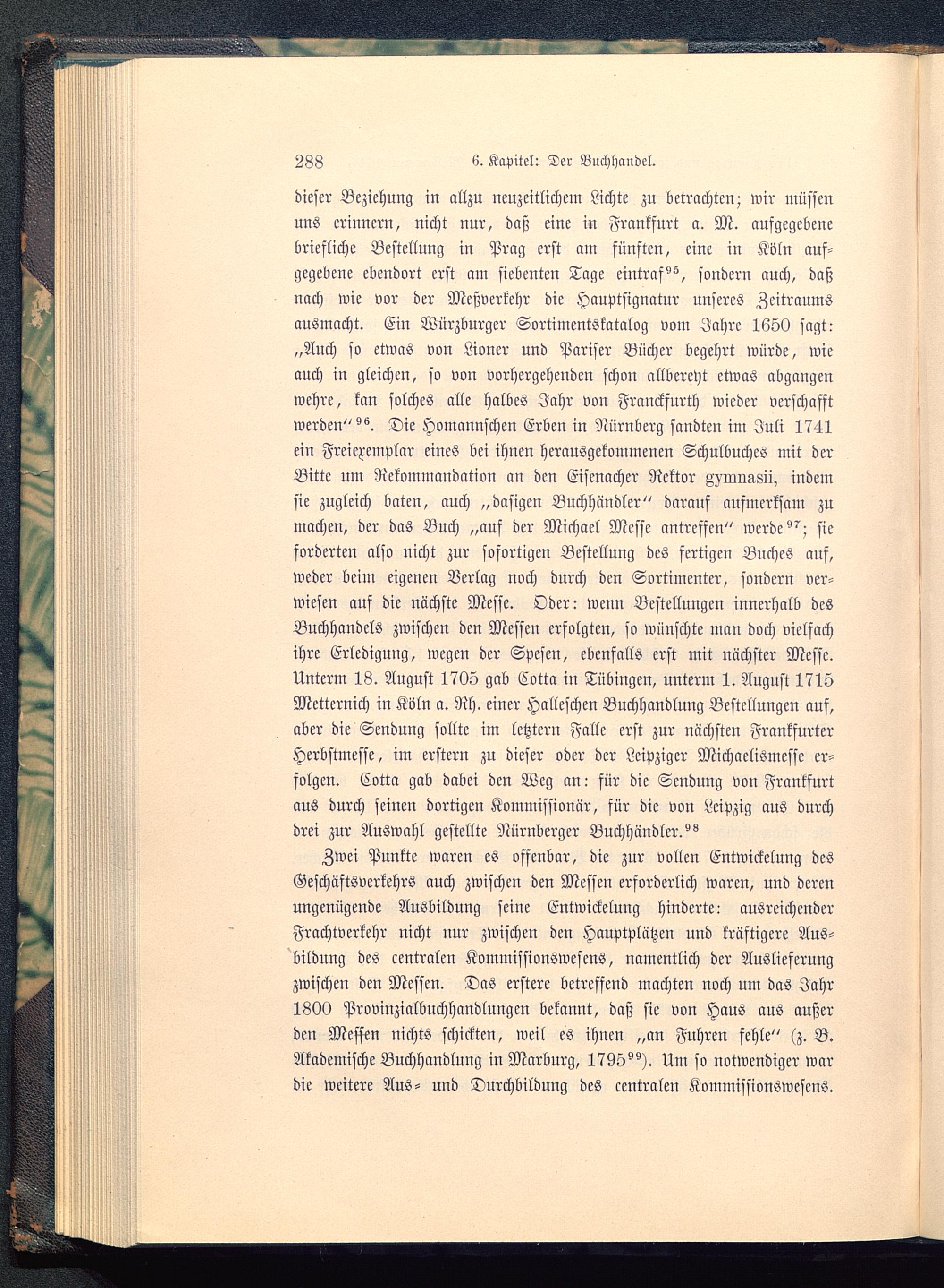 dieser Beziehung in allzu neuzeitlichem Lichte zu betrachten; wir müssenuns erinnern, nicht nur, daß eine in Frankfurt a. M. aufgcgcbeuebriefliche Bestellung in Prag erst am fünften, eine in Köln auf-gegebene ebendort erst am siebenten Tage eintraft, sondern auch, daßnach wie vor der Mcßverkehr die Hauptsignatur unseres Zeitraumsausmacht. Ein Würzburger Sortimcntskatalog vom Jahre 1650 sagt:„Auch so etwas von Lioncr und Pariser Bücher begehrt würde, wieauch in gleichen, so von vorhergehenden schon allbcreyt etwas abgangenwehre, kan solches alle halbes Jahr von Franckfurth wieder verschafftwerden" Die Homannschcn Erben in Nürnberg sandten im Juli 1741ein Freiexemplar eines bei ihnen herausgekommenen Schulbuches mit derBitte um Rckommandation an den Eiscnachcr Rektor Aviunasii, indemsie zugleich baten, auch „dasigen Buchhändler" darauf aufmerksam zumachen, der das Buch „auf der Michael Messe antreffen" werde sieforderten also nicht zur sofortigen Bestellung des fertigen Buches auf,weder beim eigenen Verlag noch durch den Sortimenter, sondern ver-wiesen auf die nächste Messe. Oder: wenn Bestellungen innerhalb desBuchhandels zwischen den Messen erfolgten, so wünschte man doch vielfachihre Erledigung, wegen der Spesen, ebenfalls erst mit nächster Messe.Unterm 18. August 1705 gab Cotta in Tübingen , unterm 1. August 1715Metternich in Köln a. Rh. einer Halleschen Buchhandlung Bestellungen auf,aber die Sendung sollte im letztern Falle erst zur nächsten Frankfurter Herbstmesse, im erstern zu dieser oder der Leipziger Michaclismessc er-folgen. Eotta gab dabei den Weg an: für die Sendung von Frankfurt aus durch seinen dortigen Kommissionär, für die von Leipzig aus durchdrei zur Auswahl gestellte Nürnberger Buchhäudlcr.^