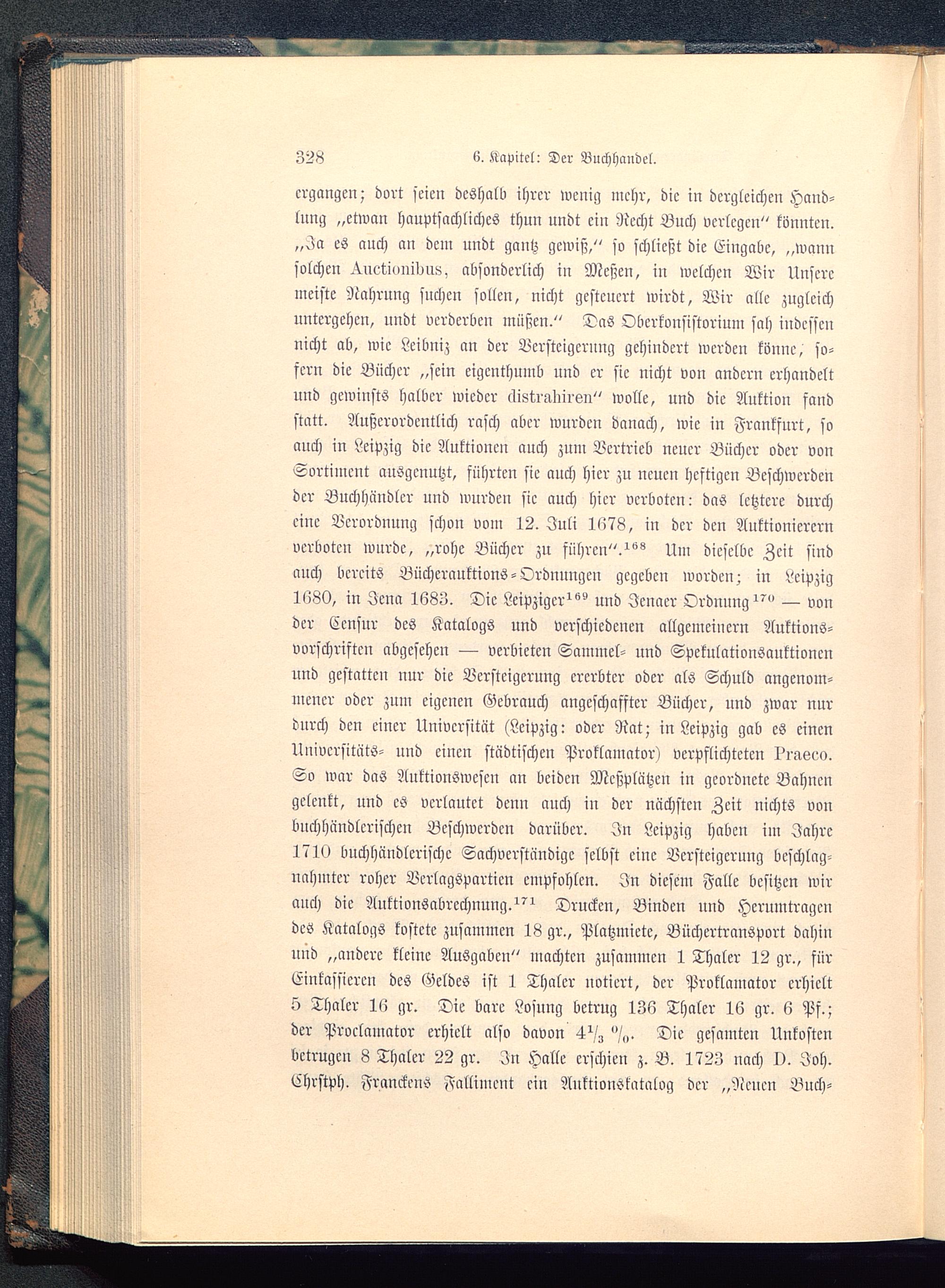 ergangen; dort seien deshalb ihrer wenig mehr, die in dergleichen Hand-lung „etwan hauptsächliches thun undt ein Recht Buch verlegen" könnten.„Ja es auch an dem undt gantz gewiß," so schließt die Eingabe, „wannsolchen ^net-ioniduL, absonderlich in Meßen, in welchen Wir Unseremeiste Nahrung suchen sollen, nicht gesteuert wirdt, Wir alle zugleichuutcrgchcn, undt verderben mäßen." Das Oberkonsistorium sah indessennicht ab, wie Leibniz an der Versteigerung gehindert werden könne, so-fern die Bücher „sein eigcnthumb und er sie nicht von andern erhandeltund gewinsts halber wieder ilisti'klui'su" wolle, und die Auktion fandstatt. Außerordentlich rasch aber wurden danach, wie in Frankfurt , soauch in Leipzig die Auktionen auch zum Vertrieb neuer Bücher oder vonSortiment auögcuutzt, führten sie auch hier zu neuen heftigen Beschwerdender Buchhändler und wurden sie auch hier verboten: das letztere durcheine Verordnung schon vom 12. Juli 1678, iu der den Auktioniercrnverboten wurde, „rohe Bücher zu führen".^ Um dieselbe Zeit sindauch bereits Bücherauktions-Ordnungen gegeben worden; in Leipzig 1080, in Jena 1683. Die Leipziger^" und Jenaer Ordnung"" — vonder Ccnsur des Katalogs und verschiedenen allgemeinem Auktions-vorschriftcn abgesehen — verbieten Sammel- und Speknlationsauktioncnund gestatten nur die Versteigerung ererbter oder als Schuld angenom-mener oder zum eigenen Gebrauch angeschaffter Bücher, und zwar nurdurch den einer Universität (Leipzig: oder Rat; in Leipzig gab es einenUnivcrsitäts- uud einen städtischen Proklamator) verpflichteten ?i^«ec>.So war das Auktionswcscn an beiden Mcßplützcn in geordnete Bahnengelenkt, und es verlautet denn auch in der nächsten Zeit nichts vonbnchhändlcrischen Beschwerden darüber. In Leipzig haben im Jahre1710 buchhändlerischc Sachverständige selbst eine Versteigerung beschlag-nahmter roher Verlagsparticu empfohlen. In diesem Falle besitzen wirauch die Anktionsabrechnung.^ Drucken, Binden und Hernmtragcudes Katalogs kostete zusammen 18 gr., Platzmictc, Büchertransport dahinuüd „andere kleine Ausgaben" machten zusammen 1 Thaler 12 gr., fürEinkassieren des Geldes ist 1 Thalcr notiert, der Proklamator erhielt5 Thalcr 16 gr. Die bare Losung betrug 136 Thaler 16 gr. 6 Pf.;der Proclamator erhielt also davon "/<,. Die gesamten Unkostenbetrugen 8 Thaler 22 gr. In Halle erschien z. B. 1723 nach v. Joh.Ehrstph. Franckeus ^altiineut ein Auktionskatalog der „Reueu Buch-
