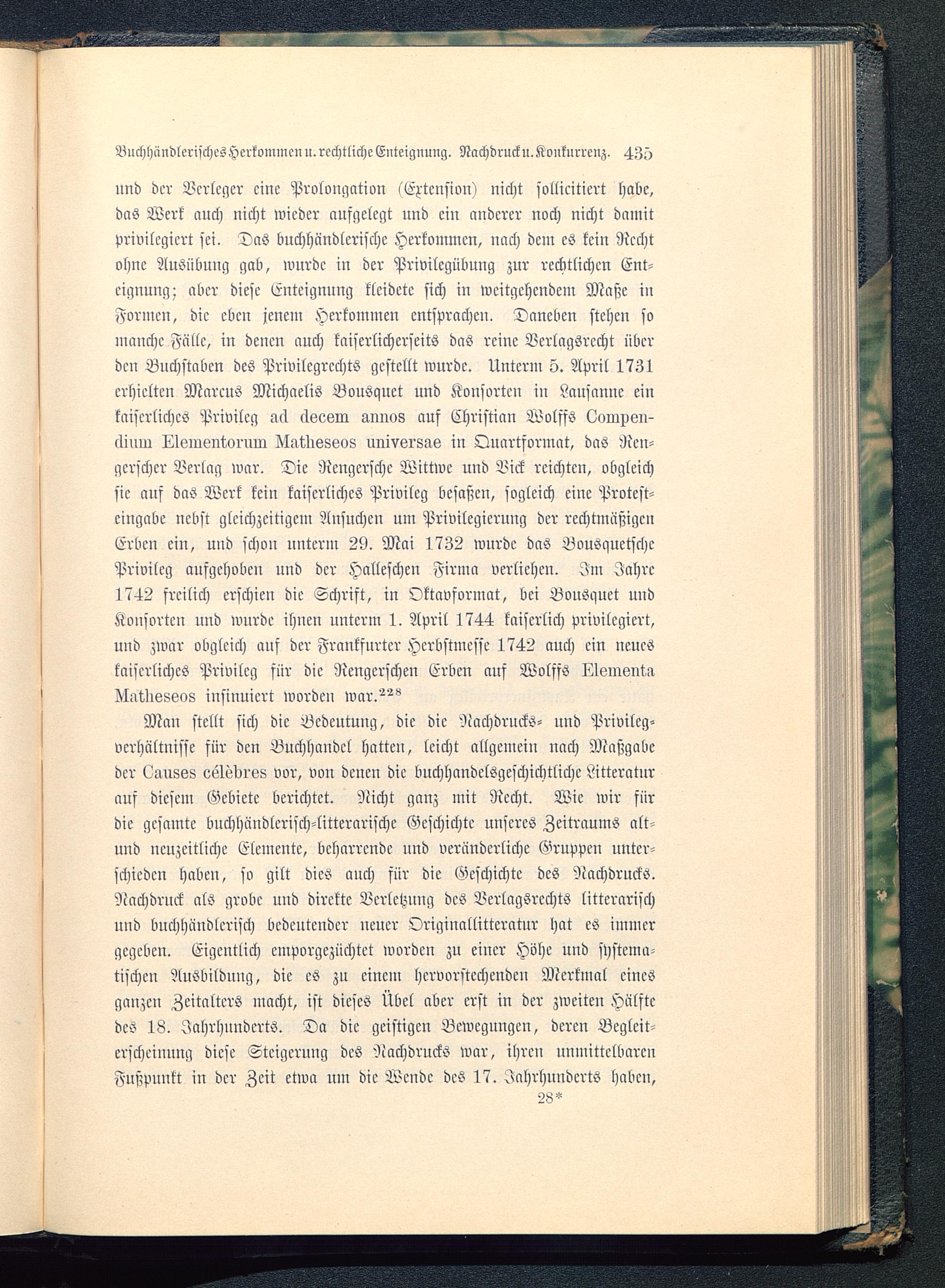 und dcr Verleger eine Prolongation (Ertension) nicht sollicitiert habe,das Werk auch nicht wieder aufgelegt und ciu anderer noch nicht damitprivilegiert sei. Das buchhändlcrische Herkommen, nach dem es kein Rechtohne Ausübung gab, wurde in der Privilegübung zur rechtlichen Ent-eignung; aber diese Enteignung kleidete sich in weitgehendem Maße iuFormen, die eben jenem Herkommen entsprachen. Daneben stehen somanche Fälle, in denen auch kaiserlicherseits das reine Verlagsrecht überden Buchstaben des Privilcgrcchts gestellt wurde. Unterm 5. April 1731erhielten Marcus Michaelis Bousquet und Konsorten in Lausanne einkaiserliches Privileg ack ckseem annos auf Christian Wolffs Lompsn-climu Llemsnwiuw Nl>t1ik8so8 universas in Quartformat , das Rcn-gerschcr Verlag war. Die Rengerschc Wittwe und Vick reichten, obgleichsie aus das Werk kein kaiserliches Privileg besaßen, sogleich eine Protest-cingabe nebst gleichzeitigem Ansuchen um Privilegierung der rechtmäßigenErben ein, und schon nntcrm 29. Mai 1732 wurde das BousauetschcPrivileg aufgehoben und der Hallescheu Firma verliehen. Im Jahre1742 freilich erschien die Schrift, in Oktavformat , bei Bousquet undKonsorten und wurde ihnen unterm 1. April 1744 kaiserlich privilegiert,und zwar obgleich auf der Frankfurter Herbstmesse 1742 auch ein neueskaiserliches Privileg für die Nengcrschen Erben auf Wolffs LlsmsnwU-Mikssos insinuiert worden war.'^