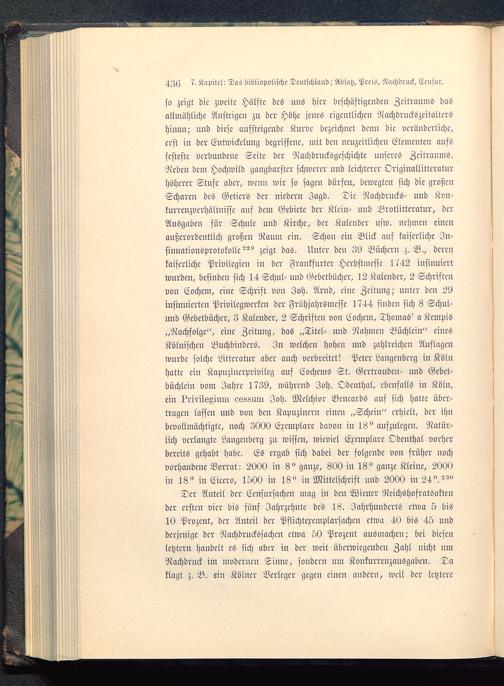 so zeigt die zweite Hälfte des uns hier beschäftigenden Zeitraums dasallmähliche Ansteigen zu der Hohe jenes eigentlichen NachdrnckSzcitaltcrshinan; und diese aussteigende Kurve bezeichnet denn die veränderliche,erst in der Entwickclung begriffene, mit den neuzeitlichen Elementen aufsfesteste verbundene Seite der Nachdrucksgcschichte unseres Zeitraums.Neben dem Hochwild gangbarster schwerer und leichterer Originallitteraturhöherer Stufe aber, wcun wir so sagen dürfen, bewegten sich die großenScharen des Getiers der Niedern Jagd. Tic Nachdrucks- und Kon-kurrenzverhältnisse ans dem Gebiete der Klein- und Brotlitteratur, derAusgaben für Schule und Kirche, der Kalender usw. nehmen einenaußerordentlich großen Raum ein. Schon ein Blick auf kaiserliche Jn-sinuationöprototolle''^ zeigt das. Unter den 39 Büchern z. B., derenkaiserliche Privilegien in der Frankfurter Herbstmesse 1742 insinuiertwurden, befinden sich 14 Schul- und Gebetbücher, 12 Kalender, 2 Schriftenvon Cochem , eine Schrift von Joh. Arnd, eine Zeitung; unter den 29insinuierten Privilcgwerkcn der Frühjahrsmesse 1744 finden sich 8 Schul-und Gebetbücher, 3 Kalender, 2 Schriften von Cochem, Thomas' a KempiS „Nachfolge", eine Zeitung, das „Titel- uud 'Nahmen Büchlein" einesKölnischen Buchbinders. In welchen hohen und zahlreiche» Auflagenwurde solche Ättcratur aber auch verbreitet! Peter Langenberg in Köln hatte ein Kavuzincrprivilcg auf Cochems St. Gertrauden- und Gebet-büchlcin vom Jahre 1739, während Joh. Odenthal, ebenfalls in Köln ,ein ?t'ivilsgium e688tuu Joh. Melchior Bmeards auf sich hatte über-tragen lassen und von den Kapuzinern einen „Schein" erhielt, der ihnbevollmächtigte, noch 3000 Cremvlare davon in 18" aufzulegen. Natür-lich verlangte Langenberg zn wissen, wieviel Cremvlare Odenthal vorherbereits gehabt habe. Cs ergab sich dabei der folgende von früher nochvorhandene Vorrat: 2000 in 8" ganze, 800 in 18» ganze Kleine, 2000in 18" in Cicero, 1500 in 18" in Mittelschrift und 2000 in 24".'^"Der Anteil der Ccnsursachen mag in den Wiener Rcichshofratsakteuder crstcn vicr bis fünf Jahrzehnte des 18. Jahrhunderts etwa 5 bis10 Prozent, der Anteil der Pflichtexemplarsachcn etwa 40 bis 45 undderjenige der Nachdruckssachcn etwa 50 Prozent ausmachen; bei diesenletzter« handelt es sich aber in der weit überwiegenden Zahl nicht umNachdrnck im modernen Sinne, sondern um Konkurrenzausgabcn. Daklagt z. B. ein Kölner Verleger gegen einen andern, weil der letztere