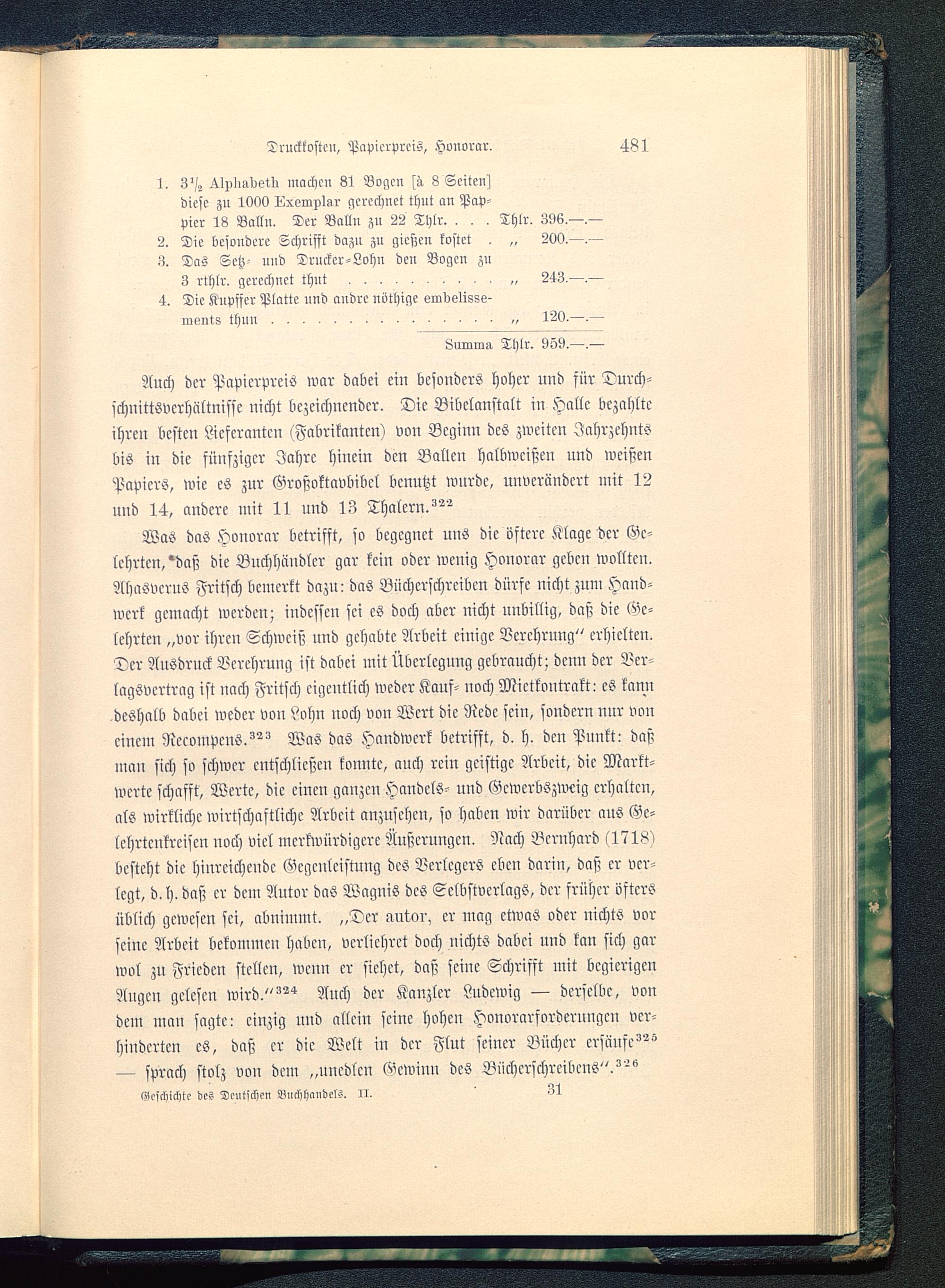 Was das Honorar betrifft, fo begegnet uns die öftere Klage der Ge-lehrten,'daß die Buchhändler gar kein oder wenig Honorar geben wollten.AhaSvcrus Fritsch bemerkt dazu: das Bücherschrcibcu dürfe nicht zum Hand-werk gemacht werden; indessen sei es doch aber nicht unbillig, daß die Ge-lehrten „vor ihren Schweiß und gehabte Arbeit einige Verehrung" erhielten.Der Anödruck Verehrung ist dabei mit Überlegung gebraucht; denn der Ver-lagsvcrtrag ist nach Fritsch eigentlich weder Kauf- uoch Mietkontrakt: cS kanndeshalb dabei weder von Lohn noch von Wert die Rede sein, sondern nur voneinem NccompcnS.^ Was das Handwerk betrifft, d. h. den Punkt: daßman sich so schwer entschließen konnte, auch rein geistige Arbeit, die Markt-werte schafft, Werte, die einen ganzen Handels- und GcwcrbSzweig erhalten,als wirkliche wirtschaftliche Arbeit anzusehen, so haben wir darüber aus Ge-lehrtcnkrciscn uoch viel merkwürdigere Äußerungen. Nach Bernhard (1718)besteht die hiureicheudc Gegenleistung des Verlegers eben darin, daß er ver-legt, d.h. daß er dem Autor das Wagnis des Selbstverlags, der früher öftersüblich gewesen sei, abnimmt. „Der kutor, er mag etwas oder nichts vorseine Arbeit bekommen haben, verlichrct doch nichts dabei und kan sich garwol zu Frieden stellen, wenn er siehct, daß seine Schrisft mit begierigenAngen gelesen wird."^ Auch der Kanzler Lndcwig — derselbe, vondem man sagte: einzig und allein seine hohen Honorarfordcrungcn ver-hinderte» cS, daß er die Welt iu der Flut seiner Bücher ersäufe^— sprach stolz von dem „unedlen Gewinn des Bücherschreibcns".^