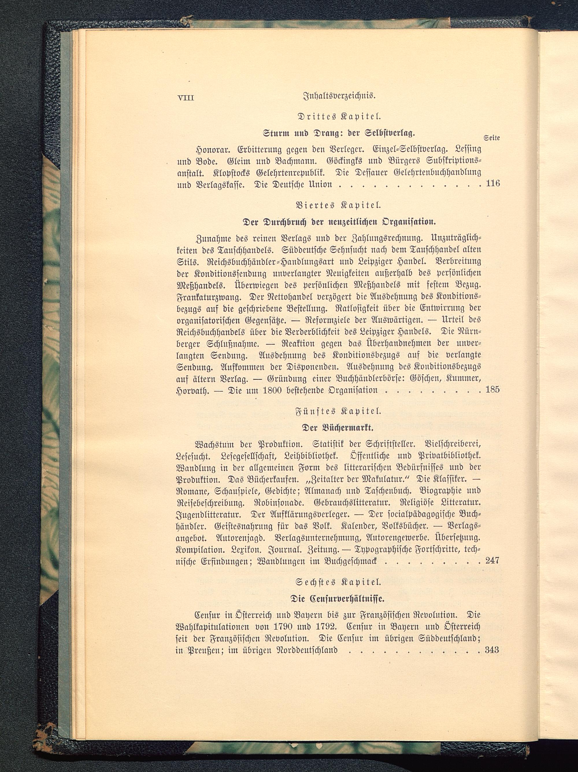 Wachstum der Produktion. Statistik der Schriftsteller. Vielschreibern,Lcsesucht. Lesegesellschaft, Leihbibliothek. Öffentliche und Privatbibliothek.Wandlung in der allgemeinen Form des literarischen Bedürfnisses nnd derProduktion. Das Bücherkaufen. „Zeitalter der Makulatur." Die Klassiker. —Romane, Schauspiele, Gedichte; Almauach und Taschenbuch. Biographie uudReisebeschreibuug. Robinsonadc. Gcbrauchslittcratur. Religiöse Littcratur.Jugcudlitteratur. Der Aufklärungsverleger. — Der socialpädagogischc Buch-händler. Geistcsnahrnng für das Volk. Kalender, Volksbücher. — Verlags-angebot. Antoreujagd. Verlagsnntcrnehmung, Antorcngewcrbc. Übersetzung.Kompilation. Lexikou. Journal. Zeitnng. — Typographische Fortschritte, tech-nische Erfindungen; Wandlungen im Buchgcschmack.........247