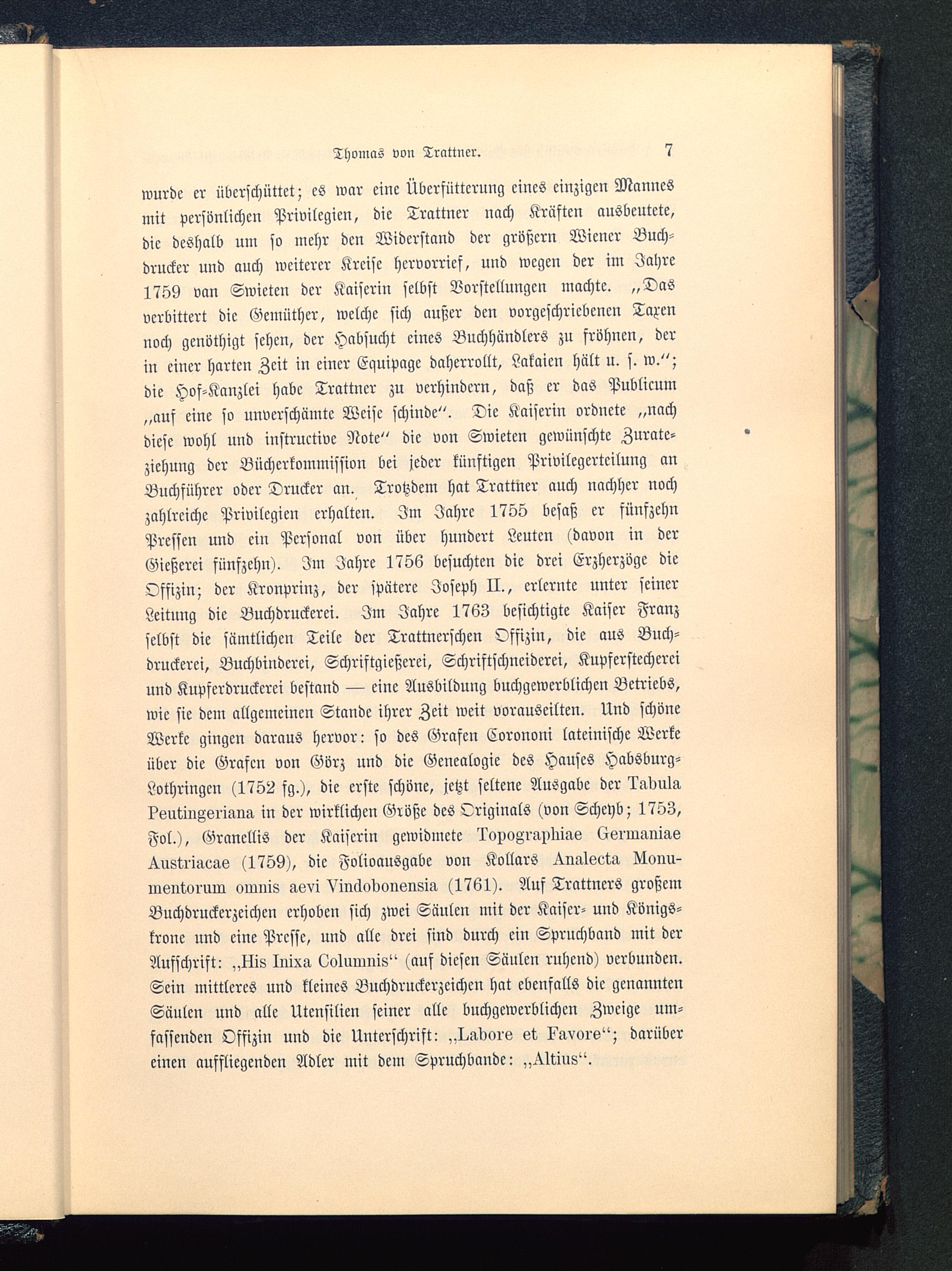 wurde er überschüttet; es war eine Übcrfüttcrung eines einzigen Mannesmit persönlichen Privilegien, die Trattner nach Kräften ausbeutete,die deshalb um so mehr den Widerstand der größern Wiener Buch-drucker und auch weiterer Kreise hervorrief, und wegen der im Jahre1759 van Swieten der Kaiserin selbst Vorstellungen machte. „Dasverbittert die Gemüther, welche sich außer den vorgeschriebenen Taxennoch genothigt sehen, der Habsucht eines Buchhändlers zn fröhncn, derin einer harten Zeit in einer Equipage daherrollt, Lakaien hält u. s. w.";die Hof-Kanzlei habe Trattncr zu verhindern, daß er das Publicum„auf eine so unverschämte Weise schinde". Die Kaiserin ordnete „nachdiese wohl und instructive Note" die von Swieten gewünschte Zuratc-ziehung der Bücherkommission bei jeder künftigen Privilegertcilung anBuchführer oder Drucker an. Trotzdem hat Trattner auch nachher nochzahlreiche Privilegien erhalten. Im Jahre 1755 besaß er fünfzehnPressen und ciu Personal von über hundert Leuten (davon in derGießerei fünfzehn). Im Jahre 1756 besuchten die drei Erzherzöge dieOffizin; der Kronprinz, der spätere Joseph II. , erlernte unter seinerLeitung die Buchdruckerei. Im Jahre 1763 besichtigte Kaiser Franz selbst die sämtlichen Teile der Trattnerschen Offizin, die aus Buch-druckerei, Buchbinderei, Schriftgießerei, Schriftschnciderei, Kupferstechernund Kupfcrdruckcrci bestand — eine Ausbildung buchgewerblichcn Betriebs,wie sie dem allgemeinen Stande ihrer Zeit weit vorauseilten. Und schöneWerke gingen daraus hervor: so des Grafen Corononi lateinische Werkeüber die Grafen von Görz und die Genealogie des Hauses Habsburg -Lothringcn (1752 fg.), die erste schöne, jetzt seltene Ausgabe der I^dula?öutinZ6i'mng, in der wirklichen Größe des Originals (von Scheyb; 1753,Fol.), Granellis der Kaiserin gewidmete 'loxooi'Hpdmö Ksrumume^.ustrmoae (1759), die Folioausgabe von Kollars ^.imlseta Nonn-lukuwl'uui omm8 asvi Vinclodonsnsm (1761). Auf Trattners großemBuchdruckerzeichen erhoben sich zwei Säulen mit der Kaiser- und Königs-krone und eine Presse, und alle drei sind durch ein Sprnchband mit derAufschrift! ,,Hi8 Inixa Loluumis" (auf diesen Säulen ruhend) verbunden.Sein mittleres und kleines Buchdruckcrzcichcn hat ebenfalls die genanntenSäulen und alle Utensilien seiner alle buchgewerblichcn Zweige um-fassenden Offizin und die Unterschrift: „I^^dors et. ?avvi-e"; darübereinen auffliegenden Adler mit dem Spruchbande: „^Itins".