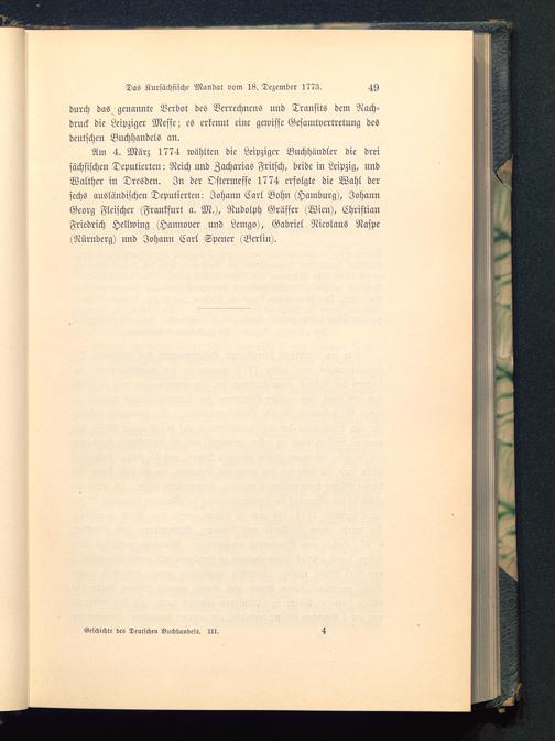 Am 4. März 1774 wählten die Leipziger Buchhändler die dreisächsischen Deputierten: Reich und Zacharias Fritsch, beide in Leipzig , undWalther in Dresden . In der Ostermesse 1774 erfolgte die Wahl dersechs ausländischen Deputierten: Johann Carl Bohn (Hamburg ), JohannGeorg Fleischer (Frankfurt a. M.), Rudolph Gräffer (Wien ), ChristianFriedrich Hellwing (Hannover und Lemgo ), Gabriel Nicolaus Raspe(Nürnberg) und Johann Carl Spener (Berlin ).