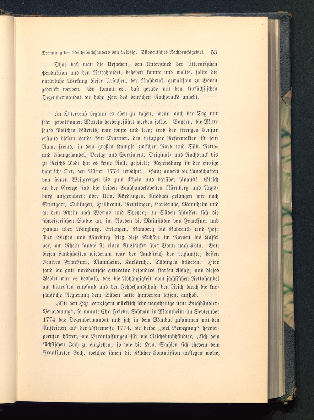 In Österreich begann es eben zu tagen, wenn auch der Tag mitsehr gewaltsamen Mitteln herbeigeführt werden sollte. Bayern , die Mittejenes südlichen Gürtels, war wüste und leer; trotz der strengen Ccnsurerstand diesem Lande kein Trattner, den Leipziger Reformakten ist seinName fremd, in dem großen Kampfe zwischen Nord und Süd, Nctto-und Changchandel, Verlag und Sortiment, Original- und Nachdruck biszu Reichs Tode hat es keine Rolle gespielt; Regensburg ist der einzigebayrische Ort, den Pütter 1774 erwähnt. Ganz anders die Landschaftenvon seinen Westgrenzen bis zum Rhein und darüber hinaus! Gleichan der Grenze sind die beiden Buchhandelsvesten Nürnberg und Augs-burg aufgerichtet; über Ulm, Nördlingen, Ansbach gelangen wir nachStuttgart, Tübingen, Heilbronn, Reutlingen, Karlsruhe, Mannheim undan dem Rhein nach Worms und Speyer ; im Süden schloffen sich dieschweizerischen Städte an, im Norden die Mainstädte von Frankfurt undHanau über Würzburg, Erlangen, Bamberg bis Bayreuth und Hof;über Gießen und Marburg stieß diese Sphäre im Norden bis Kassel vor, am Rhein sandte sie einen Ausläufer über Bonn nach Köln . Bondiesen Landschaften wiederum war der Landstrich der regsamste, dessenCentren Frankfurt, Mannheim, Karlsruhe, Tübingen bildeten. Hierfand die gute norddeutsche Litteratur besonders starken Absatz; und diesesGebiet war eö deshalb, das die Abhängigkeit vom sächsischen Ncttohandelam bittersten empfand und den Fehdehandschuh, den Reich durch die kur-sttchsische Regierung dem Süden hatte hinwerfen lassen, aufhob.
