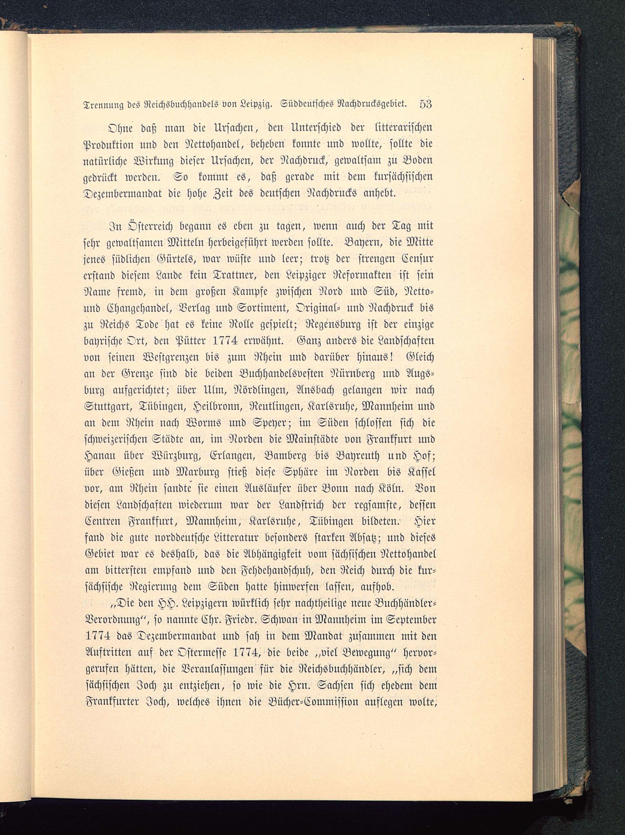 „Die den HH. Leipzigern würklich sehr nachtheilige neue Buchhändler-Verordnung", so nannte Chr. Friedr. Schwan in Mannheim im September1774 das Dezcmbermandat und sah in dem Mandat zusammen mit denAuftritten auf der Ostermcsse 1774, die beide „viel Bewegung" hervor-gerufen hätten, die Veranlassungen für die Reichsbuchhändler, „sich demsächsischen Joch zu entziehen, so wie die Hrn. Sachsen sich ehedem demFrankfurter Joch, welches ihnen die Bücher-Commission auflegen wolte,