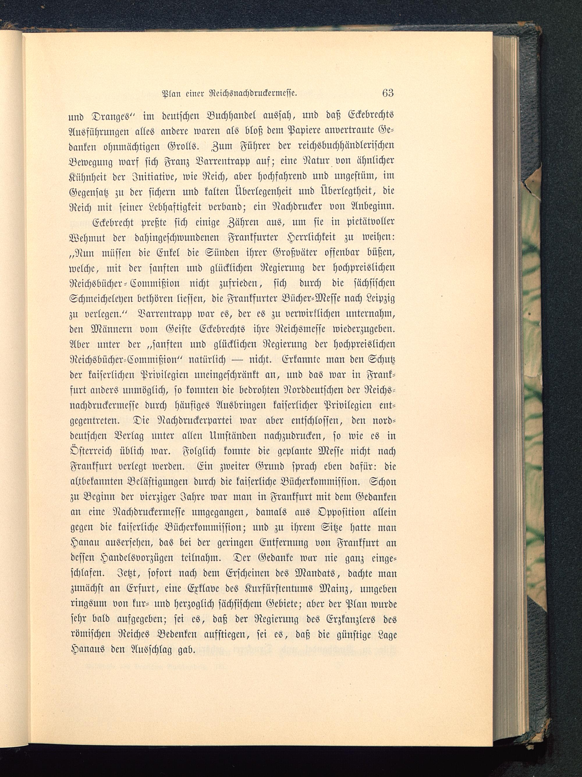 Eckebrecht preßte sich einige Zähren aus, um sie in pietätvollerWehmut der dahingeschwundenen Frankfurter Herrlichkeit zu weihen:„Nun müssen die Enkel die Sünden ihrer Großväter offenbar büßen,welche, mit der sanften und glücklichen Negierung der hochprcislichenReichsbücher-Commißion nicht zufrieden, sich durch die sächsischenSchmeicheleien bethörcn liessen, die Frankfurter Bücher-Messe nach Leipzig zu verlegen." Varrentrapp war es, der es zu verwirklichen unternahm,den Männern vom Geiste Eckebrechts ihre Reichsmesse wiederzugeben.Aber unter der „sanften und glücklichen Negierung der hochpreislichenNeichsbücher-Commißion" natürlich — nicht. Erkannte man den Schutzder kaiserlichen Privilegien uneingeschränkt an, und das war in Frank-furt anders unmöglich, so konnten die bedrohten Norddeutschen der Reichs-nachdruckermesse durch häufiges Ausbringen kaiserlicher Privilegien ent-gegentreten. Die Nachdruckcrpartei war aber entschlossen, den nord-deutschen Verlag unter allen Umständen nachzudrucken, so wie es inÖsterreich üblich war. Folglich konnte die geplante Messe nicht nachFrankfurt verlegt werden. Ein zweiter Grund sprach eben dafür: diealtbekannten Belästigungen durch die kaiserliche Bücherkommission. Schonzu Beginn der vierziger Jahre war man in Frankfurt mit dem Gedankenan eine Nachdruckermesse umgegangen, damals aus Opposition alleingegen die kaiserliche Büchcrkommission; nnd zu ihrem Sitze hatte manHanau ausersehcn, das bei der geringen Entfernung von Frankfurt andessen Handclsvorzügen teilnahm. Der Gedanke war nie ganz einge-schlafen. Jetzt, sofort nach dem Erscheinen des Mandats, dachte manzunächst an Erfurt, eine Exklave des Kurfürstentums Mainz , umgebenringsum von tur- und herzoglich sächsischem Gebiete; aber der Plan wurdesehr bald aufgegeben; sei es, daß der Negierung des Erzkanzlers desrömischen Reiches Bedenken aufstiegen, sei es, daß die günstige LageHanaus den Ausschlag gab.