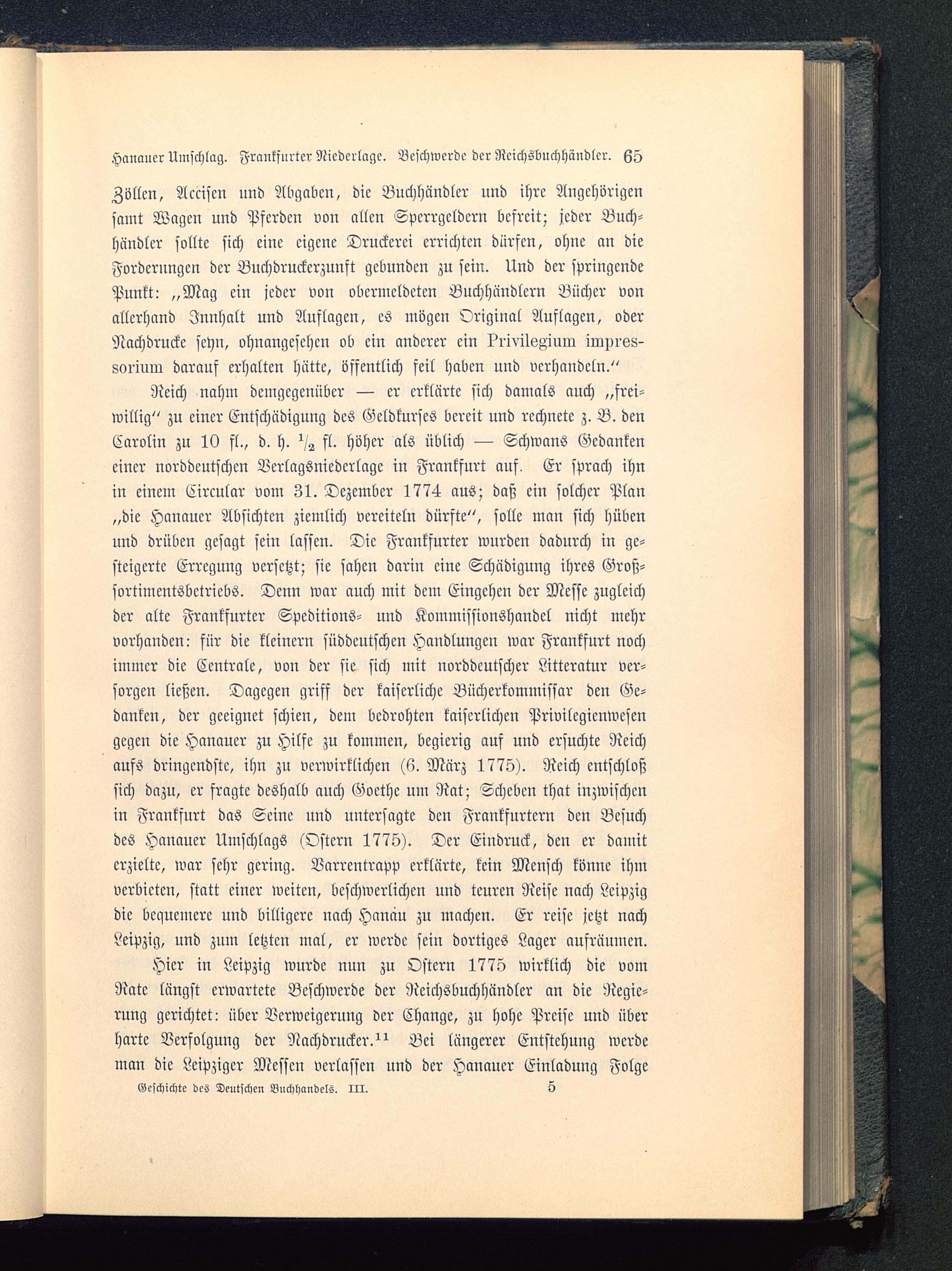 Hier in Leipzig wurde nun zu Ostern 1775 wirklich die vomRate längst erwartete Beschwerde der Rcichsbuchhändler an die Negie-rung gerichtet: über Verweigerung der Change, zu hohe Preise und überharte Verfolgung der Nachdrucker." Bei längerer Entstehung werdeman die Leipziger Messen verlassen und der Hanauer Einladung Folge
