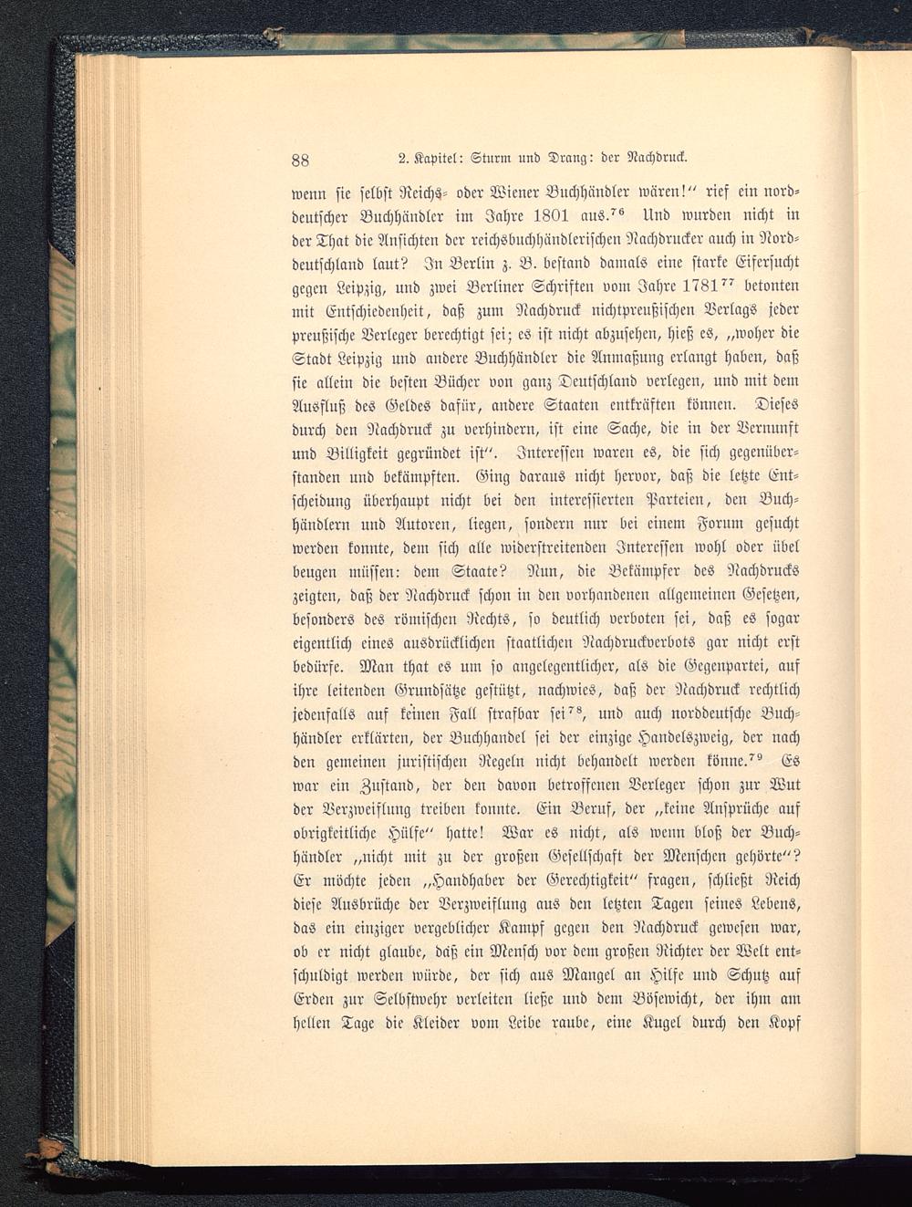 wenn sie selbst Reichs- oder Wiener Buchhändler wären!" rief ein nord-deutscher Buchhändler im Jahre 1801 aus/° Und wurden nicht inder That die Ansichten der reichsbuchhändtcrischen Nachdrnckcr auch in Nord-dcutschlcmd laut? In Berlin z. B. bestand damals eine starke Eifersuchtgegen Leipzig , und zwei Berliner Schriften vom Jahre 1781^ betontenmit Entschiedenheit, daß zum Nachdruck nichtprenßischcn Verlags jederpreußische Verleger berechtigt sei; es ist nicht abzusehen, hieß es, „woher dieStadt Leipzig und andere Buchhändler die Anmaßung erlangt haben, daßsie allein die besten Bücher von ganz Deutschland verlegen, und mit demAusfluß des Geldes dafür, andere Staaten entkräften können. Diesesdurch den Nachdruck zu verhindern, ist eine Sache, die in der Vernunftund Billigkeit gegründet ist". Interessen waren es, die sich gegenüber-standen und bekämpften. Ging darans nicht hervor, daß die letzte Ent-scheidung überhaupt nicht bei den interessierten Parteien, den Buch-händlern und Autoren, liegen, sondern nur bei einem Forum gesuchtwerden konnte, dem sich alle widerstreitenden Interessen wohl oder übelbeugen müssen: dem Staate? Nun, die Bckämpfcr des Nachdruckszeigten, daß der Nachdruck schon in den vorhandenen allgemeinen Gesetzen,besonders des römischen Rechts, so deutlich verboten sei, daß es sogareigentlich eines ausdrücklichen staatlichen Nachdruckvcrbots gar nicht erstbedürfe. Man that es um so angelegentlicher, als die Gegenpartei, aufihre leitenden Grundsätze gestützt, nachwies, daß der Nachdruck rechtlichjedenfalls auf keinen Fall strafbar sei^, und auch norddeutsche Buch-händler erklärten, der Buchhandel sei der einzige Handelszweig, der nachden gemeinen juristischen Regeln nicht behandelt werden könne/° Eswar ein Zustand, der den davon betroffenen Verleger schon zur Wutder Verzweiflung treiben konnte. Ein Beruf, der „keine Ansprüche aufobrigkeitliche Hülfe" hatte! War es nicht, als wenn bloß der Buch-händler „nicht mit zu der großen Gesellschaft der Menschen gehörte"?Er möchte jeden „Handhaber der Gerechtigkeit" fragen, schließt Reichdiese Ausbrüche der Verzweiflung aus den letzten Tagen seines Lebens,das ein einziger vergeblicher Kampf gegen den Nachdruck gewesen war,ob er nicht glaube, daß ein Mensch vor dem großen Richter der Welt ent-schuldigt werden würde, der sich aus Mangel an Hilfe und Schutz aufErden zur Selbstwchr verleiten ließe und dem Bösewicht, der ihm amhellen Tage die Kleider vom Leibe ranbc, eine Kugel durch den Kopf