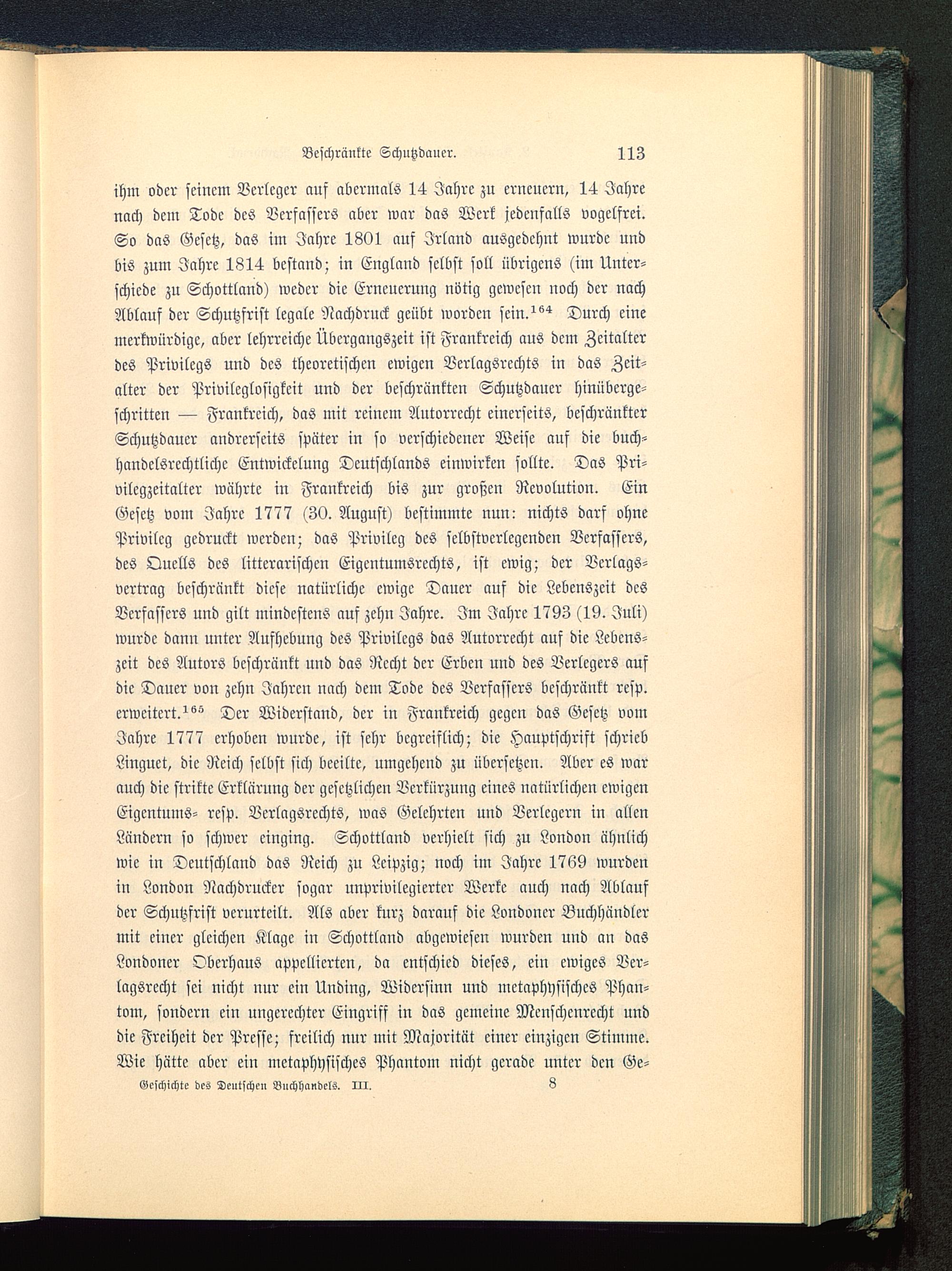 ihm oder seinem Verleger auf abermals 14 Jahre zu erneuern, 14 Jahrenach dem Tode des Verfassers aber war das Werk jedenfalls vogelfrei.So das Gesetz, das im Jahre 1801 auf Irland ausgedehnt wurde undbis zum Jahre 1814 bestand; in England selbst soll übrigens (im Unter-schiede zu Schottland ) weder die Erneuerung nötig gewesen noch der nachAblauf der Schutzfrist legale Nachdruck geübt worden sein.^ Durch einemerkwürdige, aber lehrreiche Übergangszeit ist Frankreich aus dem Zeitalterdes Privilegs und des theoretischen ewigen Verlagsrechts in das Zeit-alter der Privileglosigkeit und der beschränkten Schutzdaucr hinüberge-schritten — Frankreich , das mit reinem Autorrecht einerseits, beschränkterSchutzdauer andrerseits später in so verschiedener Weise auf die buch-handelsrechtlichc Entwickclung Deutschlands einwirken sollte. Das Pri-vilcgzeitalter währte in Frankreich bis zur großen Revolution. EinGesetz vom Jahre 1777 (30. August) bestimmte nun: nichts darf ohnePrivileg gedruckt werden; das Privileg des selbstverlegenden Verfassers,des Quells des litterarischen Eigentumsrechts, ist ewig; der Verlags-vertrag beschränkt diese natürliche ewige Dauer auf die Lebenszeit desVerfassers und gilt mindestens auf zehn Jahre. Im Jahre 1793 (19. Juli)wurde dann unter Aufhebung des Privilegs das Autorrecht auf die Lebens-zeit des Autors beschränkt und das Recht der Erben und des Verlegers aufdie Dauer von zehn Jahren nach dem Tode des Verfassers beschränkt resp.erweitert.^ Der Widerstand, der in Frankreich gegen das Gesetz vomJahre 1777 erhoben wurde, ist sehr begreiflich; die Hauptschrift schriebLinguet , die Reich selbst sich beeilte, umgehend zu übersetzen. Aber es warauch die strikte Erklärung der gesetzlichen Verkürzung eines natürlichen ewigenEigentums- resp. Verlagsrechts, was Gelehrten und Verlegern in allenLändern so schwer einging. Schottland verhielt sich zu London ähnlichwie in Deutschland das Reich zu Leipzig ; noch im Jahre 1769 wurdenin London Nachdrucker sogar unprivilegierter Werke auch nach Ablaufder Schutzfrist verurteilt. Als aber kurz darauf die Londoner Buchhändlermit einer gleichen Klage in Schottland abgewiesen wurden und an dasLondoner Oberhaus appellierten, da entschied dieses, ein ewiges Ver-lagsrecht sei nicht nur ein Unding, Widersinn und metaphysisches Phan-tom, sondern ein ungerechter Eingriff in das gemeine Mcnschcnrecht unddie Freiheit der Presse; freilich nur mit Majorität einer einzigen Stimme.Wie hätte aber ein metaphysisches Phantom nicht gerade unter den Ge-