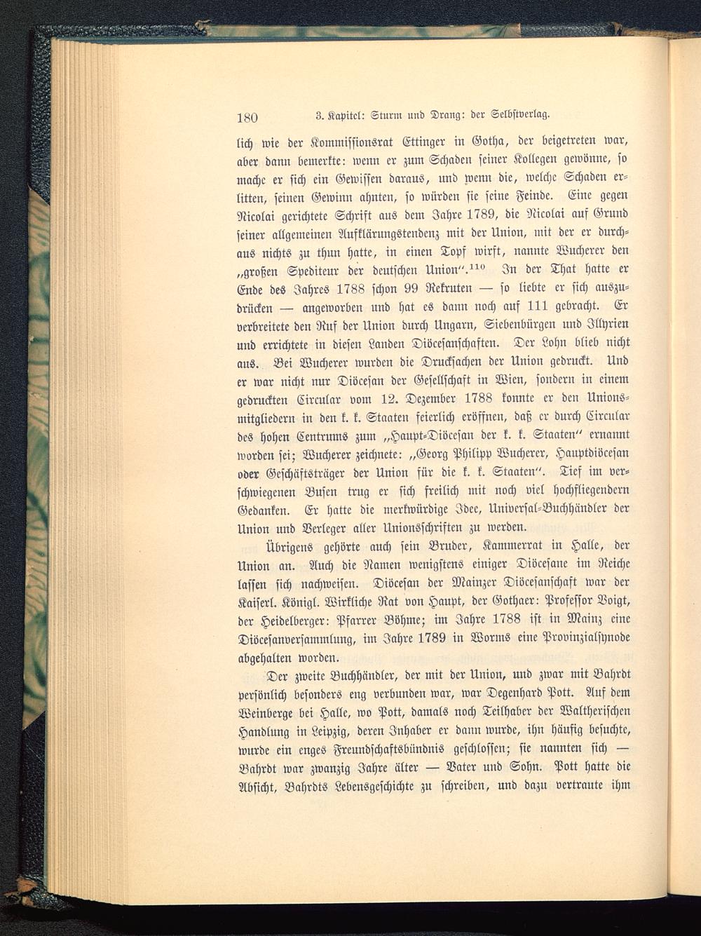 Der zweite Buchhändler, der mit der Union, und zwar mit Bahrdtpersönlich besonders eng verbunden war, war Degenhard Pott. Auf demWeinberge bei Halle, wo Pott, damals noch Teilhaber der WaltherischenHandlung in Leipzig , deren Inhaber er dann wurde, ihn häufig besuchte,wurde ein enges Freundschaftsbündnis geschlossen; sie nannten sich —Bahrdt war zwanzig Jahre älter — Vater und Sohn. Pott hatte dieAbsicht, Bahrdts Lebensgeschichte zu schreiben, und dazu vertraute ihm