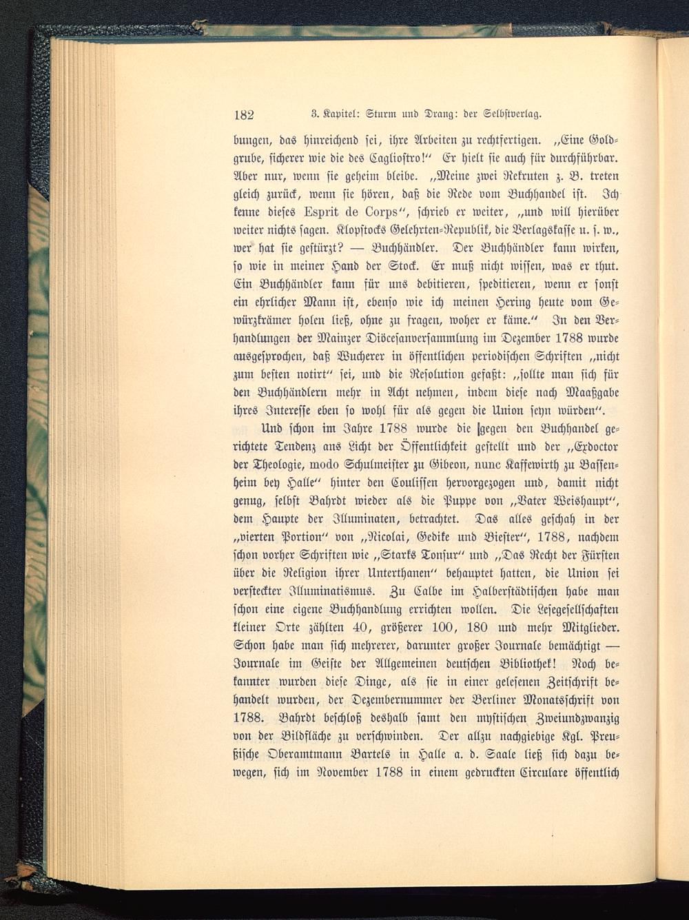 Und schon im Jahre 1788 wurde die jgegen den Buchhandel ge-richtete Tendenz ans Licht der Öffentlichkeit gestellt und der „Exdoctorder Theologie, mocko Schulmeister zu Gibeon, nunc Kaffewirth zu Bassen-heim bey Halle" hinter den Coulissen hervorgezogen und, damit nichtgenug, selbst Bahrdt wieder als die Puppe von „Vater Weishaupt",dem Haupte der Jlluminaten, betrachtet. Das alles geschah in der„vierten Portion" von „Nicolai, Gedike und Biester", 1788, nachdemschon vorher Schriften wie „Starts Tonsur" und „Das Recht der Fürsten über die Religion ihrer Unterthanen" behauptet hatten, die Union seiversteckter Jlluminatismus. Zu Calbe im Halberstädtischen habe manschon eine eigene Buchhandlung errichten wollen. Die Lesegesellschaftenkleiner Orte zählten 40, größerer 100, 180 und mehr Mitglieder.Schon habe man sich mehrerer, darunter großer Journale bemächtigt —Journale im Geiste der Allgemeinen deutschen Bibliothek! Noch be-kannter wurden diese Dinge, als sie in einer gelesenen Zeitschrift be-handelt wurden, der Dezembernummer der Berliner Monatsschrift von1788. Bahrdt beschloß deshalb samt den mystischen Zweiundzwanzigvon der Bildfläche zu verschwinden. Der allzu nachgiebige Kgl. Preu-ßische Oberamtmann Bartels in Halle a. d. Saale ließ sich dazu be-wegen, sich im November 1788 in einem gedruckten Circulare öffentlich