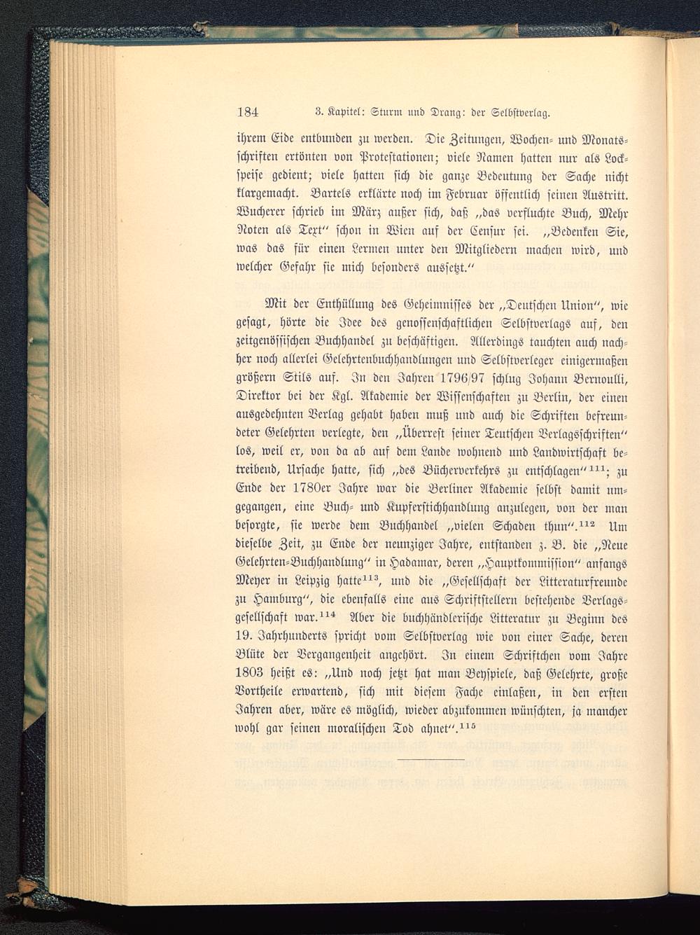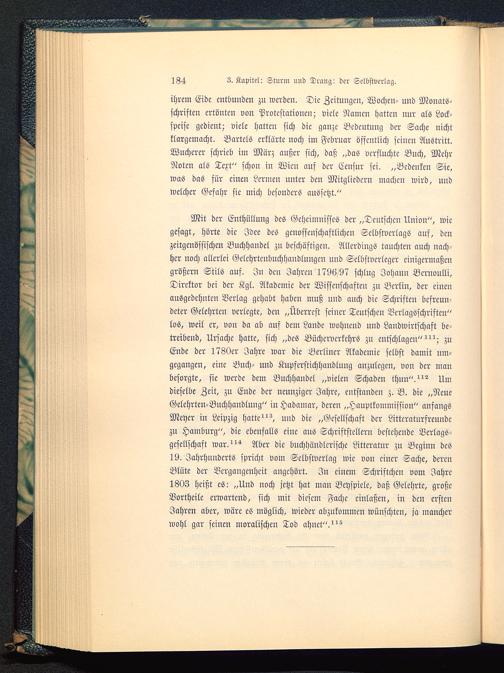 Mit der Enthüllung des Geheimnisses der „Deutsche» Union", wiegesagt, hörte die Idee des genossenschaftlichen Selbstverlags auf, denzeitgenössischen Buchhandel zu beschäftigen. Allerdings tauchten auch nach-her noch allerlei Gclchrteubuchhandlungcn und Selbstverlcgcr einigermaßengrößcrn Stils auf. In den Jahren 179(5/97 schlug Johann Bcrnoulli,Direktor bei der Kgl. Akademie der Wissenschaften zu Berlin, der einenausgedehnten Verlag gehabt haben muß uud auch die Schriften befreun-deter Gelehrten verlegte, den „Überrest seiner Teutschen Verlagsschriften"los, weil er, von da ab auf dem Laude wohuend und Landwirtschaft be-treibend, Ursache hatte, sich „des Büchervcrkehrs zu entschlagen" zuEnde der 1780er Jahre war die Berliner Akademie selbst damit um-gegangen, eine Buch- und Kupferstichhaudlung anzulegen, von der manbesorgte, sie werde dem Buchhandel „vielen Schaden thun"."^ Umdieselbe Zeit, zu Ende der neunziger Jahre, entstanden z. B. die „NeueGelehrten-Buchhaudlung" in Hadamar , deren „Haupttommission" anfangsMeyer in Leipzig hatte und die „Gesellschaft der Littcraturfreuudczu Hamburg ", die ebenfalls eine aus Schriftstellern bcstcheudc Verlags-gesellschaft war. Uber die buchhändlcrischc Litteratur zu Beginn des19. Jahrhunderts spricht vom Selbstverlag wie von einer Sache, derenBlüte der Vergangenheit angehört. In einem Schristchen vom Jahre1803 heißt es: „Und noch jetzt hat man Beyspiele, daß Gelehrte, großeVortheilc erwartend, sich mit diesem Fache cinlaßen, in den erstenJahren aber, wäre cö möglich, wieder abzukommen wünschten, ja mancherwohl gar seinen moralischen Tod ahnet".