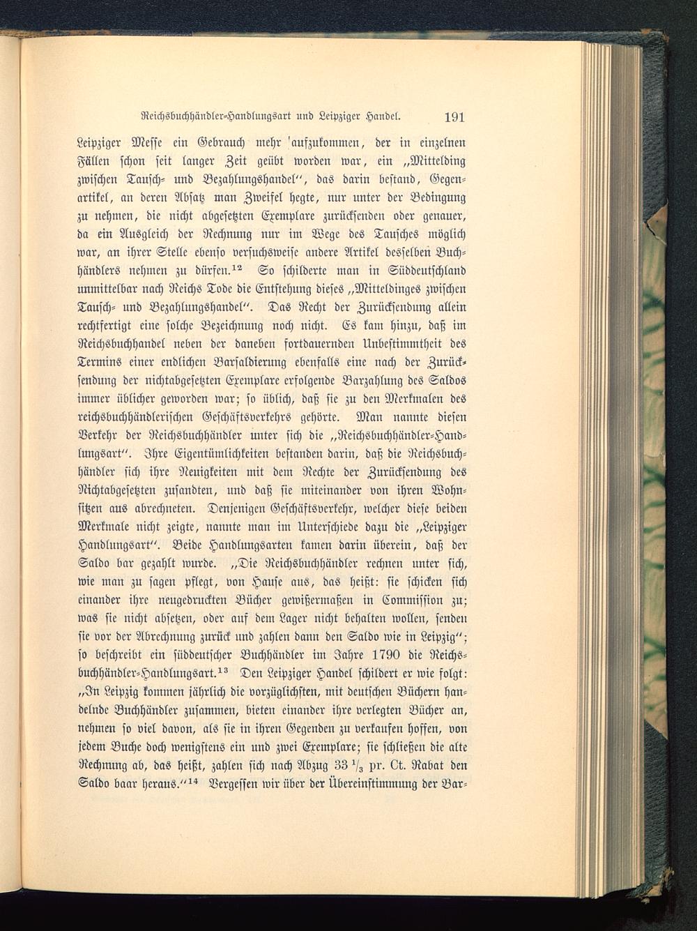 Leipziger Messe ein Gebrauch mehr 'aufzukommen, der in einzelnenFällen schon seit langer Zeit geübt worden war, ein „Mitteldingzwischen Tausch- und Bezahlungshandel", das darin bestand, Gegen-artikel, an deren Absatz man Zweifel hegte, nur unter der Bedingungzu nehmen, die nicht abgesetzten Exemplare zurücksenden oder genauer,da ein Ausgleich der Rechnung nur im Wege des Tausches möglichwar, an ihrer Stelle ebenso versuchsweise andere Artikel desselben Buch-händlers nehmen zu dürfen.^ So schilderte man in Süddeutschlandunmittelbar nach Reichs Tode die Entstehung dieses „Mitteldinges zwischenTausch- und Bezahlungshandel". Das Recht der Zurücksendung alleinrechtfertigt eine solche Bezeichnung noch nicht. Es kam hinzu, daß imReichsbuchhandel neben der daneben fortdauernden Unbestimmtheit desTermins einer endlichen Vorsaldierung ebenfalls eine nach der Zurück-sendung der nichtabgesetzten Exemplare erfolgende Barzahlung des Saldosimmer üblicher geworden war; so üblich, daß sie zu den Merkmalen desreichsbuchhändlerischen Geschäftsverkehrs gehörte. Man nannte diesenBerkehr der Reichsbuchhändler unter sich die „Reichsbuchhändler-Hand-lungsart". Ihre Eigentümlichkeiten bestanden darin, daß die Reichsbuch-händler sich ihre Neuigkeiten mit dem Rechte der Zurücksendung desNichtabgesetzten zusandten, und daß sie miteinander von ihren Wohn-sitzen aus abrechneten. Denjenigen Geschäftsverkehr, welcher diese beidenMerkmale nicht zeigte, nannte man im Unterschiede dazu die „LeipzigerHandlungsart". Beide Handlungsarten kamen darin überein, daß derSaldo bar gezahlt wurde. „Die Reichsbuchhändler rechnen unter sich,wie man zu sagen pflegt, von Hause aus, das heißt: sie schicken sicheinander ihre neugedruckten Bücher gewißermaßen in Commission zu;was sie nicht absetzen, oder auf dem Lager nicht behalten wollen, sendensie vor der Abrechnung zurück und zahlen dann den Saldo wie in Leipzig ";so beschreibt ein süddeutscher Buchhändler im Jahre 1790 die Reichs-buchhändler-Handlungsart." Den Leipziger Handel schildert er wie folgt:„In Leipzig kommen jährlich die vorzüglichsten, mit deutschen Büchern han-delnde Buchhändler zusammen, bieten einander ihre verlegten Bücher an,nehmen so viel davon, als sie in ihren Gegenden zu verkaufen hoffen, vonjedem Buche doch wenigstens ein und zwei Exemplare; sie schließen die alteRechnung ab, das heißt, zahlen sich nach Abzug 33 xr. lüt. Rabat denSaldo baar heraus."" Vergessen wir über der Übereinstimmung der Bar-