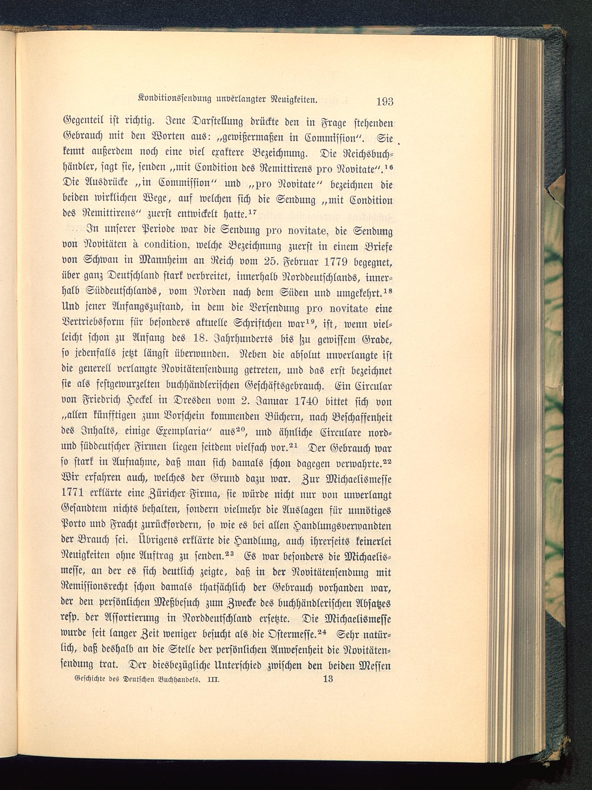 In unserer Periode war die Sendung pro novitaw, die Sendungvon Novitäten a eomWon, welche Bezeichnung zuerst in einem Briefevon Schwan in Mannheim an Reich vom 25. Februar 1779 begegnet,über ganz Deutschland stark verbreitet, innerhalb Norddcutschlands, inner-halb Süddeutschlands , vom Norden nach dem Süden und umgekehrt.^Und jener Anfangszustand, in dem die Versendung pro novitate eineVertriebssorm für besonders aktuelle Schriftchen war^, ist, wenn viel-leicht schon zu Anfang des 18. Jahrhunderts bis jzu gewissem Grade,so jedenfalls jetzt längst überwunden. Neben die absolut unverlangte istdie generell verlangte Novitätensendung getreten, und das erst bezeichnetsie als festgewurzelten buchhändlerischen Geschäftsgcbrauch. Ein Circularvon Friedrich Hcckel in Dresden vom 2. Januar 1740 bittet sich von„allen künfftigen zum Vorschein kommenden Büchern, nach Beschaffenheitdes Inhalts, einige Exemplaria" aus'^", und ähnliche Circulare nord-und süddeutscher Firmen liegen seitdem vielfach vor." Der Gebrauch warso stark in Aufnahme, daß man sich damals schon dagegen verwahrte.^Wir erfahren auch, welches der Grund dazu war. Zur Michaelismesse1771 erklärte eine Züricher Firma, sie würde nicht nur von unverlangtGesandtem nichts behalten, sondern vielmehr die Auslagen für unnötigesPorto und Fracht zurückfordern, so wie es bei allen Handlungsverwandtender Brauch sei. Übrigens erklärte die Handlung, auch ihrerseits keinerleiNeuigkeiten ohne Auftrag zu senden.^ Es war besonders die Michaelis-messe, an der es sich deutlich zeigte, daß in der Novitätensendung mitRemissionsrecht schon damals thatsächlich der Gebrauch vorhanden war,der den persönlichen Meßbesuch zum Zwecke des buchhändlerischen Absatzesresp. der Assortierung in Norddeutschland ersetzte. Die Michaelismessewurde seit langer Zeit weniger besucht als die Ostermesse.^ Sehr natür-lich, daß deshalb an die Stelle der persönlichen Anwesenheit die Novitäten-sendung trat. Der diesbezügliche Unterschied zwischen den beiden Messen