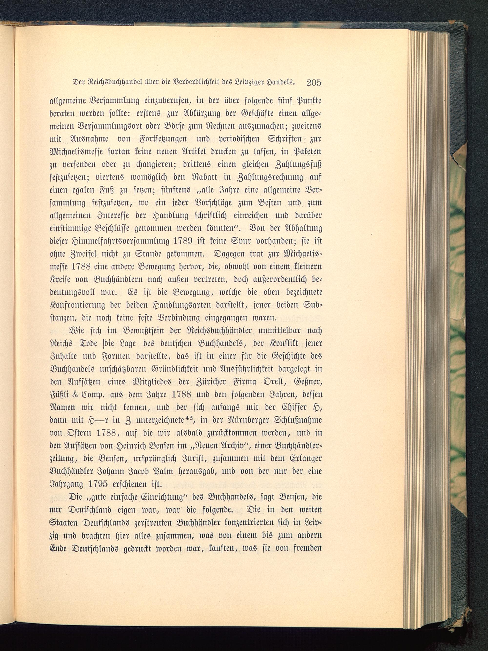 Wie sich im Bewußtsein der Reichsbuchhündlcr unmittelbar nachReichs Tode sdie Lage des deutschen Buchhandels, der Konflikt jenerInhalte und Formen darstellte, das ist in einer für die Geschichte desBuchhandels unschätzbaren Gründlichkeit und Ausführlichkeit dargelegt inden Aufsätzen eines Mitgliedes der Züricher Firma Orell, Geßner,Füßli Comp, aus dem Jahre 1788 und den folgenden Jahren, dessenNamen wir nicht kennen, und der sich anfangs mit der Chiffer H,dann mit H—r in Z unterzeichnete^, in der Nürnberger Schlußnahmevon Ostern 1788, auf die wir alsbald zurückkommen werden, und inden Aufsätzen von Heinrich Bensen im „Neuen Archiv", einer Buchhändler-zeitung, die Bensen, ursprünglich Jurist, zusammen mit dem ErlangcrBuchhändler Johann Jacob Palm herausgab, und von der nur der eineJahrgang 1795 erschienen ist.