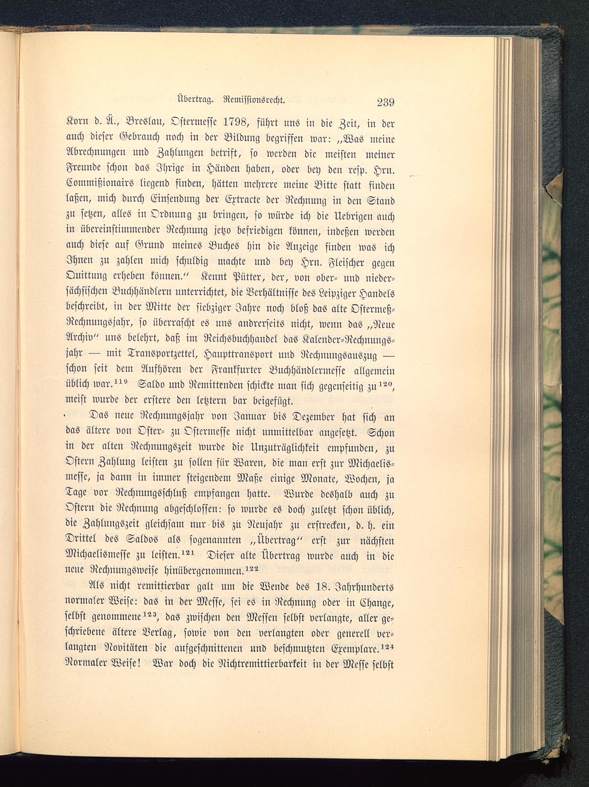 Korn d. Ä., Breslau , Ostermcsse 1798, führt uns in die Zeit, in derauch dieser Gebrauch noch in der Bildung begriffen war: „Was meineAbrechnungen und Zahlungen bctrift, so werden die meisten meinerFreunde schou das Ihrige in Händen haben, oder bey den resp. Hrn.Commißionairs liegend finden, hätten mehrere meine Bitte statt findenlaßen, mich durch Einsendung der Extracte der Rechnung in den Standzu setzen, alles in Ordnung zu bringen, so würde ich die Ucbrigen auchin übereinstimmender Rechnung jetzo befriedigen können, indcßcn werdenauch diese auf Grund meines Buches hin die Anzeige finden was ichIhnen zu zahlen mich schuldig machte und bey Hrn. Fleischer gegenQuittung erheben können." Kennt Püttcr, der, von ober- und nieder-sächsischen Buchhändlern unterrichtet, die Verhältnisse des Leipziger Handelsbeschreibt, in der Mitte der siebziger Jahre noch bloß das alte Ostermcß-Rcchnungsjahr, so überrascht es uns andrerseits nicht, wenn das „NeueArchiv" uns belehrt, daß im Rcichsbuchhandcl das Kalender-Rechnungs-jahr — mit Transportzcttel, Haupttransport und Rechnungsauszug —schon seit dem Aufhören der Frankfurter Buchhündlermesse allgemeinüblich war."^ Saldo und Remittcndcn schickte man sich gegenseitig zu^",meist wurde der erstere den letztern bar beigefügt.