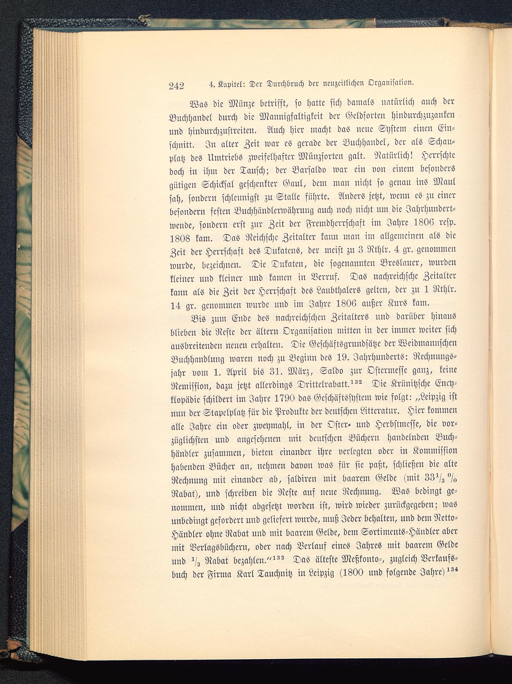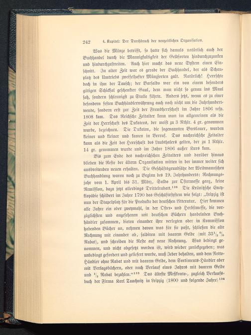 Bis zum Ende des nachreichschcn Zeitalters und darüber hinausblieben die Neste der altern Organisation mitten in der immer weiter sichausbreitenden neuen erhalten. Die Gcschäftsgruudsätzc der WcidmannschenBuchhandlung waren noch zu Beginn des 19. Jahrhunderts: Rechnungs-jahr vom 1. April bis 31. März, Saldo zur Ostcrmessc ganz, keineRemission, dazu jetzt allerdings Drittclrabatt.^ Die Krünitzsche Ency-klopttdic schildert im Jahre 1790 das Gcschäftssystcm wie folgt: „Leipzig istnun der Stapelplatz für die Produkte der deutschen Littcratur. Hier kommenalle Jahre ein oder zweymahl, in der Oster- und Herbstmesse, die vor-züglichsten und angesehenen mit deutschen Bücheru handelnden Buch-händler zusammen, bieten einander ihre verlegten oder in Kommissionhabenden Bücher an, nehmen davon was für sie paßt, schließen dic alteRechnung mit einander ab, saldiren mit baarem Oelde (mit 33^/z °/„Rabat), und schreiben die Neste auf neue Rechnung. Was bedingt ge-nommen, und nicht abgesetzt worden ist, wird wieder zurückgegeben; wasunbedingt gefordert und geliefert wurde, muß Jeder behalten, und dem Nctto-Händler ohne Rabat und mit baarem Gelde, dem Sortimcnts-Händlcr abermit Verlagsbüchern, oder nach Verlauf eines Jahres mit baarem Geldeund Rabat bezahlen."^ Das älteste Meßkonto-, zugleich Verkaufs-buch der Firma Karl Tauchnitz in Leipzig (1800 und folgende Jahre) ^
