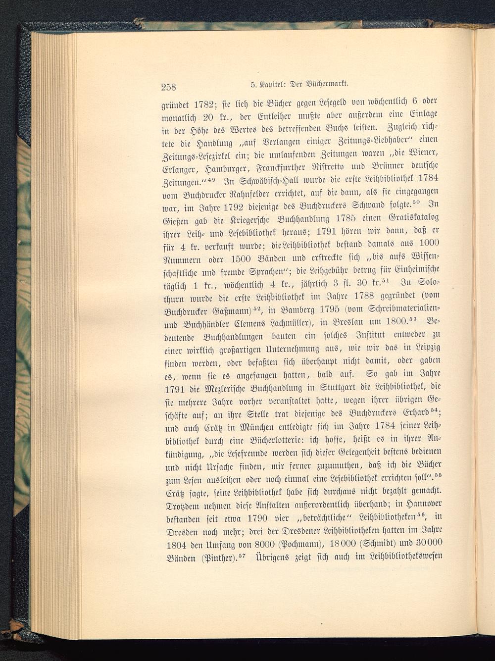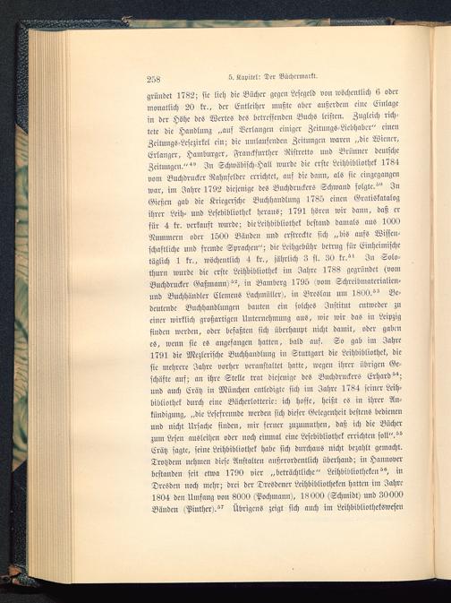 gründet 1783; sie lieh die Bücher gegen Lcsegeld von wöchentlich 6 odermonatlich 20 kr., der Entleiher mußte aber außerdem eine Einlagein der Höhe des Wertes des betreffenden Buchs leisten. Zugleich rich-tete die Handlung „auf Verlangen einiger Zcituugs-Liebhaber" einenZcitungs-Lcsczirkcl ein; die umlcmfendcu Zeitungen waren „die Wiener,Erlaugcr, Hamburger, Franckfnrthcr Ristrctto und Brüuncr deutscheZeitungen."^ In Schwäbisch-Hall wurde die erste Leihbibliothek 1784vom Buchdrucker Nahnfcldcr errichtet, auf die dann, als sie eingegangenwar, im Jahre 1792 diejenige des Buchdruckers Schwaud folgtet" JuGießen gab die Kricgcrsche Buchhandlung 1785 einen Gratiskatalogihrer Leih- und Lescbibliothek heraus; 1791 hören wir dauu, daß erfür 4 kr. verkauft wurde; die Leihbibliothek bestand damals aus 1000Nummern oder 1500 Banden und erstreckte sich „bis aufs Wissen-schaftliche uud fremde Sprachen"; die Leihgebühr betrug für Einheimischetäglich 1 kr., wöchentlich 4 kr., jährlich 3 sl. 30 kr." In Solo-thurn wurde die erste Leihbibliothek im Jahre 1788 gegründet (vomBuchdrucker Gaßmann) ^, in Bamberg 1795 (vom Schrcibmaterialien-und Buchhändler Clemens Lachmüllcr), in Breslau um 1800.^ Be-deutende Buchhandlungen bauten ein solches Institut entweder zueiner wirklich großartigen Unternehmung aus, wie wir das iu Leipzig finden werden, oder befaßten sich überhaupt nicht damit, oder gabenes, wenn sie es angefangen hatten, bald ans. So gab im Jahre1791 die Mczlcrische Buchhandlung in Stuttgart die Leihbibliothek, diesie mehrere Jahre vorher veranstaltet hatte, wegen ihrer übrigen Ge-schäfte auf; an ihre Stelle trat diejenige des Buchdruckers Erhard^;und auch Crätz in München entledigte sich im Jahre 1784 sciucr Leih-bibliothek durch eine Bücherlottcric: ich hoffe, heißt es in ihrer An-kündigung, „die Lesefrennde werden sich dieser Gelegenheit bestens bedienenund nicht Ursache finden, mir ferner zuzumuthen, daß ich die Bücherzum Lesen auslcihcu oder noch einmal eine Lescbibliothek errichten soll"."Erütz sagte, seine Leihbibliothek habe sich durchaus nicht bezahlt gemacht.Trotzdem nehmen diese Anstalten außerordentlich überhand; in Hannover bestanden seit etwa 1790 vier „beträchtliche" Leihbibliotheken^, inDresden noch mehr; drei der Dresdener Leihbibliotheken hatten im Jahre1804 den Umfang von 8000 (Pochmann), 18000 (Schmidt) und 30000Bänden (Pinthcr).^ Übrigens zeigt sich anch im Leihbibliothckswcscn