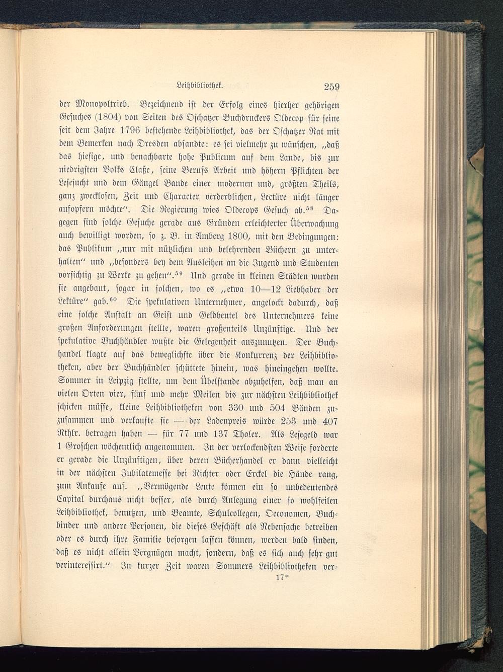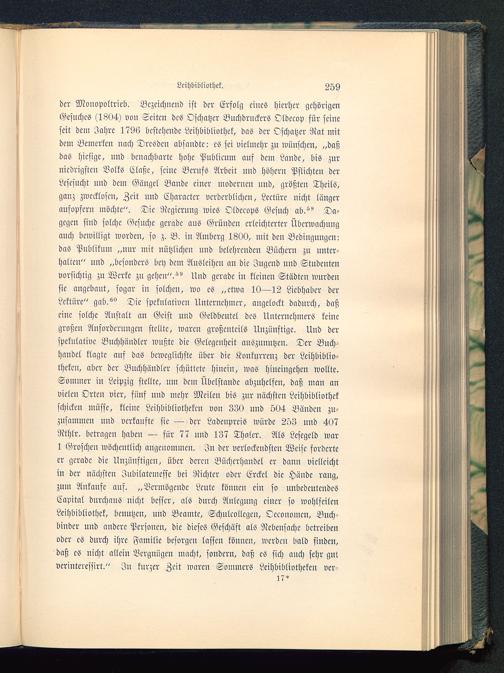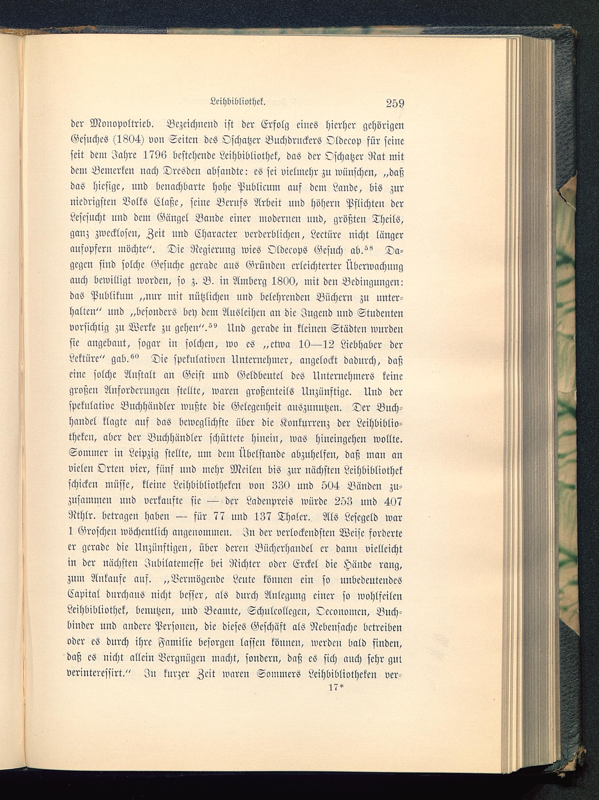 der Monopoltrieb. Bezeichnend ist der Erfolg eines hierher gehörigenGesuches (1804) von Seiten des Oschatzer Buchdruckers Oldccop für seineseit dem Jahre 1796 bestehende Leihbibliothek, das der Oschatzer Rat mitdem Bemerken nach Dresden absandte: es sei vielmehr zu wünschen, „das;das hiesige, und benachbarte hohe Publicum aus dem Lande, bis zurniedrigsten Volks Claße, seine Berufs Arbeit und höhern Pflichten derLescsucht und dem Gcingcl Bande einer modernen und, größten TheilS,ganz zwecklosen, Zeit und Character verderblichen, Lcctüre nicht längeraufopfern möchte". Die Regierung wies Oldecops Gesuch ab.^ Da-gegen sind solche Gesuche gerade aus Gründen erleichterter Überwachungauch bewilligt worden, so z. B. in Ilmberg 1800, mit den Bedingungen:das Publiknm „nur mit nützlichen nnd belehrenden Büchern zu unter-halten" und „besonders bcy dem Ausleihen an die Jugend und Studentenvorsichtig zu Werte zu gehen".Und gerade in kleinen Städten wurdensie angebaut, sogar in solchen, wo es „etwa 10—12 Liebhaber derLektüre" gab.''" Die spekulativen Unternehmer, angelockt dadurch, daßeine solche Anstalt an Geist und Geldbeutel des Unternehmers keinegroßen Anforderungen stellte, waren großenteils Unzünftigc. Und derspekulative Buchhändler wußte die Gelegenheit auszunutzen. Der Buch-handel klagte auf das beweglichste über die Konkurrenz der Leihbiblio-theken, aber der Buchhändler schüttete hiuciu, was hineingehen wollte.Sommer in Leipzig stellte, um dem Übclstandc abzuhelfen, daß man anvielen Orten vier, fünf und mehr Meilen bis zur nächsten Leihbibliothekschicken müsse, kleine Leihbibliotheken von 330 und 504 Bänden zu-zusammcu und verkaufte sie — der Ladenpreis würde 253 und 407Rthlr. betragen haben — für 77 und 137 Tholer. Als Lescgeld war1 Groschen wöchentlich angenommen. In der verlockendsten Weise forderteer gerade die Unzünftigcn, über deren Büchcrhcmdcl er dann vielleichtin der nächsten Jnbilatcmcsse bei Richter oder Erckcl die Hände rang,zum Ankaufe auf. „Vermögende Leute können ein so unbedeutendesCapital durchaus uicht besser, als durch Anlegung einer so wohlfeilenLeihbibliothek, benutzen, nud Beamte, Schulcollcgcu, Occonomcn, Buch-binder und andere Personen, die dieses Geschäft als Nebensache betreibenoder es durch ihre Familie besorgen lassen können, werden bald finden,daß cS nicht allein Vergnügen macht, sondern, daß es sich auch sehr gut