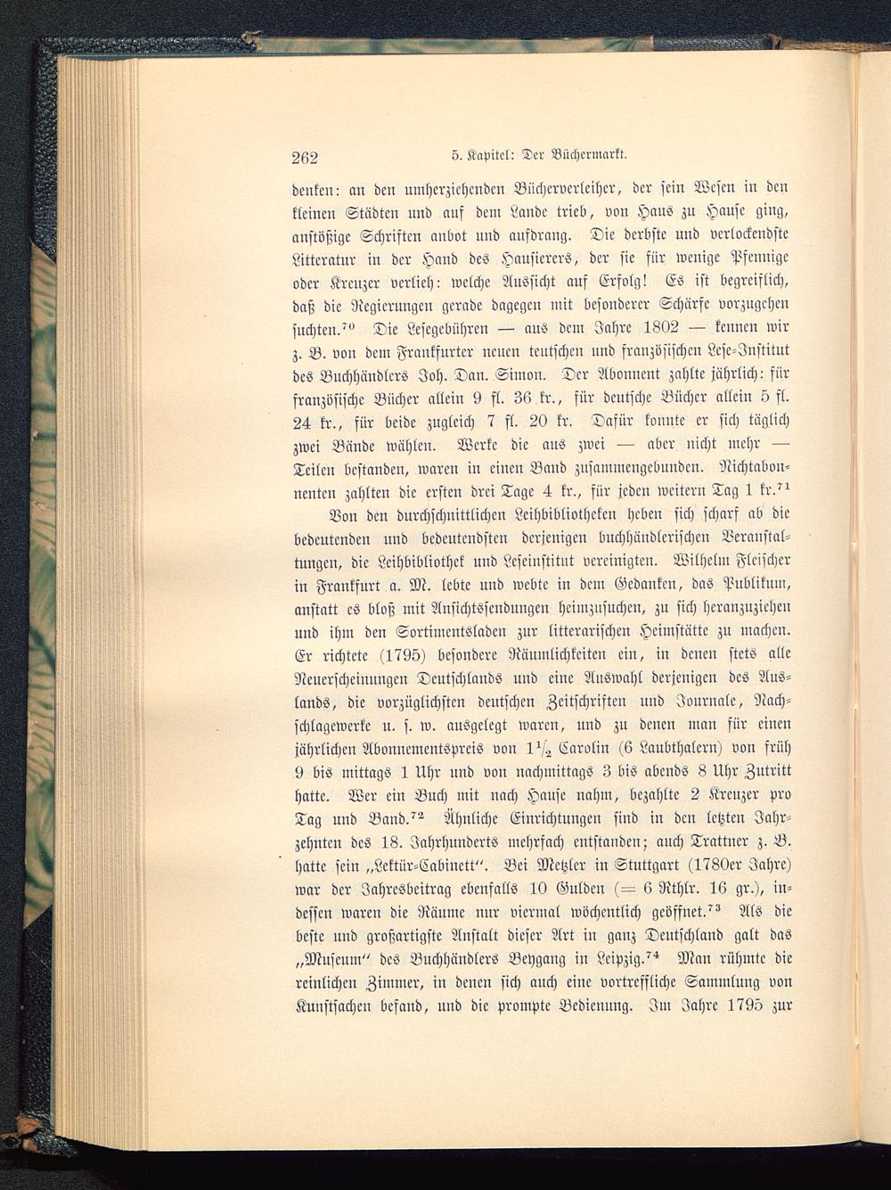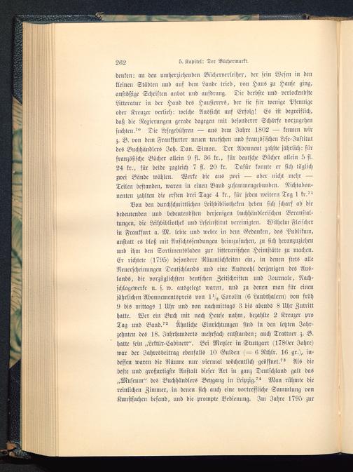 Von den durchschnittlichen Leihbibliotheken hcbeu sich schars ab diebedeutenden und bedeutendsten derjenigen buchhändlcrischen Veranstal-tungen, die Leihbibliothek und Lcscinstitut vereinigten. Wilhelm Fleischerin Frankfurt a. M. lebte und webte in dein Gedanken, das Publikum,anstatt es bloß mit Ansichtssendungen heimzusuchen, zu sich heranzuziehenund ihm den Sortimcntsladen zur littcrarischen Heimstätte zu machen.Er richtete (1795) besondere Räumlichkeiten ein, in denen stets alleNeuerscheinungen Deutschlands und eine Auswahl derjenigen des Aus-lands, die vorzüglichsten deutschen Zeitschriften nnd Journale, Nach-schlagewerke u. s. w. ausgelegt waren, und zu denen man für einenjährlichen Abonnementspreis von l^ Carolin (6 Laubthaleru) von früh9 bis mittags 1 Uhr und von nachmittags 3 bis abends 8 Uhr Zutritthatte. Wer ein Buch mit nach Hause nahm, bezahlte 2 Kreuzer proTag und Baud/2 Ähnliche Einrichtungen sind in den letzten Jahr-zehnten des 18. Jahrhunderts mehrfach entstanden; auch Trattner z. B.hatte sein „Lektür-Cabinctt". Bei Metzler in Stuttgart (1780er Jahre)war der Jahresbeitrag ebenfalls 10 Gulden (^ 6 Rthlr. 16 gr.), in-dessen waren die Räume nur viermal wöchentlich geöffnet.^ Als diebeste und großartigste Anstalt dieser Art in ganz Deutschland galt das„Museum" des Buchhändlers Beygcmg in Leipzig. ^ Man rühmte diereinlichen Zimmer, in denen sich auch eine vortreffliche Sammlung vonKuustsacheu befand, und die prompte Bedienung. Im Jahre 1795 zur