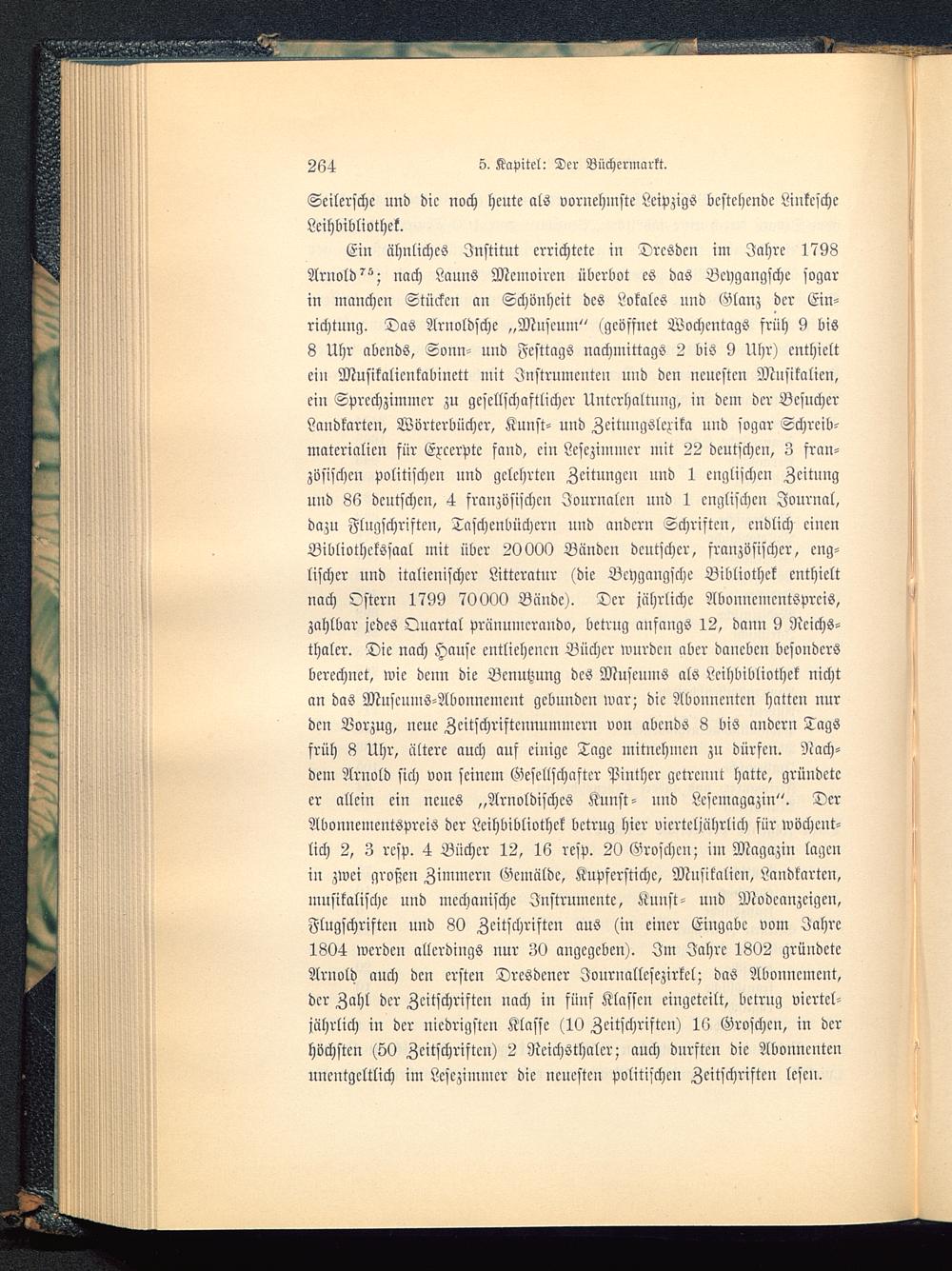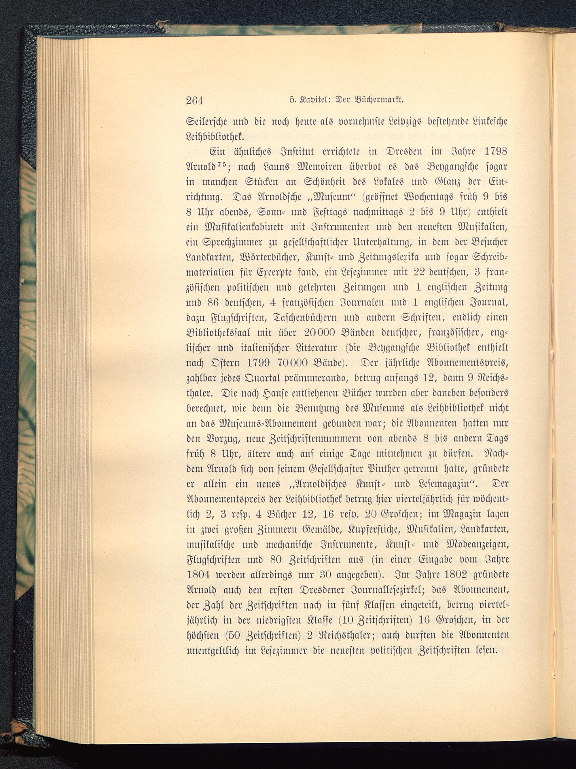 Ein ähnliches Institut errichtete in Dresden im Jahre 1798Arnold^; nach Launs Memoiren überbot es das Bcygangsche sogarin manchen Stücken an Schönheit des Lokales und Glanz der Ein-richtung. Das Arnoldschc „Museum " (geöffnet Wochentags früh 9 bis8 Uhr abends, Sonn- und Festtags nachmittags 2 bis 9 Uhr) enthieltein Musikalicnkabinett mit Instrumenten und den neuesten Musikalien,ein Sprechzimmer zu gesellschaftlicher Unterhaltung, in dem der BesucherLandkarten, Wörterbücher, Kunst- und Zeitnngslcrika und sogar Schreib-materialien für Excerptc fand, ein Lesezimmer mit 22 deutschen, 3 fran-zösischen politischen und gelehrten Zeitungen und 1 englischen Zeitungund 86 deutschen, 4 französischen Journalen und 1 englischen Journal,dazu Flugschriften, Taschenbüchern und andern Schriften, endlich einenBibliothelösaal mit über 20000 Bänden deutscher, französischer, eng-lischer und italienischer Littcratur (die Bcygangsche Bibliothek enthieltnach Oster» 1799 70000 Bände). Der jährliche Abonncmcntsprcis,zahlbar jedes Qnartal pränumerando, betrug anfangs 12, dann 9 Ncichs-thaler. Dic nach Hause entliehenen Bücher wurden aber daneben besondersberechnet, wie denn die Benutzung des Muscnms als Leihbibliothek nichtan das Muscums-Abonnemcnt gebunden war; dic Abonnenten hatten nurden Vorzug, neue Zcitschriftcunummcrn von abends 8 bis andern Tagsfrüh 8 Uhr, ältere auch auf eiuigc Tage mitnehmen zn dürfen. Nach-dem Arnold sich von scincm Gesellschafter Pinther getrennt hatte, gründeteer allem ein neues „Arnoldischcs Kunst- und Lcsemagazin". DerAbonuemcntspreiS der Leihbibliothek bctrng hier vierteljährlich für wöchent-lich 2, 3 rcsp. 4 Bücher 12, 16 resp. 20 Groschen; im Magazin lagenin zwei großen Zimmern Gemälde, Kupferstiche, Musikalien, Landkarten,musikalische uud mechanische Instrumente, Kunst- und Modcanzcigen,Flugschriften und 80 Zeitschriften aus (in einer Eingabe vom Jahre1804 werden allerdings nur 30 angegeben). Im Jahre 1802 gründeteArnold auch den ersten Dresdener Jonruallcsezirkcl; das Abonnement,der Zahl dcr Zeitschriften nach in fünf Klassen eingeteilt, betrug viertel-jährlich iu dcr uicdrigsten Klasse (10 Zeitschriften) 16 Groschen, in derhöchsten (50 Zeitschriften) 2 Neichsthalcr; auch durften dic Abonnentenunentgeltlich im Lesezimmer die neuesten politischen Zeitschriften lesen.