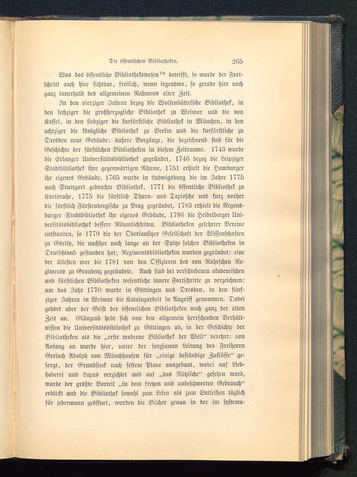 In den vierziger Jahren bezog die Wolscnbüttclschc Bibliothek, inden sechziger die großhcrzogliche Bibliothek zu Weimar und die vonKassel, in den siebziger die kurfürstliche Bibliothek in München , in denachtziger die königliche Bibliothek zu Berlin und die kurfürstliche zuDresden neue Gebäude: äußere Vorgänge, die bezeichnend sind für dieGeschichte der fürstlichen Bibliotheken in diesem Zeiträume. 1743 wurdedie Erlangcr Universitätsbibliothek gegründet, 1746 bezog die Leipziger Stadtbibliothck ihre gegenwärtigen Räume, 1751 erhielt die Hamburgerihr eigenes Gebäude, 1765 wurde in Ludwigsburg die im Jahre 1775nach Stuttgart gebrachte Bibliothek, 1771 die öffentliche Bibliothek zuKarlsruhe , 1775 die fürstlich Thurn- und Taxissche und kurz vorherdie fürstlich Fllrstcnbcrgische zu Prag gegründet, 1783 erhielt die Ncgcns-burgcr Stadtbibliothck ihr eigenes Gebäude, 1786 die Heidelberger Uni-versitätsbibliothek bessere Räumlichkeiten. Bibliotheken gelehrter Vereineentstanden, so 1779 die der Oberlausitzer Gesellschaft der Wissenschaftenzu Görlitz , die nachher noch lange an der Spitze solcher Bibliotheken inDeutschland gestanden hat; Rcgimcntsbibliothetcn wurden gegründet: eineder ältesten war die 1781 von den Offizieren des von Rohrschen Re-giments zu Graudeuz gegründete. Auch sind bei verschiedenen akademischenund fürstlichen Bibliotheken wesentliche innere Fortschritte zu verzeichnen:um das Jahr 1770 wurde in Güttingen und Dresden , in den fünf-ziger Jahren in Weimar die Katalogarbcit in Angriff genommen. Dabeigehört aber der Geist der öffentlichen Bibliotheken noch ganz der altenZeit an. Glänzend hebt sich von den allgemein herrschenden Verhält-nissen die Universitätsbibliothek zu Köttingen ab, in der Geschichte derBibliotheken als die „erste moderne Bibliothek der Welt" verehrt: vonAnsang an wurde hier, unter der sorgsamen Leitung des FrcihcrrnGerlach Adolph von Münchhausen für „einige beständige Zuflüsse" ge-sorgt, der Grundstock nach festem Plane ausgebaut, wobei auf Lieb-haberei und Luxus verzichtet uud auf „das Nützliche" gesehen ward,wurde der größte Vorteil „in dem frcyen und unbeschwerten Gebrauch"erblickt uud die Bibliothek sowohl zum Lesen als zum Entleihen täglichfür jedermann geöffnet, wurden die Bücher genau in der im systcina-