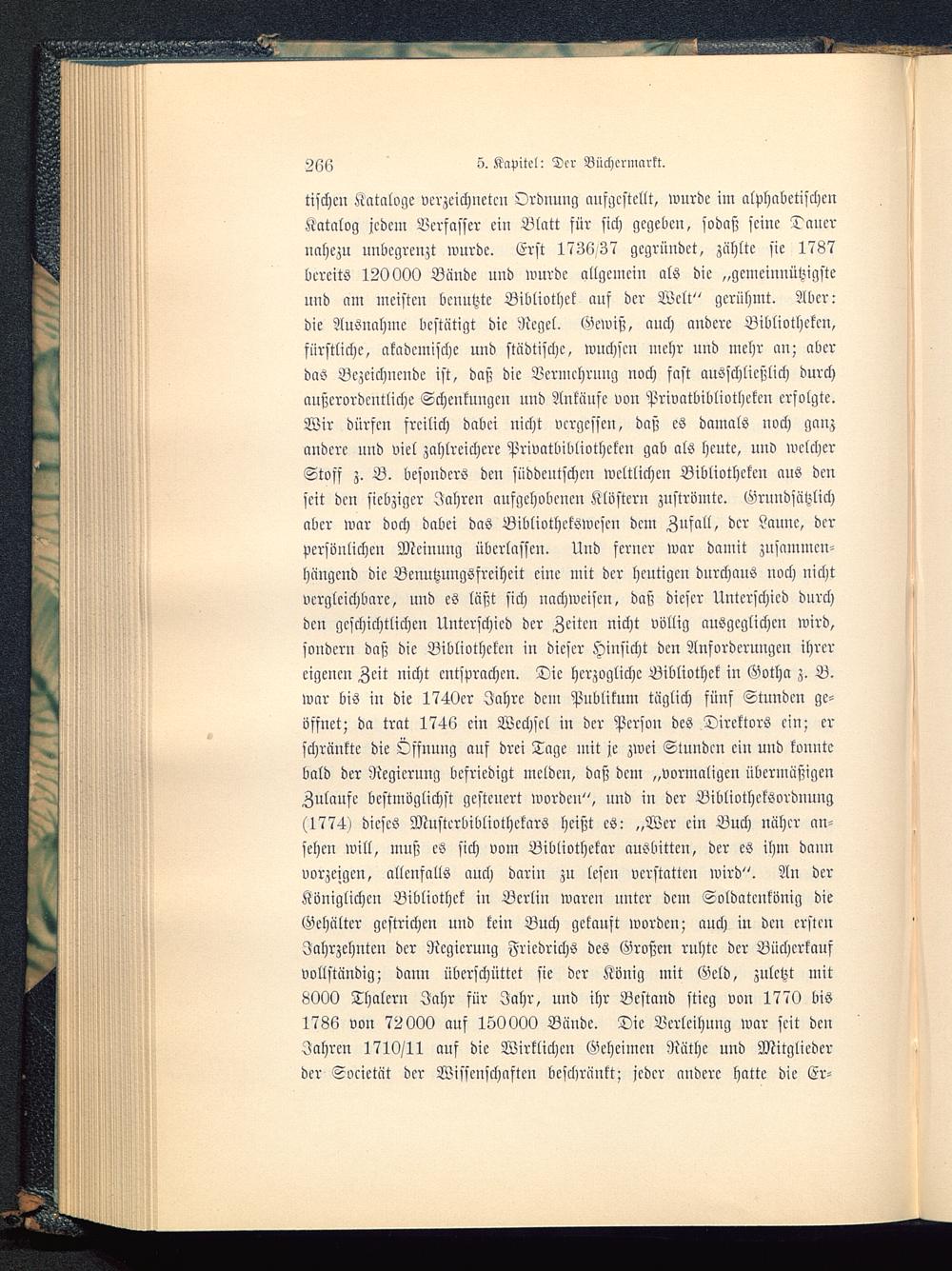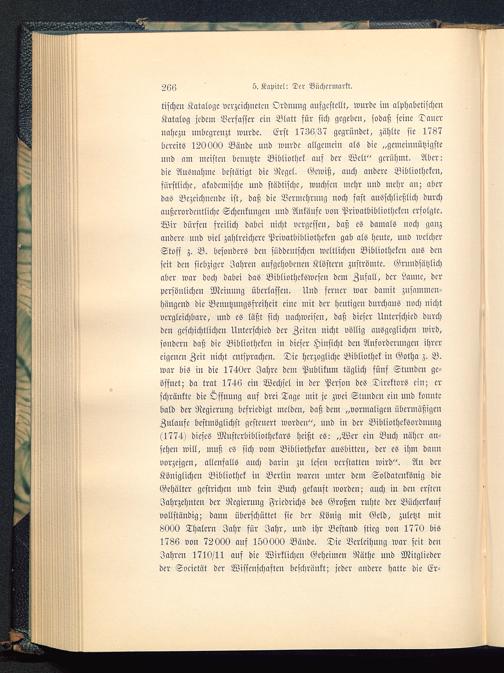 tischen Kataloge verzeichnete» Ordnung aufgestellt, wurde im alphabetischenKatalog jedem Verfasser ein Blatt für sich gegeben, sodaß seine Dauernahezu unbegrenzt wurde. Erst 1736.37 gegründet, zählte sie 1787bereits 120000 Bände und wurde allgemein als die „gemeinnützigsteund am meisten benutzte Bibliothek auf der Welt" gerühmt. Aber:die Ausnahme bestätigt die Regel. Gewiß, auch andere Bibliotheken,fürstliche, akademische und städtische, wuchsen mehr und mehr an; aberdas Bezeichnende ist, daß die Vermehrung noch fast ausschließlich durchaußerordentliche Schenkungen und Anläufe von Privatbibliotheken erfolgte.Wir dürfen freilich dabei nicht vergessen, daß es damals noch ganzandere und viel zahlreichere Privatbibliothclen gab als heute, und welcherStoff z. B. besonders den süddeutschen weltlichen Bibliotheken aus denseit den siebziger Jahren aufgchobeucu Klöstern zuströmte. Grundsätzlichaber war doch dabei das Bibliothekswesen dem Zufall, dcr Laune, dcrpersönlichen Mcinung überlassen. Und ferner war damit zusammen-hängend die Benutzungsfreiheit eine mit der heutigen durchaus uoch nichtvergleichbare, und es läßt sich nachweisen, daß dieser Unterschied durchden geschichtlichen Unterschied der Zeiten nicht völlig ausgeglichen wird,sondern daß die Bibliotheken in dieser Hinsicht den Anforderungen ihrereigenen Zeit nicht entsprachen. Die herzogliche Bibliothek in Gotha z. B.war bis in die 1740er Jahre dem Publikum täglich fünf Stunden ge-öffnet; da trat 1746 ein Wechsel in der Person des Direktors ein; erschränkte die Öffnung auf drei Tage mit je zwei Stunden ein uud konntebald der Regierung befriedigt mcldeu, daß dem „vormaligcu übermäßigenZulaufe bestmöglichst gesteuert wordeu", und in der Bibliotheksoronung(1774) dieses Musterbibliothetars heißt es: „Wer ein Buch näher an-sehen will, muß es sich vom Bibliothekar ausbittcu, der es ihm dannvorzeigen, allenfalls auch darin zu lesen »erstatten wird". An dcrKöniglichen Bibliothck in Berlin waren unter dem Soldatcnkönig dieGehälter gestrichen und kein Buch gekauft worden; auch in den erstenJahrzehnten dcr Regierung Friedrichs des Großen ruhte der Büchcrkcmfvollständig; dann überschüttet sie dcr König mit Geld, zuletzt mit8000 Thalern Jahr für Jahr, und ihr Bestand stieg von 1770 bis1786 vou 72000 auf 150000 Bäude. Die Verleihung war seit dcnJahren 1710/11 auf die Wirklichen Geheimen Näthc und Mitgliederder Societät dcr Wisscnschaftcu beschränkt; jeder andere hatte die Er-