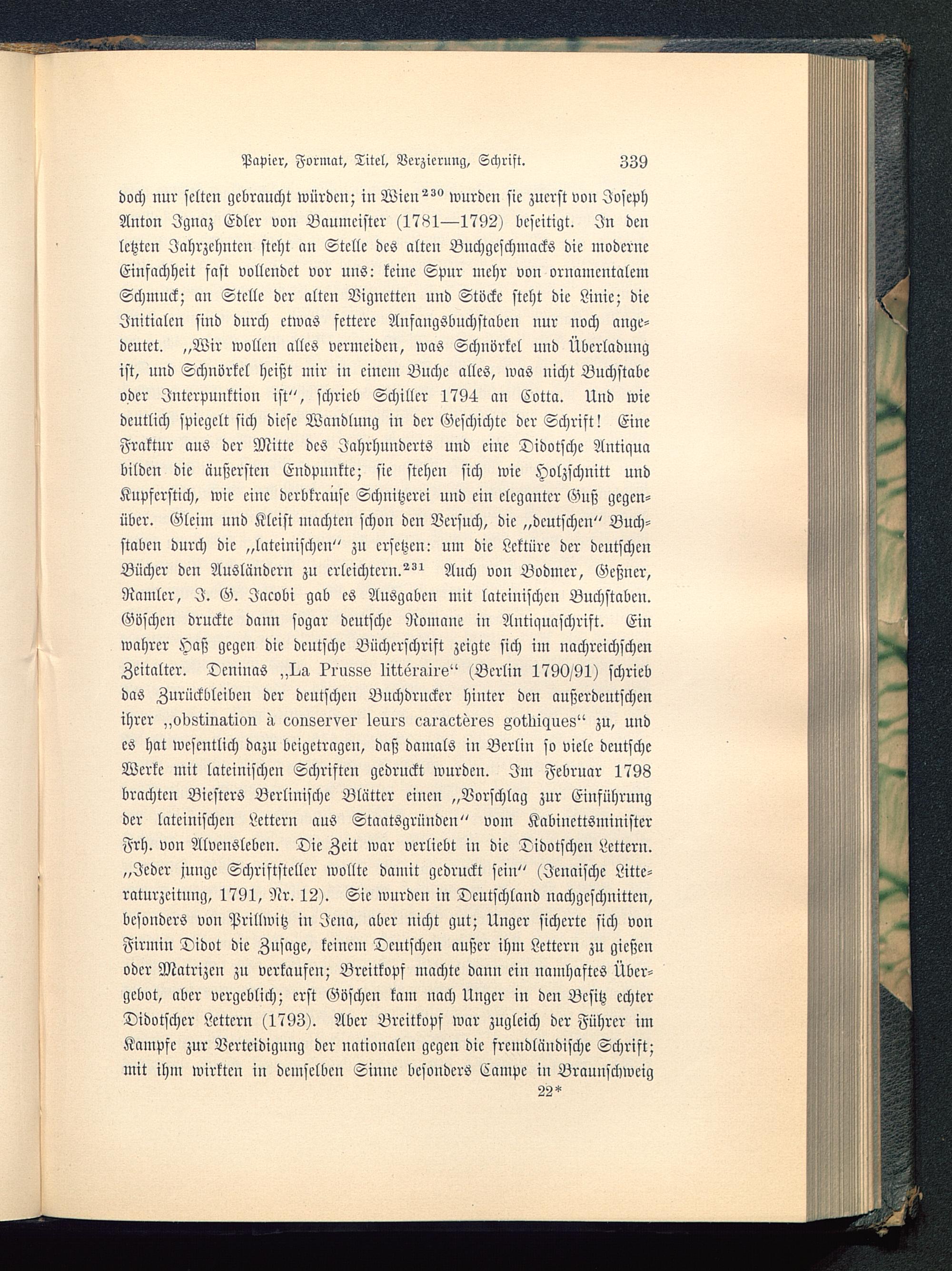 doch nur selten gebraucht würden; in Wien wurden sie zuerst vou JosephAnton Jgnaz Edler von Baumeister (1781—1792) beseitigt. In denletzten Jahrzehnten steht an Stelle des alten Buchgcschmacks die moderneEinfachheit fast vollendet vor uns: keine Spur mehr vou ornamentalemSchmuck; an Stelle der alten Vignetten und Stöcke steht die Linie; dieInitialen sind durch etwas fettere Aufaugsbuchstabeu uur uoch auge-deutet. „Wir wollen alles vermeiden, was Schnörkel und Überladungist, und Schnörkel heißt mir in einem Buche alles, was nicht Buchstabeoder Interpunktion ist", schrieb Schiller 1794 an Cotta. Und wiedeutlich spiegelt sich diese Wandlung in der Geschichte der Schrift! EineFraktur aus der Mitte des Jahrhuudcrts und eine Didotschc Antiguabilden die äußersten Endpunkte; sie stehen sich wie Holzschnitt undKupferstich, wie eine derbkrausc Schnitzerei und ein eleganter Guß gegen-über. Gleim und Kleist machten schon den Versuch, die „deutschen" Buch-staben durch die „lateinischen" zu ersetzen: um die Lektüre der deutschen Bücher den Ausländern zu erleichtern.^ Auch von Boviner, Geßner,Ramlcr, I. G. Jcicobi gab es Ausgaben mit lateinischen Buchstaben.Göschen druckte daun sogar deutsche Romane in Antiquaschrift. Einwahrer Haß gegen die deutsche Büchcrschrift zeigte sich im nachreichschenZeitalter. Deninas „I,a krusss littörail«" (Berlin 1790/91) schriebdas Zurückbleiben der deutschen Buchdrucker hinter den außerdeutschenihrer „odst-ination ^ eonssrvsr leurs eÄi'g.etöi'ös Mtliiquss" zu, undes hat wesentlich dazu beigetragen, daß damals in Berlin so viele deutscheWerke mit lateinischen Schriften gedruckt wurden. Im Februar 1798brachten Biesters Berlinische Blätter einen „Vorschlag zur Entführungder lateinischen Lettern aus Staatsgrüudeu" vom KabinettsministerFrh. von Alvcuslebeu. Die Zeit war verliebt in die Tidotschen Lettern.„Jeder junge Schriftsteller wollte damit gedruckt sein" (Jenaische Litte-raturzcitung, 1791, Nr. 12). Sic wurden in Deutschland nachgeschnitten,besonders von Prillwitz in Jena, aber nicht gut; Unger sicherte sich vonFirmin Didot die Zusage, keinem Deutschen außer ihm Lettern zu gießenoder Matrizen zu verkaufen; Breitkopf machte dann ein namhaftes Über-gcbot, aber vergeblich; erst Göschen kam uach Unger in den Besitz echterDidotschcr Lettern (1793). Aber Breitkopf war zugleich der Führer imKampfe zur Verteidigung der nationalen gegen die fremdländische Schrift;mit ihm wirkten in demselben Sinne besonders Campe in Brauuschweig