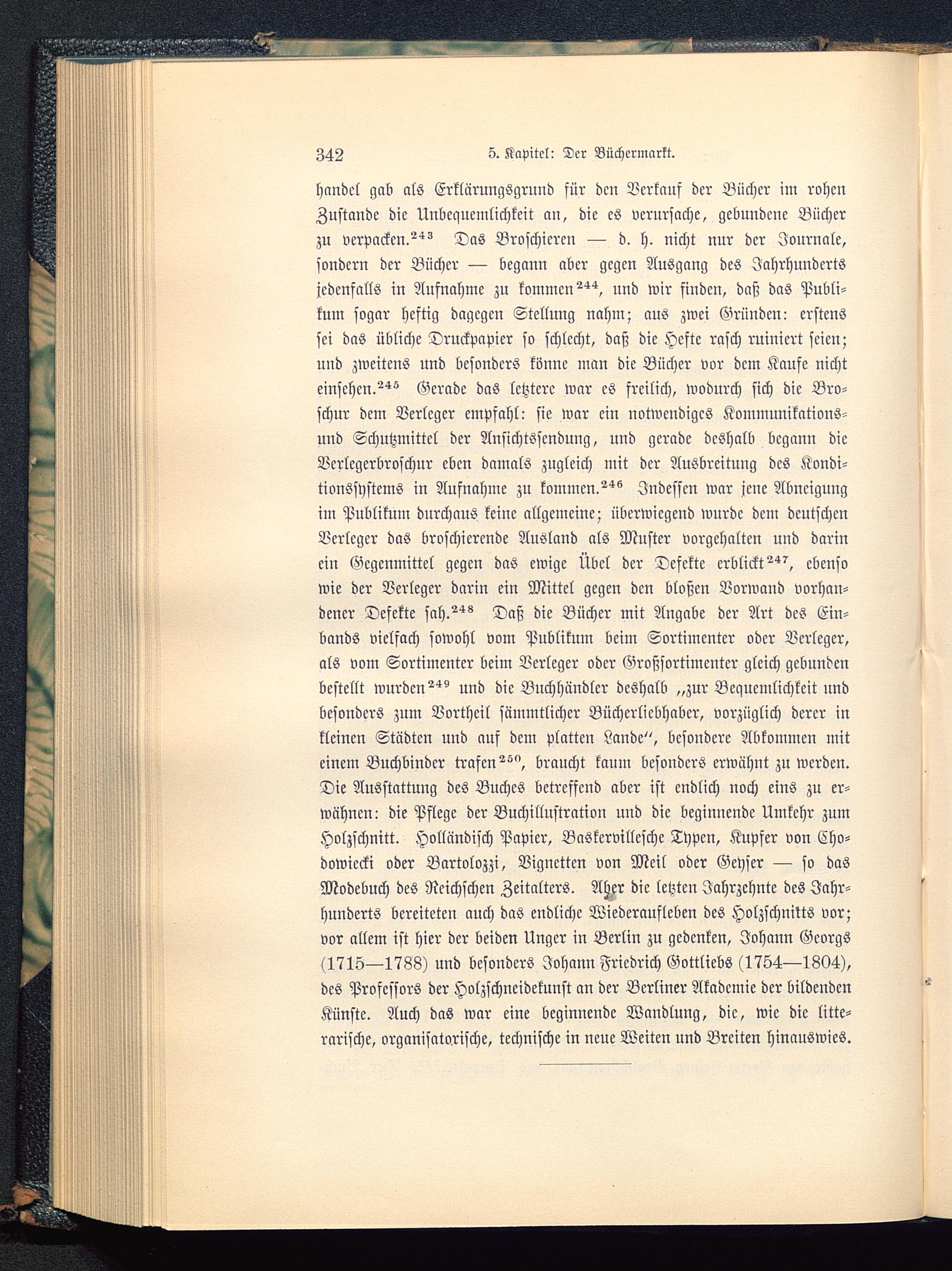 Handel gab als Erklärungsgrund für den Berkauf der Bücher im rohenZustande die Unbequemlichkeit an, die es verursache, gebundene Bücherzu verpacken.^ Das Broschieren — d. h. nicht nur der Journale,sondern der Bücher — begann aber gegen Ausgang des Jahrhundertsjedenfalls in Aufnahme zu kommen^, ^d wir finden, daß das Publi-kum sogar heftig dagegen Stellung nahm; aus zwei Gründen: erstenssei das übliche Druckpapier so schlecht, daß die Hefte rasch ruiniert seien;und zweitens und besonders könne man die Bücher vor dem Kaufe nichteinschen.^6 Gerade das letztere war es freilich, wodurch sich die Bro-schur dem Verleger empfahl: sie war ein notwendiges Kommunikations-und Schutzmittel der Ansichtssendung, und gerade deshalb begann dieVerlegerbroschur eben damals zugleich mit der Ausbreitung des Kondi-tionssystems in Aufnahme zu kommen.^ Indessen war jene Abneigungim Publikum durchaus keine allgemeine; überwiegend wurde dem deutschenVerleger das broschierende Ausland als Muster vorgehalten und darinein Gegenmittel gegen das ewige Übel der Defekte erblickt^, ebensowie der Verleger darin ein Mittel gegen den bloßen Vorwand vorhan-dener Defekte sah.^» Daß die Bücher mit Angabe der Art des Ein-bands vielfach sowohl vom Publikum beim Sortimenter oder Verleger,als vom Sortimenter beim Verleger oder Großsortimcnter gleich gebundenbestellt wurden 2" und die Buchhändler deshalb „zur Bequemlichkeit undbesonders zum Vorthcil sämmtlicher Bücherlicbhaber, vorzüglich derer inkleinen Städten und auf dem platten Lande", besondere Abkommen miteinem Buchbinder trafen^", braucht kaum besonders erwähnt zu werden.Die Ausstattung des Buches betreffend aber ist endlich noch eins zu er-wähnen: die Pflege der Buchillustration und die beginnende Umkehr zumHolzschnitt. Holländisch Papier, Baskervillesche Typen, Kupfer von Cho-dowiccki oder Bartolozzi, Vignetten von Mcil oder Geyser — so dasModebuch des Rcichschen Zeitalters. Al^er die letzten Jahrzehnte des Jahr-hunderts bereiteten auch das endliche Wiederaufleben des Holzschnitts vor;vor allem ist hier der beiden Unger in Berlin zu gedenken, Johann Georgs(1715—1788) und besonders Johann Friedrich Gottliebs (17S4—1804),des Professors der Holzschneidekunst an der Berliner Akademie der bildendenKünste. Auch das war eine beginnende Wandlung, die, wie die litte-rarische, organisatorische, technische in neue Weiten und Breiten hinauswies.