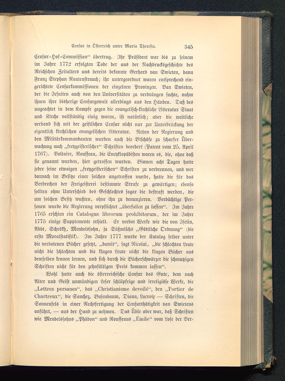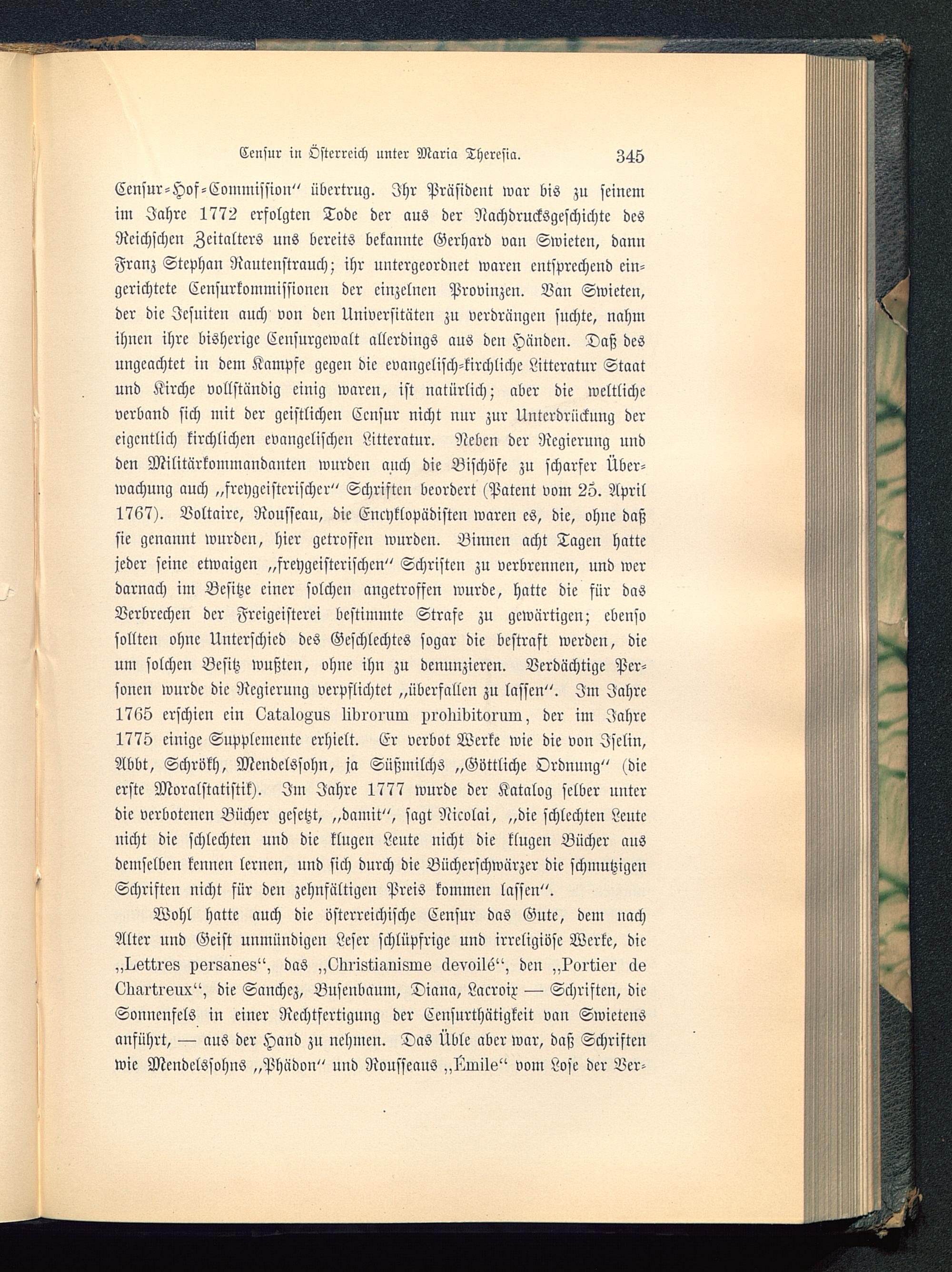 Censur-Hof-Commission" übertrug. Ihr Präsident war bis zu seinemim Jahre 1772 erfolgten Tode der aus der Nachdrucksgeschichte desRcichscheu Zeitalters uns bereits bekannte Gerhard van Swieten , dannFranz Stephan Rautcnstrauch; ihr untergeordnet waren entsprechend ein-gerichtete Censurkommissioneu der einzelnen Provinzen. Vau Swieten,der die Jesuiten auch von den Universitäten zu verdrangen suchte, nahmihnen ihre bisherige Ceusurgewalt allerdings aus den Händen. Daß desungeachtet in dem Kampfe gegeu die evangelisch-kirchliche Littcratur Staatund Kirche vollständig einig waren, ist natürlich; aber die weltlicheverband sich mit der geistlichen Censur nicht nur zur Unterdrückung dereigentlich kirchlichen evangelischen Litteratur. Neben der Regierung undden Militärkommandanten wurden auch die Bischöfe zu scharfer Über-wachung auch „freygcistcrischer" Schriften beordert (Patent vom 25. April1767). Voltaire, Rousseau , die Encyklopüdisten waren es, die, ohne daßsie genannt wurden, hier getroffen wurden. Binnen acht Tagen hattejeder seine etwaigen „freygcisterischcn" Schristcn zu verbrennen, und werdarnach im Besitze einer solchen angetroffen wurde, hatte die für dasVerbrechen der Freigeistern bestimmte Strafe zu gewärtigen; ebensosollten ohne Unterschied des Geschlechtes sogar die bestraft werden, dieum solchen Besitz wußten, ohne ihn zu denunzieren. Verdächtige Per-sonen wurde die Regierung verpflichtet „überfallen zu lassen". Im Jahre1765 erschien ein LgMvAus lidioiuw i>i oiiibiwi um, der im Jahre1775 einige Supplemente erhielt. Cr verbot Werke wie die von Jselin,Abbt, Schrökh, Mendelssohn, ja Süßmilchs „Göttliche Ordnung" (dieerste Moralstatistik). Im Jahre 1777 wurde der Katalog selber unterdie verbotenen Bücher gesetzt, „damit", sagt Nicolai, „die schlechten Leuteuicht die schlechten und die klugen Leute nicht die klugen Bücher ausdemselben kennen lernen, und sich durch die Bücherschwärzer die schmutzigenSchriften nicht für den zehnfältigen Preis kommen lassen".