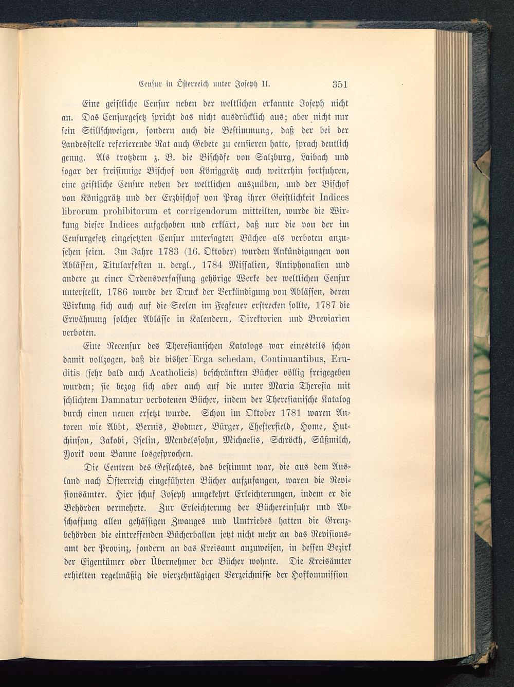 Eine Reccnsur des Theresianischen Katalogs war einesteils schondamit vollzogen, daß die bisher Di-M sensäain, Lontiiumntidus, Liu-Mis (sehr bald auch ^.catlwliois) beschränkten Bücher völlig freigegebenwurden; sie bezog sich aber auch auf die unter Maria Theresia mitschlichtem Oktwimtur verbotenen Bücher, indem der Thcresianische Katalogdurch einen neuen ersetzt wurde. Schon im Oktober 1781 waren Au-toren wie Abbt, Bernis, Bodmer, Bürger, Chesterfield, Home, Hut-chinson, Jakobi, Jsclin, Mendelssohn, Michaelis, Schröck!), Süßmilch,Aorik vom Banne losgesprochen.