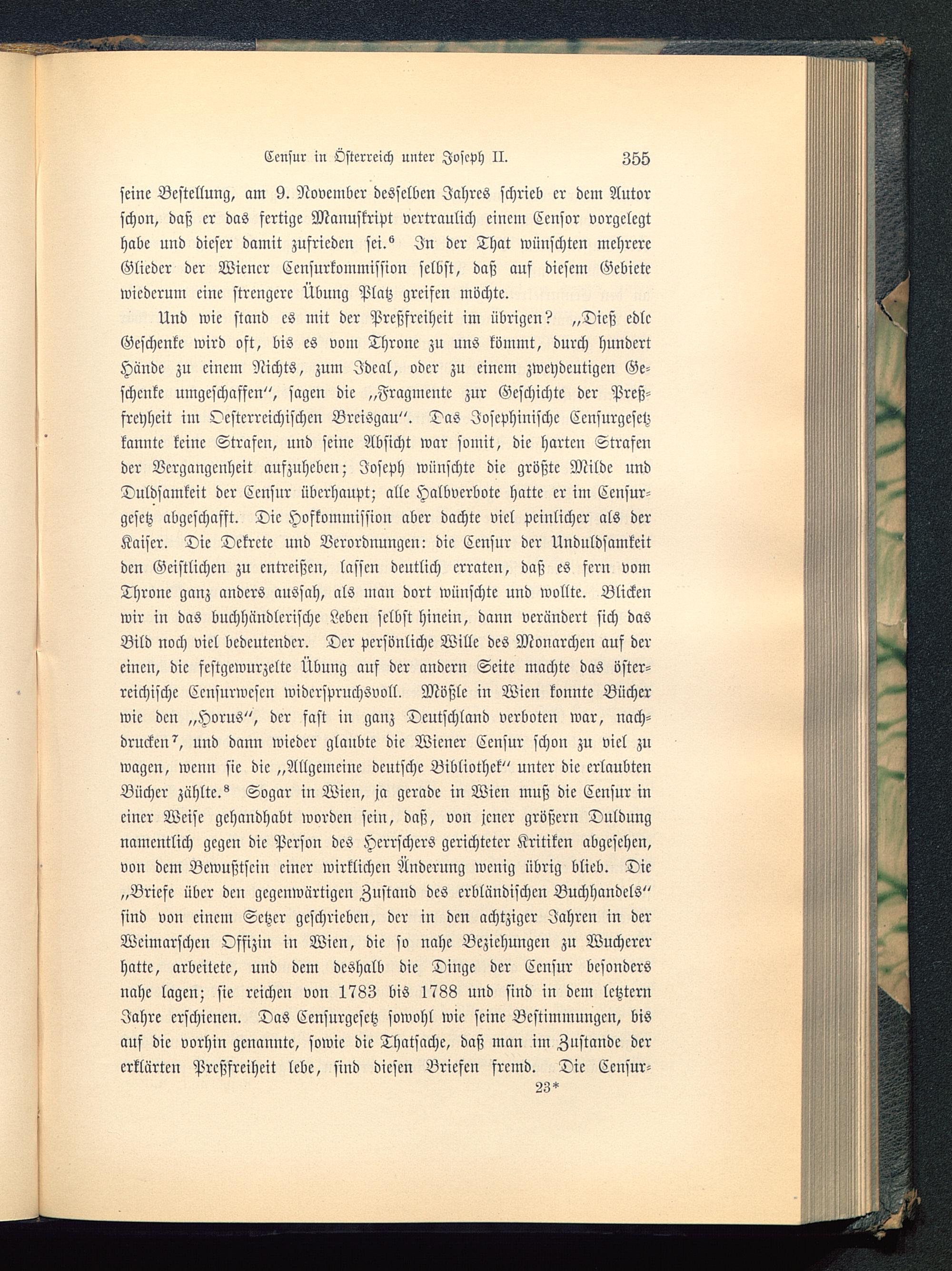 Und wie stand es mit der Preßfreiheit im übrigen? „Dicß edleGeschenke wird oft, bis es vom Throne zu uns kömmt, durch hundertHände zu einem Nichts, zum Ideal, oder zu einem zweydeutigen Ge-schenke umgeschasfen", sagen die „Fragmente zur Geschichte der Preß-freyheit im Oesterreichischen Brcisguu". Das Josephinische Censurgesetzkannte keine Strafen, und seine Absicht war somit, die harten Strafender Vergangenheit aufzuheben; Joseph wünschte die größte Milde undDuldsamkeit der Censur überhaupt; alle Halbverbote hatte er im Censur-gesetz abgeschafft. Die Hofkommission aber dachte viel peinlicher als derKaiser. Die Dekrete und Verordnungen: die Censur der Unduldsamkeitden Geistlichen zu entreißen, lassen deutlich erraten, daß es fern vomThrone ganz anders aussah, als man dort wünschte und wollte. Blickenwir in das buchhttndlcrische Leben selbst hinein, dann verändert sich dasBild noch viel bedeutender. Der persönliche Wille des Monarchen auf dereinen, die festgewurzelte Übung auf der andern Seite machte das öster-reichische Ccnsurwcscn widerspruchsvoll. Mößle in Wien konnte Bücherwie den „Horns", der fast in ganz Deutschland verboten war, nach-drucken^, und dann wieder glaubte die Wiener Censur schon zu viel zuwagen, wenn sie die „Allgemeine deutsche Bibliothek " unter die erlaubtenBücher zählte. ^ Sogar in Wien, ja gerade in Wien muß die Censur ineiner Weise gehandhabt worden sein, daß, von jener größern Duldungnamentlich gegen die Person des Herrschers gerichteter Kritiken abgesehen,von dem Bewußtsein einer wirklichen Änderung wenig übrig blieb. Die„Briefe über den gegenwärtigen Zustand des erbländischen Buchhandels"sind von einem Setzer geschrieben, der in den achtziger Jahren in derWcimarschen Offizin in Wien , die so nahe Beziehungen zu Wuchererhatte, arbeitete, und dem deshalb die Dinge der Censur besondersnahe lagen; sie reichen von 1783 bis 1788 und sind in dem letztemJahre erschienen. Das Censurgesetz sowohl wie seine Bestimmungen, bisauf die vorhin genannte, sowie die Thatsciche, daß man im Zustande der
