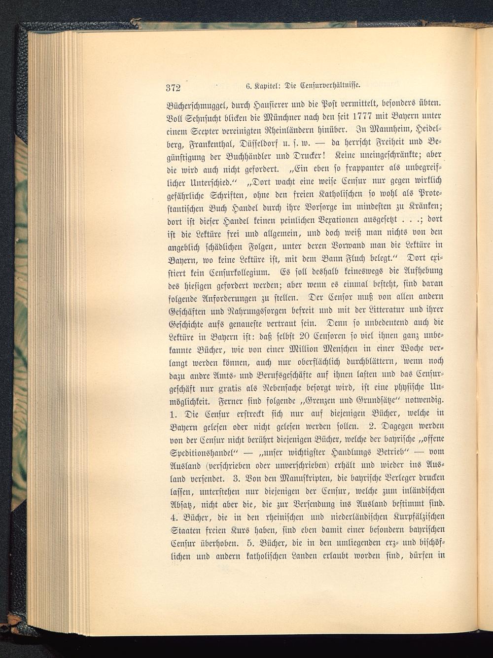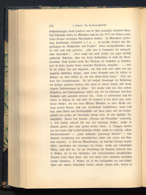 Büchcrschmuggel, durch Hausierer und die Post vermittelt, besonders übten.Voll Sehnsucht blicken die Münchner nach den seit 1777 mit Bayern untereinem Scepter vereinigten Rheinländern hinüber. In Mannheim, Heidel-berg, Frankenthal, Düsseldorf u. s. w. — da herrscht Freiheit und Be-günstigung der Buchhändler und Drucker! Keine uneingeschränkte; aberdie wird auch nicht gefordert. „Ein eben so frappanter als unbegreif-licher Unterschied." „Dort wacht eine weise Censur nur gegen wirklichgefährliche Schriften, ohne den freien Katholischen so wohl als Prote-stantischen Buch Handel durch ihre Vorsorge im mindesten zu Krünken;dort ist dieser Handel keinen peinlichen Vexationcn ausgesetzt . . .; dortist die Lektüre frei und allgemein, und doch weiß man nichts von denangeblich schädlichen Folgen, unter deren Vorwand man die Lektüre inBayern , wo keine Lektüre ist, mit dem Bann Fluch belegt." Dort exi-stiert kein Censurkollegium. Es soll deshalb keineswegs die Aufhebungdes hiesigen gefordert werden; aber wenn es einmal besteht, sind daranfolgende Anforderungen zu stellen. Der Censor muß von allen andernGeschäften und Nahrungösorgcn befreit und mit der Littcratur und ihrerGeschichte aufs genaueste vertraut sein. Denn so unbedeutend auch dieLektüre in Bayern ist: daß selbst 20 Censoren so viel ihnen ganz unbe-kannte Bücher, wie von einer Million Menschen in einer Woche ver-langt werden können, auch nur oberflächlich durchblättern, wenn nochdazu andre Amts- und Berufsgeschäftc aus ihnen lasten und das Censur-gcschäft nur gratis als Nebensache besorgt wird, ist eine Physische Un-möglichkeit. Ferner sind folgende „Grenzen und Grundsätze" notwendig.1. Die Censur erstreckt sich nur auf diejenigen Bücher, welche inBayern gelesen oder nicht gelesen werden sollen. 2. Dagegen werdenvon der Eensur nicht berührt diejenigen Bücher, welche der bayrische „offeneSpcditionöhandcl" — „unser wichtigster Handlungs Betrieb" — vomAusland (verschrieben oder unverschricbcn) erhält und wieder ins Aus-land versendet. 3. Von den Manuskripten, die bayrische Verleger druckenlassen, unterstehen nur diejenigen der Censur, welche zum inländischenAbsatz, nicht aber die, die zur Versendung ins Ausland bestimmt sind.4. Bücher, die in den rheinischen und niederländischen Kurpfälzischen Staaten freien Kurs haben, sind eben damit einer besonder» bayrischenCensur überhoben. 5. Bücher, die in den umliegenden crz- und bischöf-lichen und andern katholischen Landen erlaubt worden sind, dürfen in