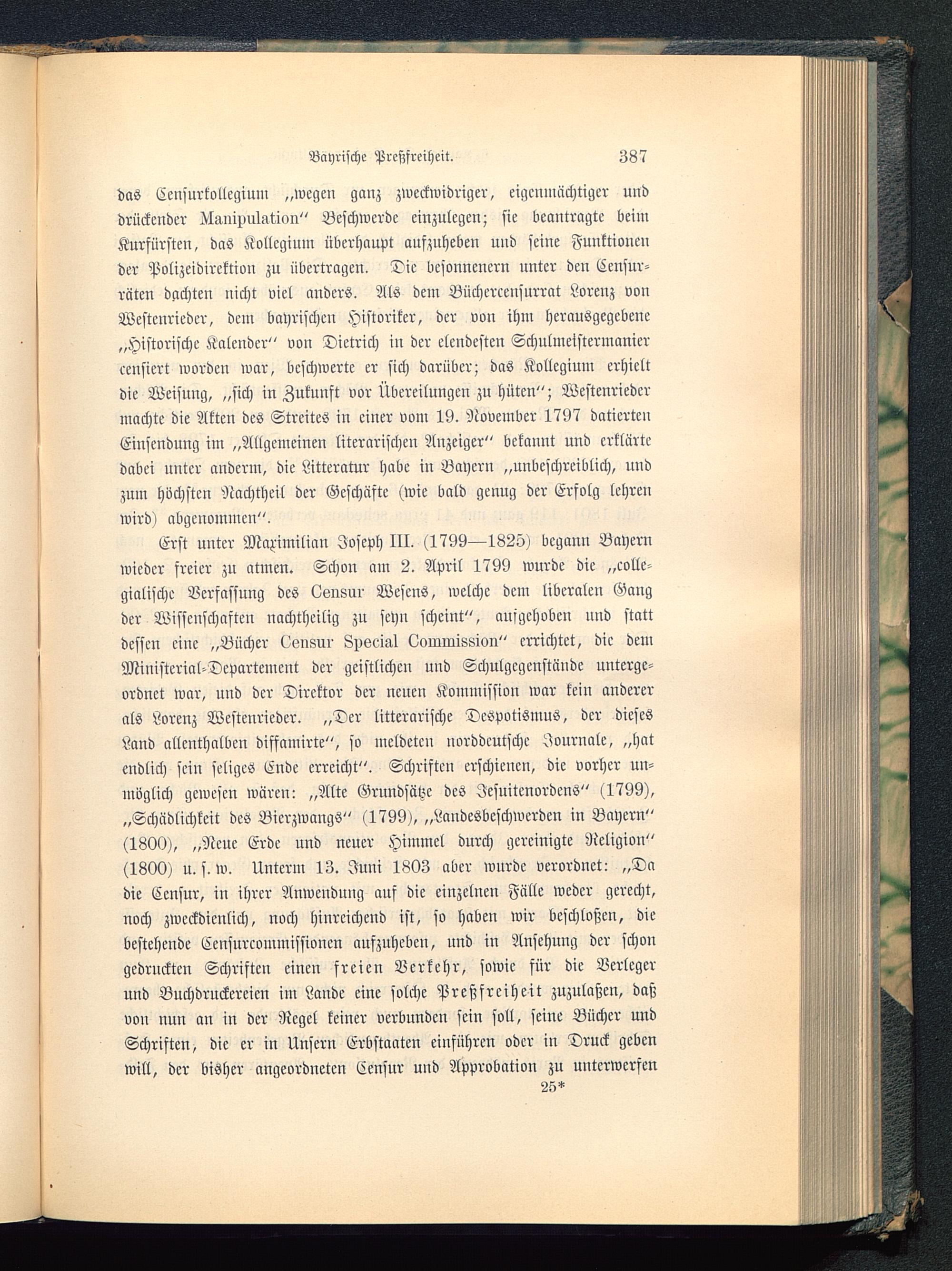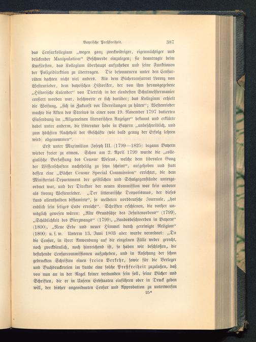 Erst unter Maximilian Joseph III. (1799—1825) begann Bayern wieder freier zu atmen. Schon am 2. April 1799 wurde die „colle-gialischc Verfassung des (üensur Wesens, welche dem liberalen Gangder Wissenschaften nachtheilig zu seyn scheint", ausgehoben und stattdessen eine „Bücher (^iznsur Lpevial Loinmission" errichtet, die demMinisterial-Departemeut der geistlichen und Schulgcgenständc unterge-ordnet war, und der Direktor der neuen Kommission war kein andererals Lorenz Westcnrieder. „Der litterarische Despotismus, der diesesLand allenthalben diffamirte", so meldeten norddeutsche Journale, „hatendlich sein seliges Ende erreicht". Schriften erschienen, die vorher un-möglich gewesen wären: „Alte Grundsätze des Jesuitenordens" (1799),„Schädlichkeit des Bicrzwangs" (1799), „Landesbcschwcrden in Bayern "(1800), „Neue Erdc und neuer Himmel durch gereinigte Religion"(1800) u. s. w. Unterm 13. Juni 1803 aber wurde verordnet: „Dndie Censur, in ihrer Anwendung auf die einzelnen Fälle weder gerecht,noch zweckdienlich, noch hinreichend ist, so haben wir beschloßcn, diebestehende Censurcommissionen aufzuhebcu, und in Ansehung der schongedruckten Schriften einen freien Verkehr, sowie für die Verlegerund Buchdruckereicn im Lande eine solche Preßfreiheit zuzulaßen, daßvon nun an in der Regel keiner verbunden sein soll, seine Bücher undSchriften, die er in Unfern Erbstaaten einführen oder in Druck gebenwill, der bisher angeordneten Censur und Approbation zu unterwerfen