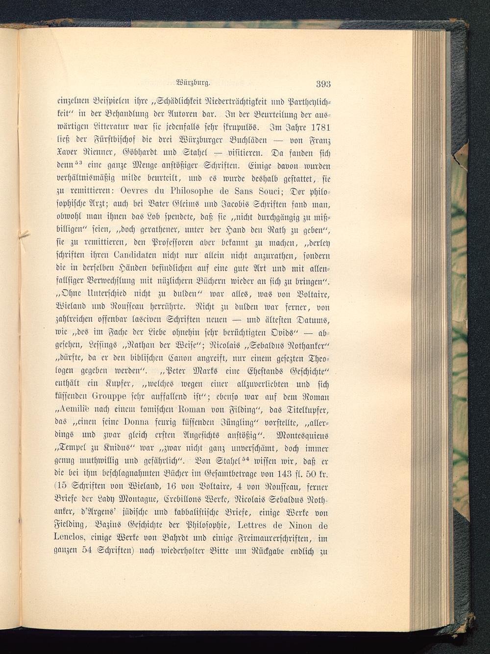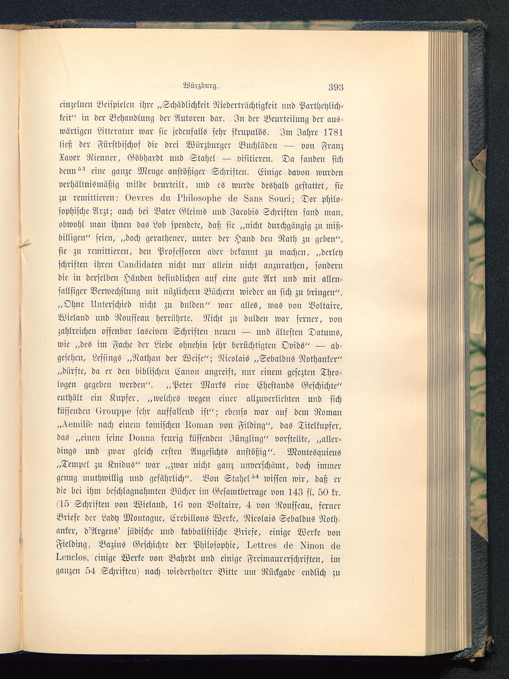 einzelnen Beispielen ihre „Schädlichkeit Niederträchtigkeit und Parthcylich-kcit" in der Behandlung der Autoren dar. In der Beurteilung der aus-wärtigen Litterntur war sie jedenfalls sehr skrupulös. Im Jahre 1781ließ der Fürstbischof die drei Würzburger Buchlädcn — von FranzTcwer Rienuer, Göbhardt und Stahcl — visitieren. Da fanden sichdenn'" eine ganze Menge anstößiger Schriften. Einige davon wurdenverhältnismäßig milde beurteilt, und es wurde deshalb gestattet, sie;u remittieren: Osvrss cln ?I>ilu8opI>s de Laus Louei- Der philo-sophische Arzt; auch bei Vater Gleims und Jacobis Schriften fand man,obwohl man ihnen das Lob spendete, daß sie „nicht durchgängig zn miß-billigen" seien, „doch gerathcner, unter der Hand den Rath zn geben",sie zu remittieren, den Professoren aber bekannt zu machen, „dcrlcyschriften ihren ^umlnIlUen nicht nur allein nicht anzurathcn, sonderudie in derselben Händen befindlichen auf eine gute Art und mit allen-fnllsiger Verwechslung mit nüzlichern Büchern wieder an sich zu bringen".„Ohne Unterschied nicht zu dulden" war alles, was von Voltaire ,Wieland und Rousseau herrührte. Nicht zu duldeu war serner, vonzahlreichen offenbar laöeivcn Schriften neuen — und ältesten Datums,wie „des im Fache der Liebe ohnehin sehr berüchtigten Ovids" — ab-gesehen, LcssingS „Nathan der Weise"; Nicolais „SebaldnS Nothanter"„dürfte, da er den biblischen Canon angreift, nur ciucm gescztcn Theo-logen gegeben werden". „Peter Marks eine Ehestands Geschichte"enthält ein Kupfer, „welches wegen einer allzuvcrlicbtcn und sichküssenden (irnuWö sehr auffallend ist"; ebenso war auf dem Roman„^.emili'ö nach einem komischen lionmn von Filding", das Titcltupfer,das „eine» seine Ocimm fcnrig küssenden Jüngling" vorstellte, „aller-dings und zwar gleich ersten Angesichts anstößig". Montcsquieus„Tempel zu Knidus" war „zwar nicht ganz unverschämt, doch immergenug muthwillig und gefährlich". Von Stahes wissen wir, daß erdie bei ihm beschlagnahmten Bücher im Gesamtbeträge von 143 fl. 50 kr.(15 Schriften von Wicland, 16 von Voltaire, 4 von Rousseau , fernerBriefe der Lndy Moutaguc, Ercbillons Werke, Nicolais Sebaldus Noth-antcr, d'Argcns' jüdische und kabbalistische Briese, einige Werke vonFiclding, Bazins Geschichte der Philosophie, I^ettrss cls Milien clsIxmclos, einige Werke von Bahrdt und einige Freinmurerschriften, imganzen 54 Schriften) nach wiederholter Bitte nm Rückgabe endlich zu