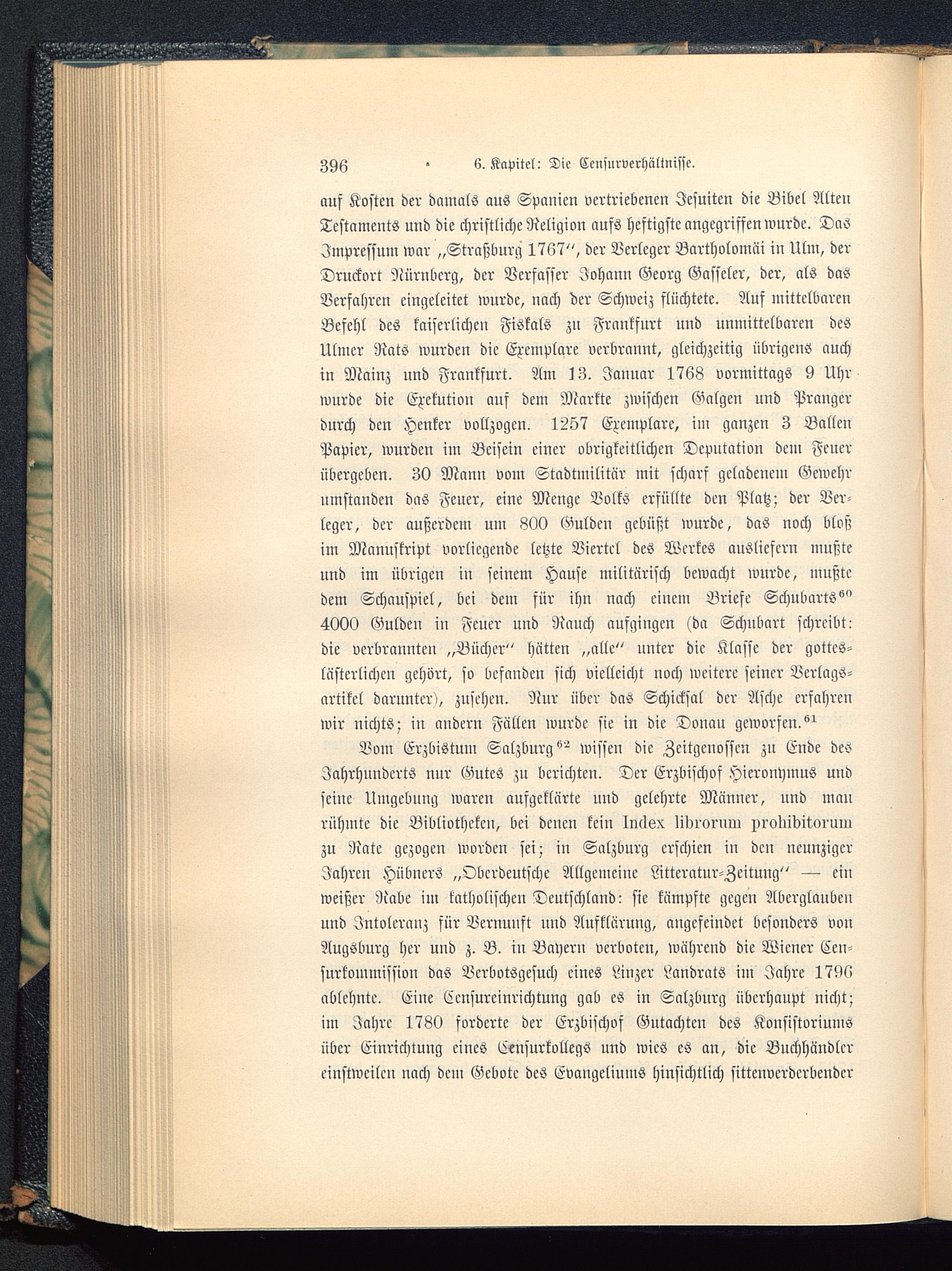 auf Kosten der damals aus Spanien vertriebenen Jesuiten die Bibel AltenTestaments und die christliche Religion aufs heftigste angegriffen wurde. DasImpressum war „Straßburg 1767", der Verleger Bartholomäi in Ulm , derDruckort Nürnberg , der Verfasser Johann Georg Gasseler, der, als dasVerfahren eingeleitet wurde, nach der Schweiz flüchtete. Auf mittelbarenBefehl des kaiserlichen Fiskals zu Frankfurt und unmittelbaren desUlmcr Rats wurden dic Exemplare verbrannt, gleichzeitig übrigens auchin Mainz und Frankfurt . Am 13. Januar 1768 vormittags 9 Uhrwurde die Exekution auf dem Markte zwischen Galgen und Prangerdurch den Henker vollzogen. 1257 Exemplare, im ganzen 3 BallenPapier, wurden im Beisein einer obrigkeitlichen Deputation dem Feuerübergeben. 30 Mann vom Stadtmilitär mit schars geladenem Gewehrumstanden das Feuer, eine Menge Volks erfüllte den Platz; der Ver-leger, der außerdem um 800 Gulden gebüßt wurde, das noch bloßim Manuskript vorliegende letzte Viertel des Werkes ausliefern mußteund im übrigen in seiuem Hause militärisch bewacht wurde, mußtedem Schauspiel, bei dem für ihn nach einem Briefe Schnbarts^"4000 Gulden in Feuer und Rauch aufgingen (da Schubart schreibt:die verbrannten „Bücher" hätten „alle" unter dic Klasse der gottes-lästerlichen gehört, so befanden sich vielleicht noch weitere seiner Bcrlags-artikel darunter», znschcn. Nnr übcr das Schicksal der Aschc erfahrenwir nichts; in andern Fällen wurde sie in die Donau geworfen.^