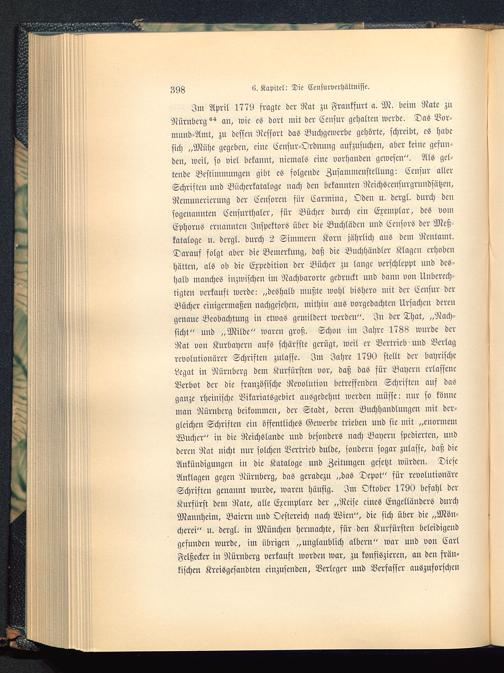 Im April 1779 fragte der Rat zu Frankfurt a. M. beim Rate zuNürnberg ^ an, wie es dort mit der Censur gehalten werde. Das Vor-mund-Amt, zu dessen Ressort das Buchgewerbe gehörte, schreibt, es habesich „Mühe gegeben, eine Censur-Ordnung aufzusuchen, aber keine gefun-den, weil, so viel bekannt, niemals eine vorhanden gewesen". Als gel-tende Bestimmungen gibt es folgende Zusammenstellung: Censur alterSchriften und Bücherkataloge nach den bekannten Rcichscensurgrundsätzen,Remunericrung der Censoren für Carmina, Oden u. dergl. durch densogenannten Censurthaler, für Bücher durch ein Exemplar, des vomEphorus ernannten Inspektors über die Buchlädcn und Ccusors der Meß-kataloge u. dergl. durch 2 Simmcrn Korn jährlich aus dem Rentamt.Darauf folgt aber die Bemerkung, daß die Buchhändler Klagen erhobenhätten, als ob die Expedition der Bücher zu lange verschleppt und des-halb manches inzwischen im Nachbarorte gedruckt und dann von Unberech-tigten verkauft werde: „deshalb mußte wohl bishero mit der Censur derBücher einigermaßen nachgesehen, mithin aus vorgcdachtcn Ursachen derengenaue Beobachtung in etwas gemildert werden". In der That, „Nach-sicht" und „Milde" waren groß. Schon im Jahre 1788 wurde derRat von Kurbayern aufs schärfste gerügt, weil er Vertrieb und Verlagrevolutionärer Schriften zulasse. Im Jahre 1790 stellt der bayrischeLegat in Nürnberg dem Kurfürsten vor, daß das für Bayern erlasseneVerbot der die französische Revolution betreffenden Schriften auf dasganze rheinische Vitariatsgcbiet ausgedehnt werden müsse: nur so könneman Nürnberg bcikommen, der Stadt, deren Buchhandlungen mit der-gleichen Schriften ein öffentliches Gewerbe trieben und sie mit „enormemWucher" in die Reichslande und besonders nach Bayern spedierten, undderen Rat nicht nur solchen Vertrieb dulde, sondern sogar zulasse, daß dieAnkündigungen in die Kataloge und Zeitungen gesetzt würden. DieseAnklagen gegen Nürnberg , das geradezu „das Depot" für revolutionäreSchriften genannt wurde, waren häufig. Im Oktober 1790 befahl derKurfürst dem Rate, alle Exemplare der „Reise eines Engelländers durchMannheim, Baiern und Oestereich nach Wien ", die sich über die „Mön-cherei" u. dergl. in München hermachte, für den Kurfürsten beleidigendgefunden wurde, im übrigen „unglaublich albern" war und von CarlFclßecker in Nürnberg verkauft worden war, zu konfiszieren, an den frän-kischen Kreisgesandten einzusenden, Verleger und Verfasser auszuforschen