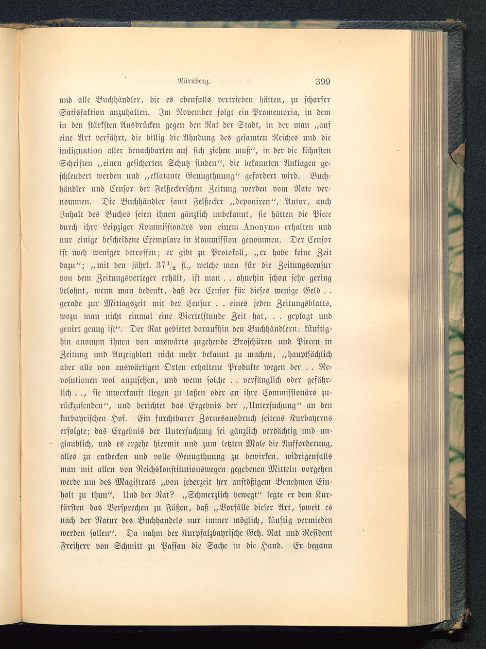 und allc Buchhändler, dic es ebenfalls vertrieben Hütten, zu scharferSatisfaktion anzuhalten. Im November folgt ein Promeinoria, in demin den stärksten Ausdrücken gegen den Rat der Stadt, in der man „aufeine Art verfährt, die billig dic Ahndung des gesamten Reiches und dicmäiMgUoii aller benachbarten auf sich ziehen muß", in der dic kühnstenSchrifien „einen gesicherten Schutz finden", die bekannten Anklagen ge-schleudert werden und „eklatante Genugthuung" gefordert wird. Buch-händler und Censor der Felßeckerschm Zeitung werden vom Rate ver-nommen. Die Buchhändler samt Felßecker „depouircn", Autor, auchInhalt des Buches seien ihnen gänzlich unbekannt, sie hätten dic Piecedurch ihre Leipziger Kommissionärs von einem ^.nonxino erhalten undnur einige bescheidene Exemplare in Kommission genommen. Der Eensorist noch weniger betroffen; er gibt zu Protokoll, „er habe keine Zeitdazu"; „mit deu jährl. 37^ fl., welche man für die Zeitungscensurvon dem Zeitungsverleger erhält, ist man. . ohnehin schon sehr geringbelohnt, wenn man bedenkt, daß der Censor für dieses wenige Geld. .gerade zur Mittagszeit mit der Censur . . eines jeden Zcitungsblattö,wozu man nicht einmal eine Viertelstunde Zeit hat, . . geplagt undgcnirt genug ist". Der Rat gebietet daraufhin den Buchhändlern: künftig-hin anonym ihnen von auswärts zugehende Broschüren und Pieccn inZeitung und Anzeigblatt nicht mehr bekannt zu machen, „hauptsächlichaber alle von auswärtigen Orten erhaltene Produkte wegen der . . Re-volutionen wol anzusehen, und wenn solche , . verfänglich oder gefähr-lich . ., sie unverkauft liegen zu laßen oder an ihre Commissionärs zu-rückzusenden", uud berichtet das Ergebnis der „Untersuchung" an denkurbayrischeu Hof. Ein furchtbarer Zornesausbruch seitens KurbaycrnSerfolgte; das Ergebnis der Untersuchung sei gänzlich verdächtig uud un-glaublich, und es ergehe hiermit und zum letzten Male die Aufforderung,alles zu entdecken und volle Geuugthuung zu bewirken, widrigenfallsman mit allen von Reichskonstitutiouswcgen gegebenen Mitteln vorgehenwerde um des Magistrats „von jederzeit her anstößigem Benehmen Ein-halt zu thun". Uud der Rat? „Schmerzlich bewegt" legte er dem Kur-fürsten das Versprechen zu Füßen, daß „Vorfälle dieser Art, soweit esnach der Natur des Buchhandels nur immer möglich, künftig vermiedenwerden sollen". Da nahm der Kurpfalzbayrischc Geh. Rat und ResidentFreiherr von Schmitt zu Passau die Sache in dic Hand. Er begann
