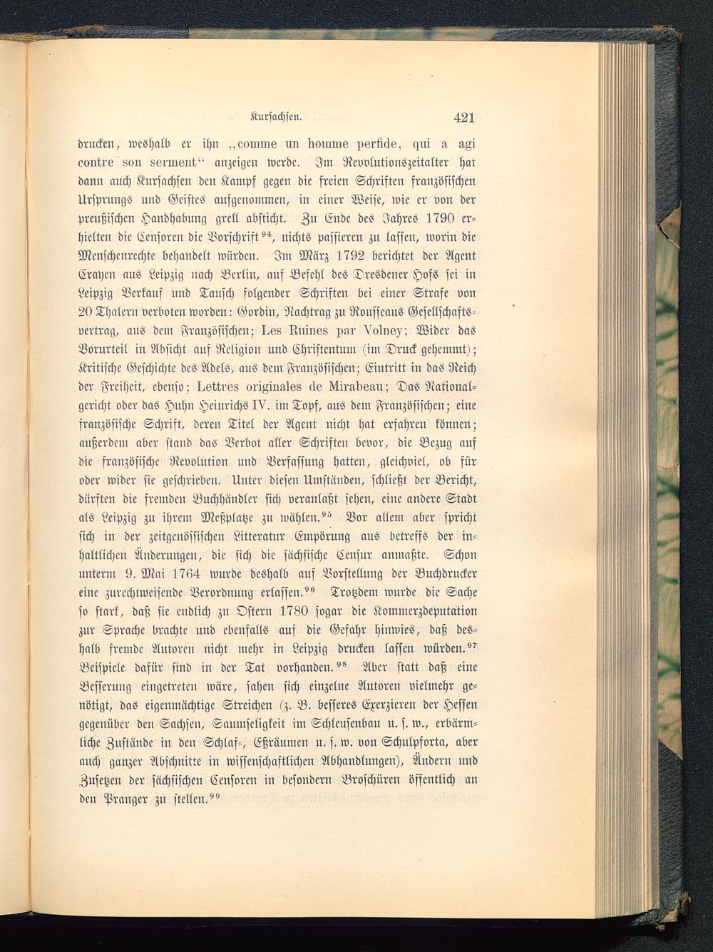 drucken, weshalb er ihn .,eoinms un Komme vörtids, qni aeont-re son sm'insiit" anzeigen werde. In? Revvlutionszeitalter hatdann auch Kursachsen den Kampf gegen die freien Schriften französischenUrsprungs und Geistes aufgenommen, in einer Weise, wie er von derpreußischen Handhabung grell absticht. Zu Ende des Jahres 1790 er-hielten die Censoren die Vorschrift^, nichts passieren zu lassen, worin dieMenschenrechte behandelt würden. Im März 1792 berichtet der AgentCrayen aus Leipzig nach Berlin, auf Befehl des Dresdener Hofs sei inLeipzig Verkauf und Tausch folgender Schriften bei einer Strafe von29 Thalern verboten worden: Gordin, Nachtrag zu Rousseaus Gesellschnfts-vertrag, aus dem Französischen; I^vs Ruines pnr Vc»1nö)': Wider dasVorurteil in Absicht auf Religion und Christentum (im Druck gehemmt);Kritische Geschichte des Adels, aus dem Französischen; Eintritt in das Reichder Freiheit, ebenso; Lktti oriMmIss äs Nii'lldeau; Das National-gericht oder das Huhn Heinrichs IV. im Topf, aus dem Französischen; einefranzösische Schrift, deren Titel der Agent nicht hat erfahren können;außerdem aber stand das Verbot aller Schriften bevor, die Bezug aufdie französische Revolution und Verfassung hatten, gleichviel, ob füroder wider sie geschrieben. Unter diesen Umständen, schließt der Bericht,dürften die fremden Buchhändler sich veranlaßt sehen, eine andere Stadtals Leipzig zu ihrem Mcßplatze zu wählen.^' Vor allem aber sprichtsich in der zeitgenössischen Littcratnr Empörung aus betreffs der in-haltlichen Änderungen, die sich die sächsische Eensur anmaßte. Schonunterm 9. Mai 17n4 wurde deshalb auf Vorstellung der Buchdruckereine zurechtweisende Verordnung erlassen.^ Trotzdem wurde die Sacheso stark, daß sie endlich zu Ostern 1780 sogar die Kommcrzdeputationzur Sprache brachte und ebenfalls auf die Gefahr hinwies, daß des-halb fremde Autoren nicht mehr in Leipzig drucken lassen würden.^Beispiele dafür sind in der Tat vorhanden.^ Aber statt daß eineBesserung eingetreten wäre, sahen sich einzelne Autoren vielmehr ge-nötigt, das eigenmächtige Streichen (z. B. besseres Exerzieren der Hessen gegenüber den Sachsen, Saumseligkeit im Schleusenbau u. s. w., erbärm-liche Zustände in den Schlaf-, Eßräumcn u. s. w. von Schulpforta, aberauch ganzer Abschnitte in wissenschaftlichen Abhandlungen), Ändern undZusetzen der sächsischen Censoren in besondern Broschüren öffentlich anden Pranger zu stellen.'"'