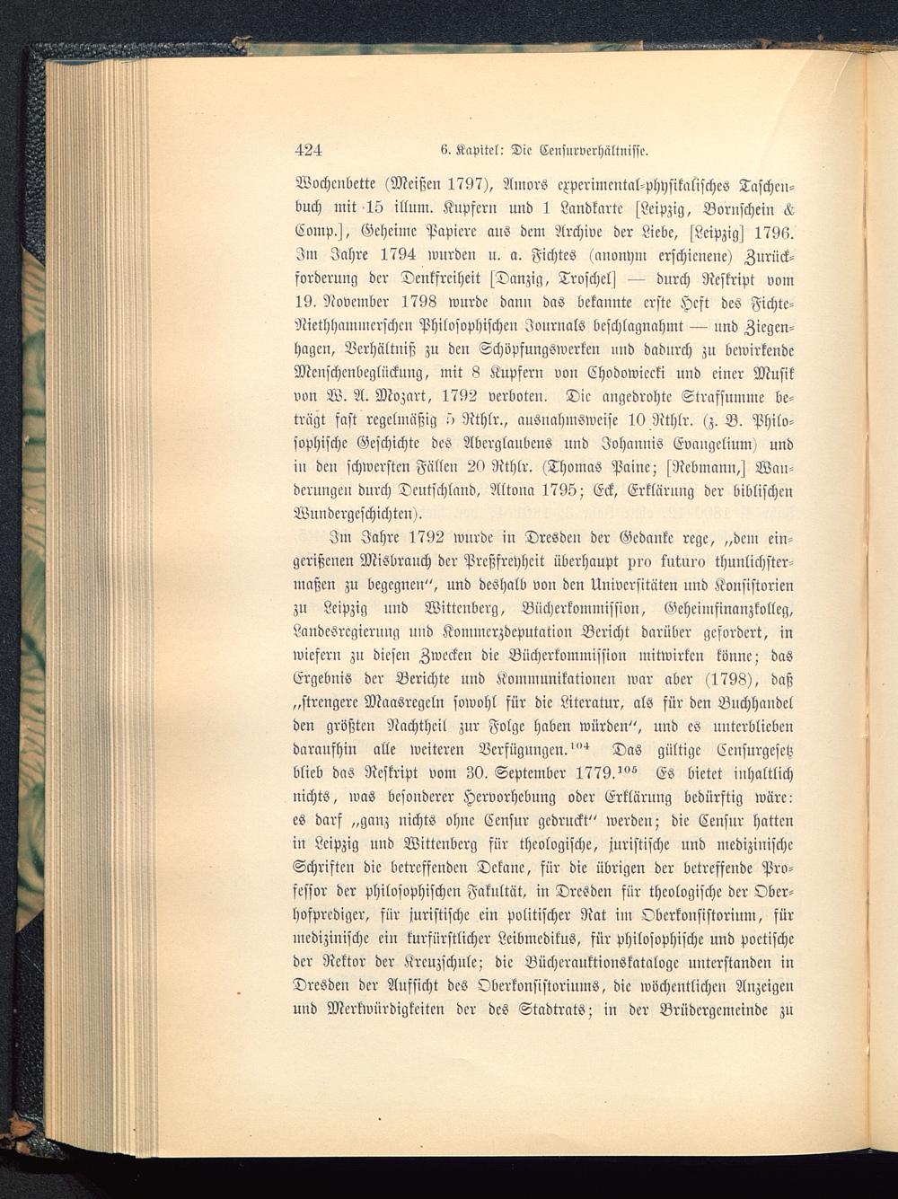Wochenbette (Meißen 1797), Amors cxpcrimental-physitalisches Taschen-buch mit-15 illum. Kupfern und 1 Landkarte s Leipzig , Bornschein KComp.j, Geheime Papiere aus dem Archive der Liebe, fLeipzig^ 17W.Im Jahre 1794 wurden u. a. Fichtes (anonym erschienene) Zurück-forderung der Denkfreiheit fDanzig, Troschels — durch Reskript vom19, November 1798 wurde dann das bekannte erste Heft des Fichte-Niethhnmmcrschcn Philosophischen Journals beschlagnahmt — und Ziegen-hagen, Verhältnis; zu den Schöpfungswcrken und dadurch zu bewirkendeMcnschcnbeglücknng, mit 8 Kupfern von Ehodowiccki und einer Musikvon W. A. Mozart , 1792 verboten. Die angedrohte Strafsumme be-trägt fast regelmäßig 5> Rthlr., ausnahmsweise 10 Rthlr. (z. B. Philo-sophische Geschichte des Aberglaubens und Johannis Evangelium) undiu den schwersten Fällen 29 Rthlr. (Thomas Paine ; fRcbmann,j Wan-derungen durch Deutschland, Altona 1795; Eck, Erklärnng der biblischenWundcrgcschichten).